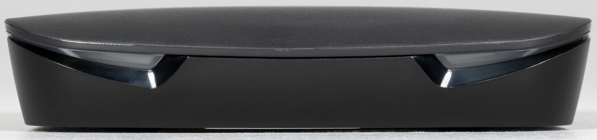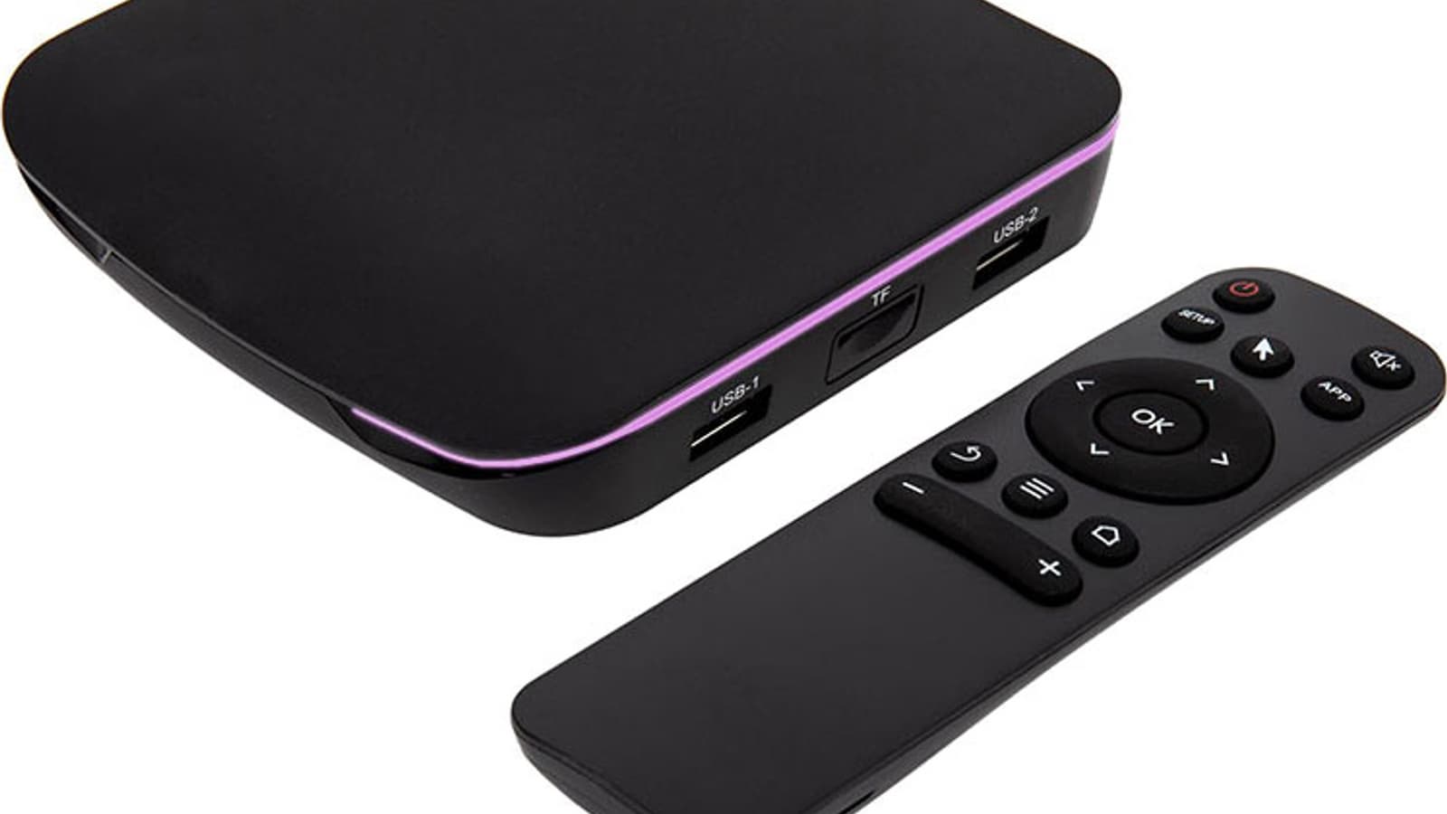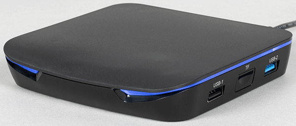 Такой дизайн стал привычным в сфере потребительского мультимедийного рынка ТВ-приставок: сплющенная коробочка с разными вариациями форм и иногда стильной подсветкой. Такая подсветка имеется и в рассматриваемом устройстве. Цвет ее меняется с фиолетового на голубой в зависимости от режима работы.