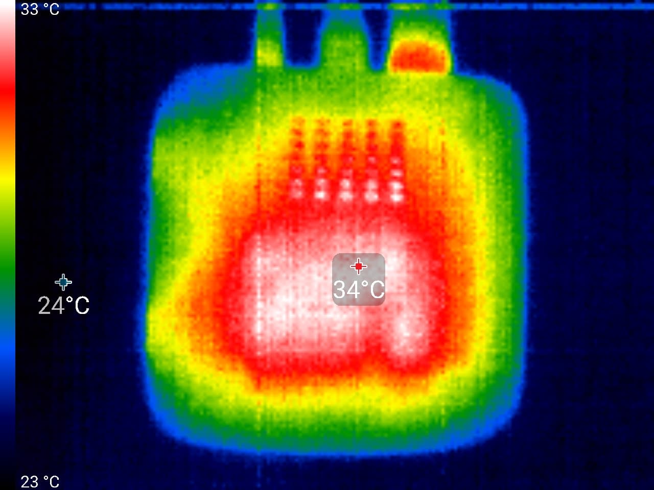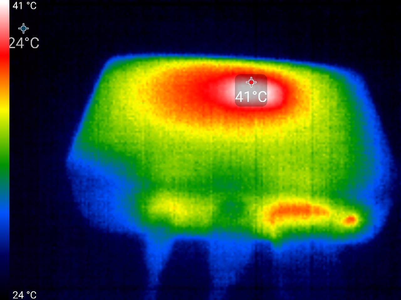 Впрочем, постойте. Один из факторов стабильности и надежности — это температурная характеристика устройства. Если прибор нагревается, как утюг — скорее всего, долго он не протянет. Ведь он же не утюг. Следующие теплоснимки сделаны после нескольких часов воспроизведения 4K-видео с сетевого хранилища посредством проводной сети. Тестирование проводилось при комнатной температуре около 25 °C.