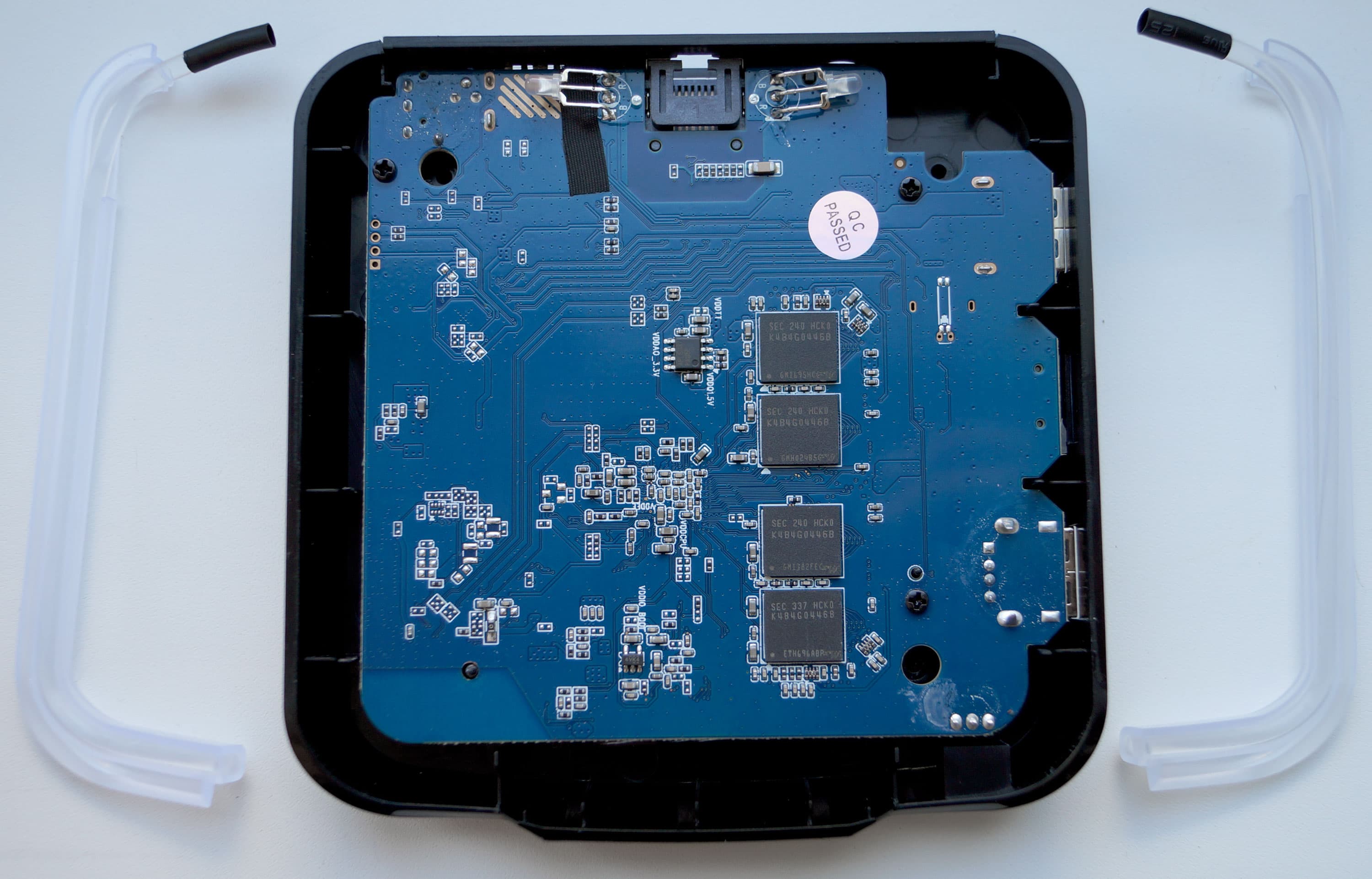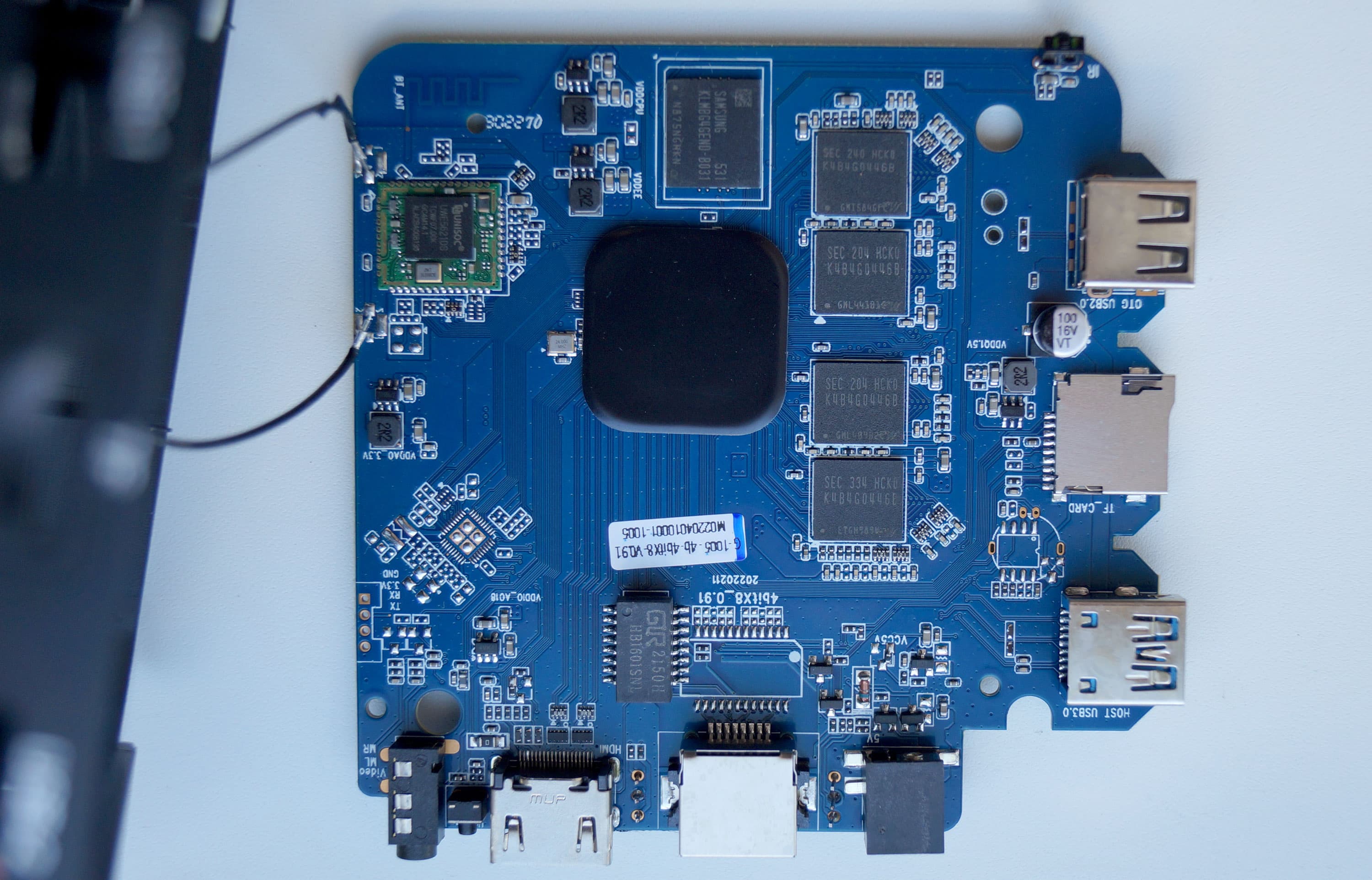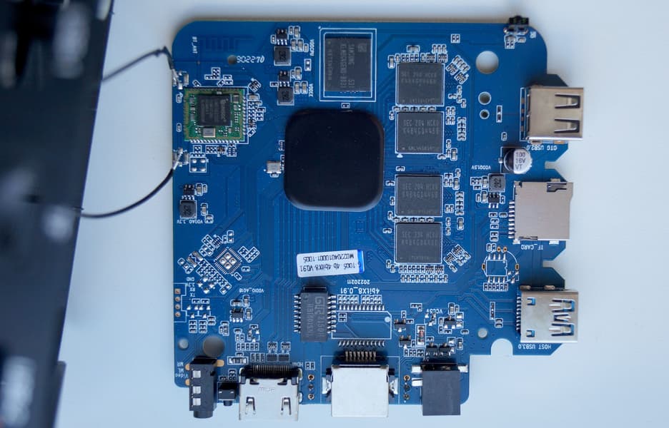 Печатная плата занимает весь объем плеера, здесь можно видеть блоки памяти DDR3 (Samsung K4B4G0446B), а сердце плеера, процессор, накрыт черной крышечкой. Отдирать мы ее не стали. Зачем?