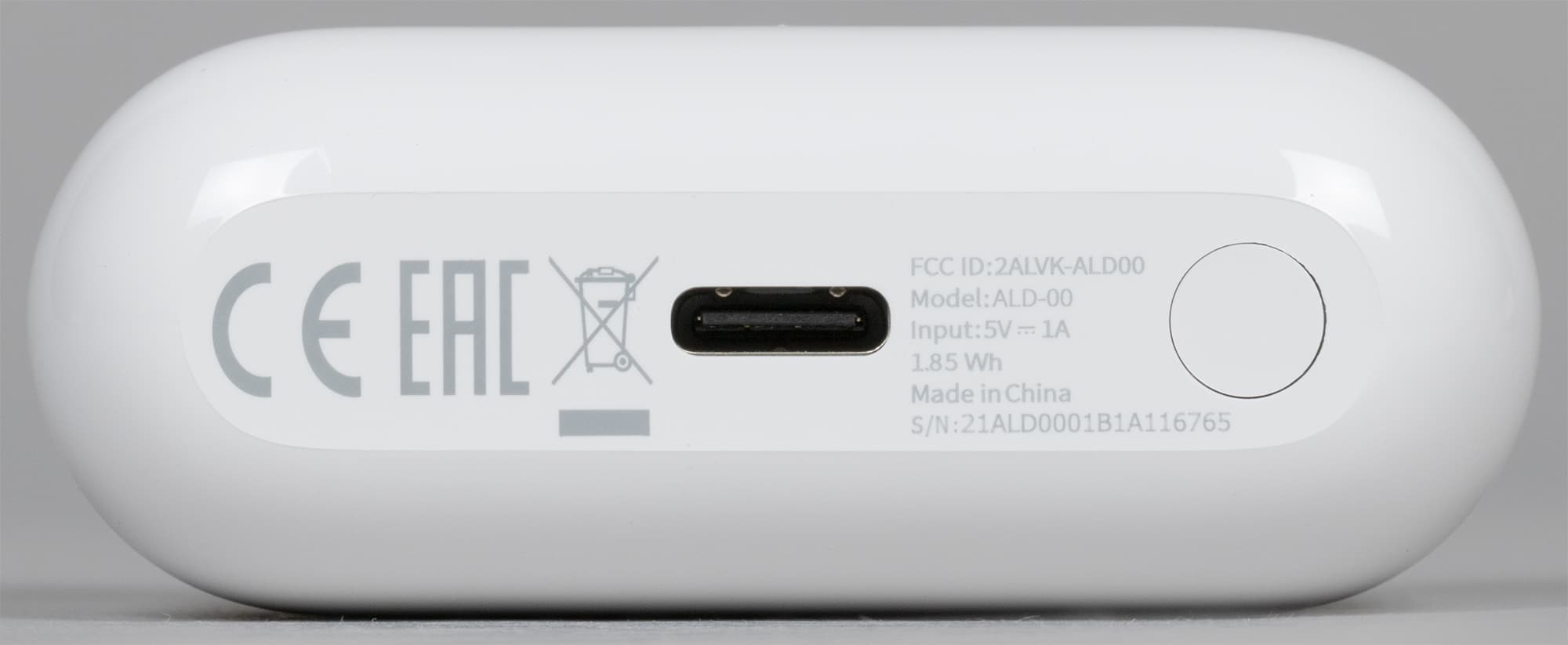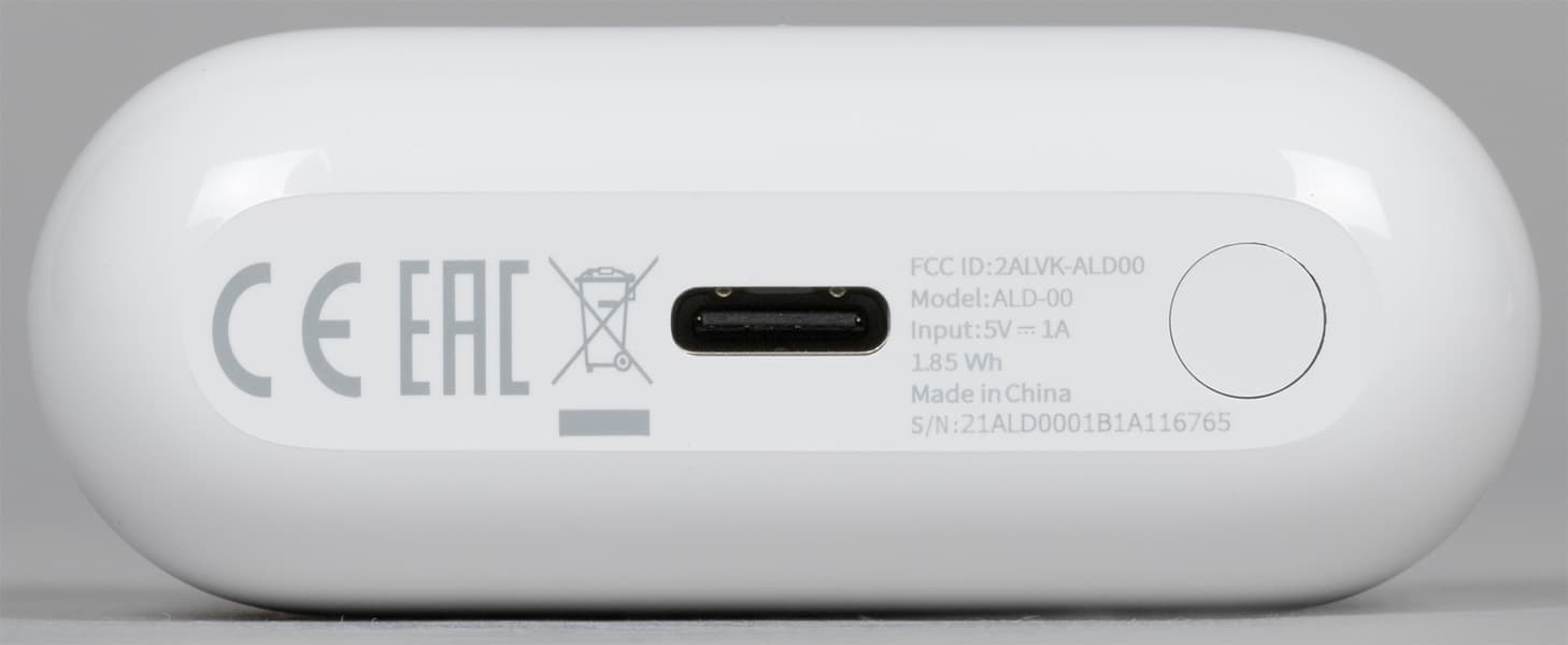 На дне размещены порт USB Type C для зарядки, а также краткая информация об устройстве и кнопка, длительное нажатие на которую приводит к запуску Bluetooth-сопряжения.