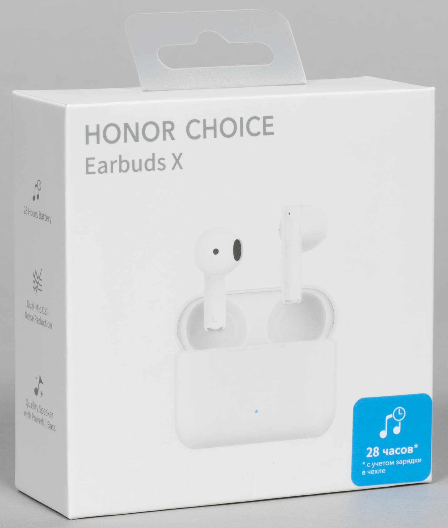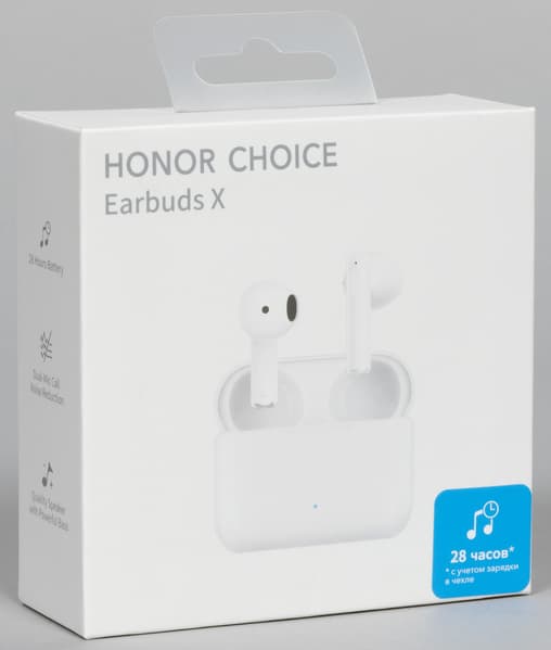 Поставляется Honor Choice Earbuds X в традиционной для бренда картонной коробке со съемной крышкой, на которую нанесены изображение и краткие характеристики устройства. Про 28 часов автономности с учетом зарядки от кейса пользователю сообщает яркая голубая наклейка в правом нижнем углу крышки.