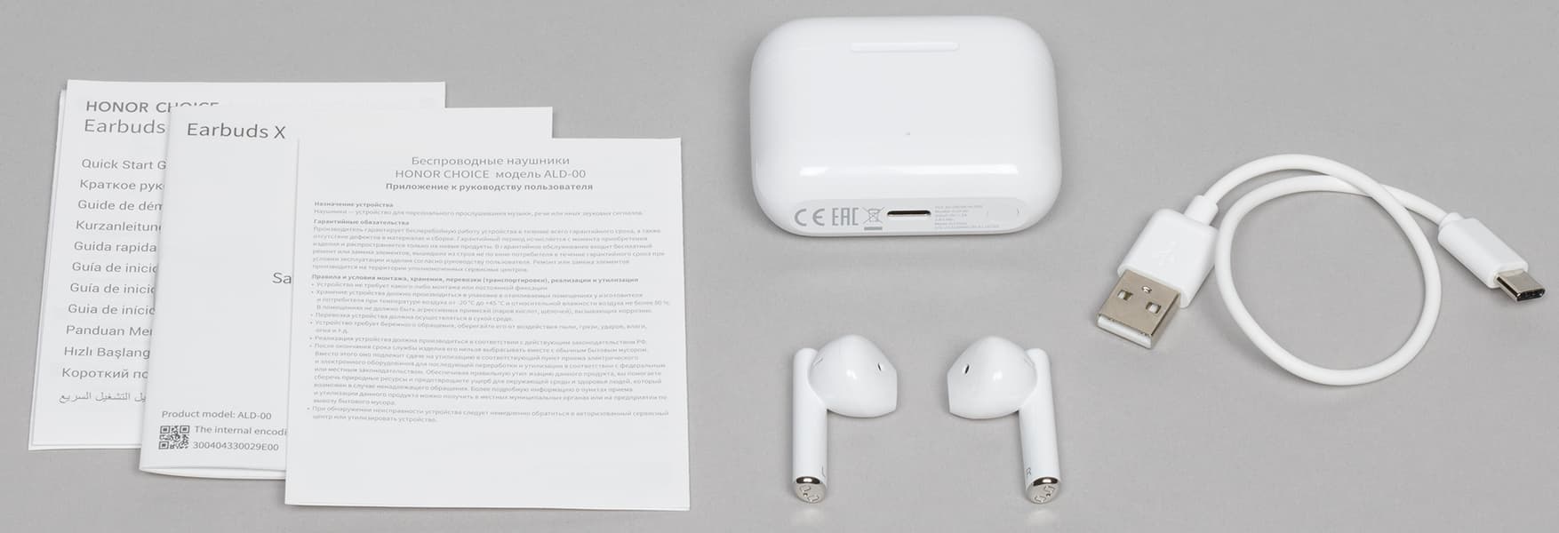 В комплект поставки входят документация и гарантийный талон, сами наушники, футляр для зарядки и переноски, а также кабель USB-A — USB-C длиной 20 см.