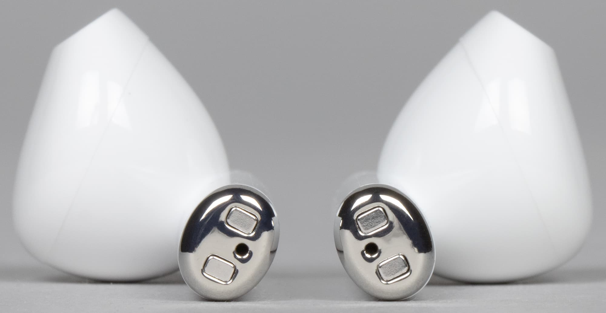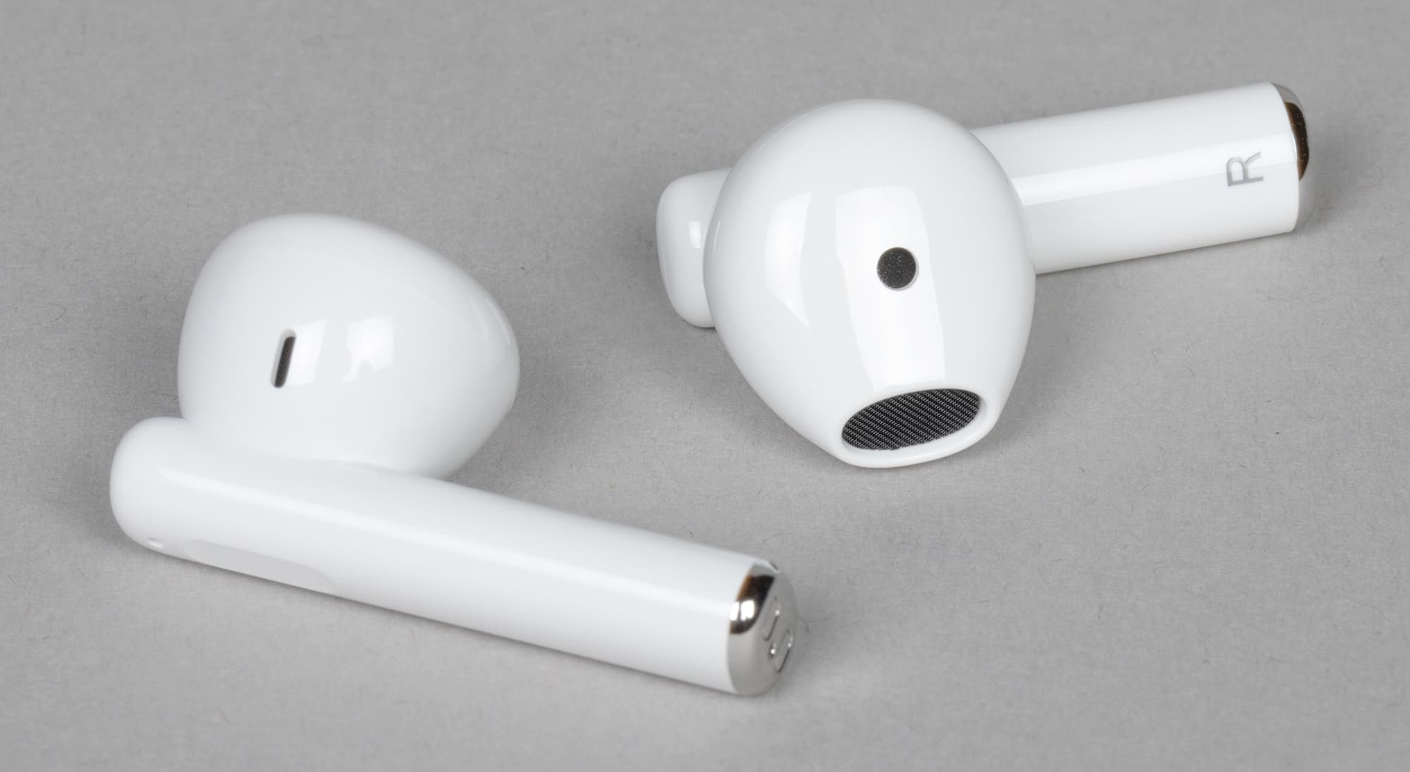 В нижней части «ножки» наушников расположена металлическая накладка. На ней размещены контакты для зарядки, она же — по сути единственный декоративный элемент на корпусе.