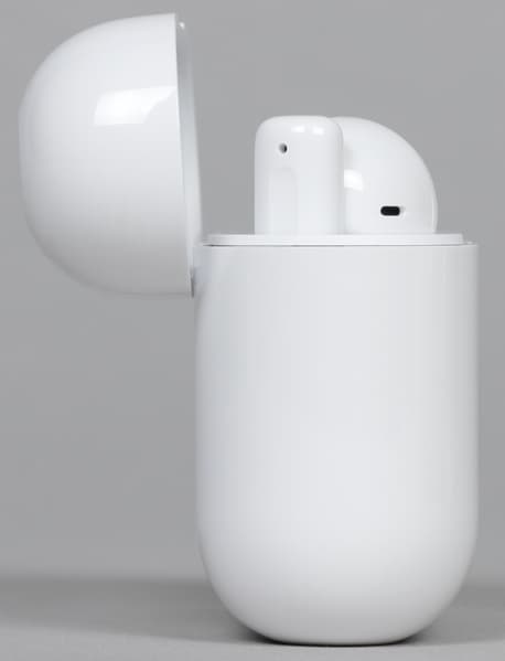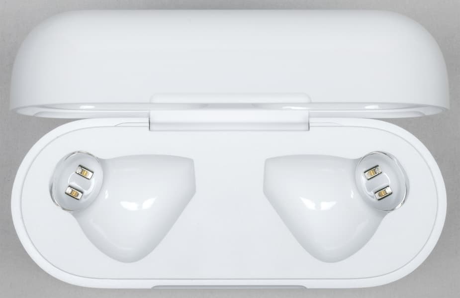 В отверстиях под «палочки» наушников видны контакты для зарядки. Распространенное, но не самое удачное расположение — очистить их в случае необходимости будет тяжело, но вполне возможно.