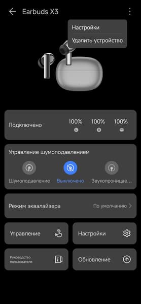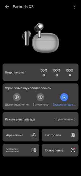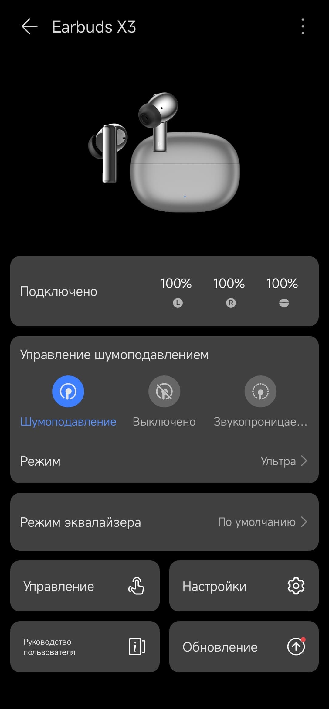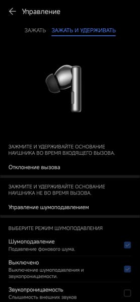 В средней части главной страницы размещена панель управления шумоподавлением. Можно его включить или отключить, а также задействовать режим «звуковой прозрачности», после активации которого внешние звуки с помощью микрофонов транслируются в динамики гарнитуры. Пригождается, когда нужно быстро ответить на вопрос прохожего, услышать объявление в транспорте, ну и так далее. Плюс можно контролировать происходящее вокруг во время прогулки или пробежки, например — тоже полезная опция.