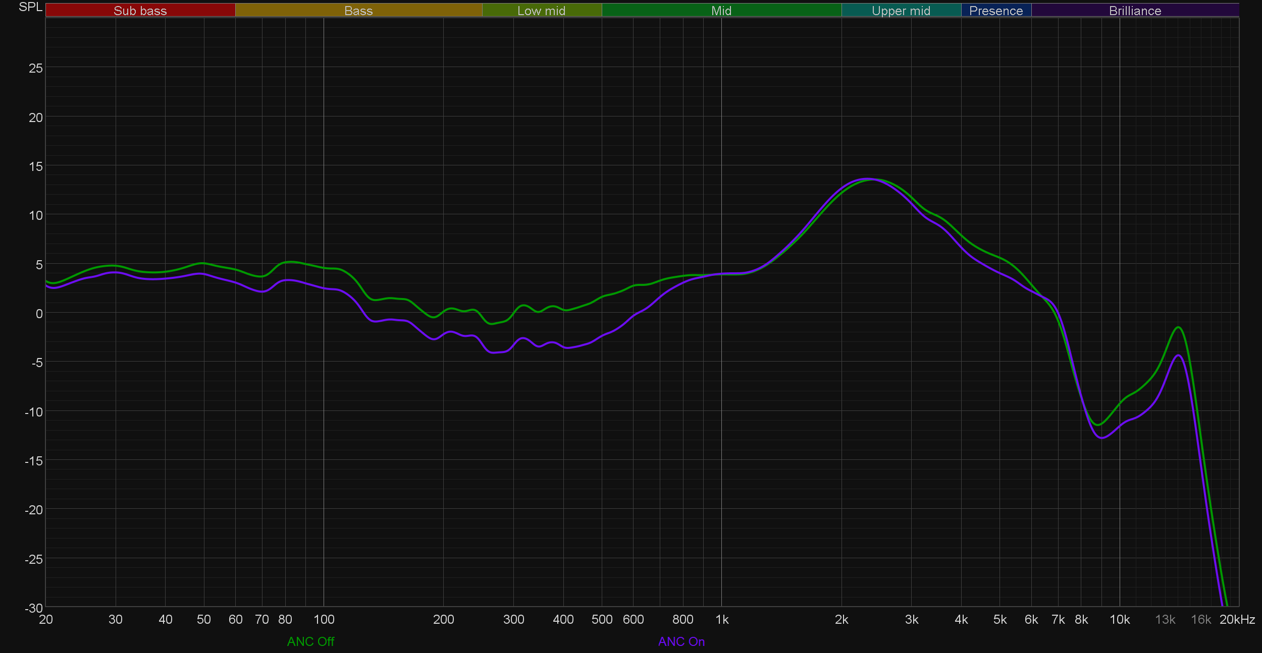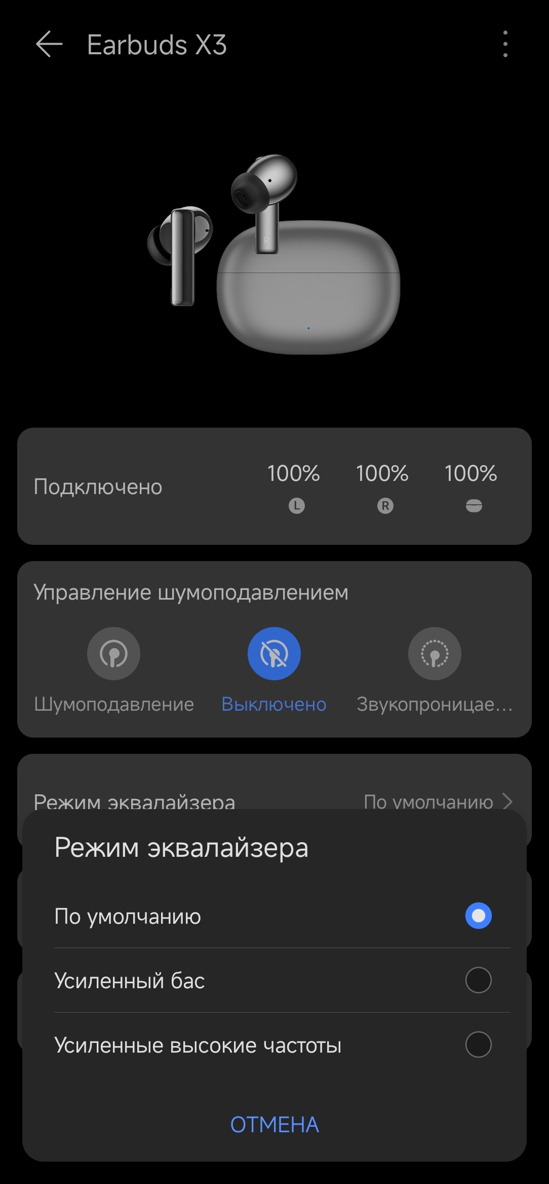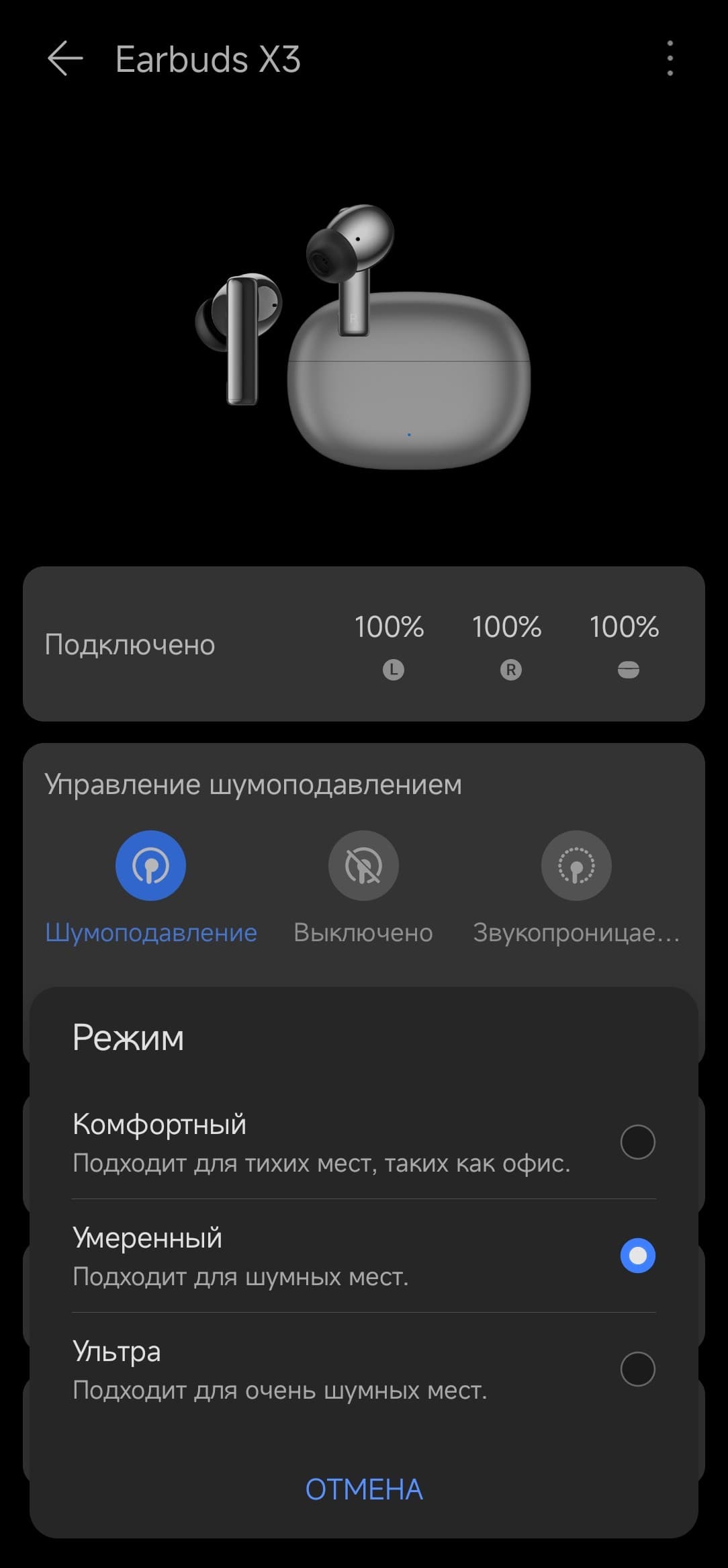 Включение шумоподавления почти всегда сказывается на воспроизведении низких частот — Honor Choice Earbuds X3 не стала исключением из этого правила. При этом «проваливается» не только НЧ-диапазон, но и нижняя середина при сохранении акцента на «глубоком» басе, что приводит к неприятной гулкости звучания. Однако ярко выражен этот эффект только в самом активном режиме работы системы шумоподавления — где-нибудь в метро такие нюансы можно и потерпеть, получив взамен избавление от солидной части шумов.
