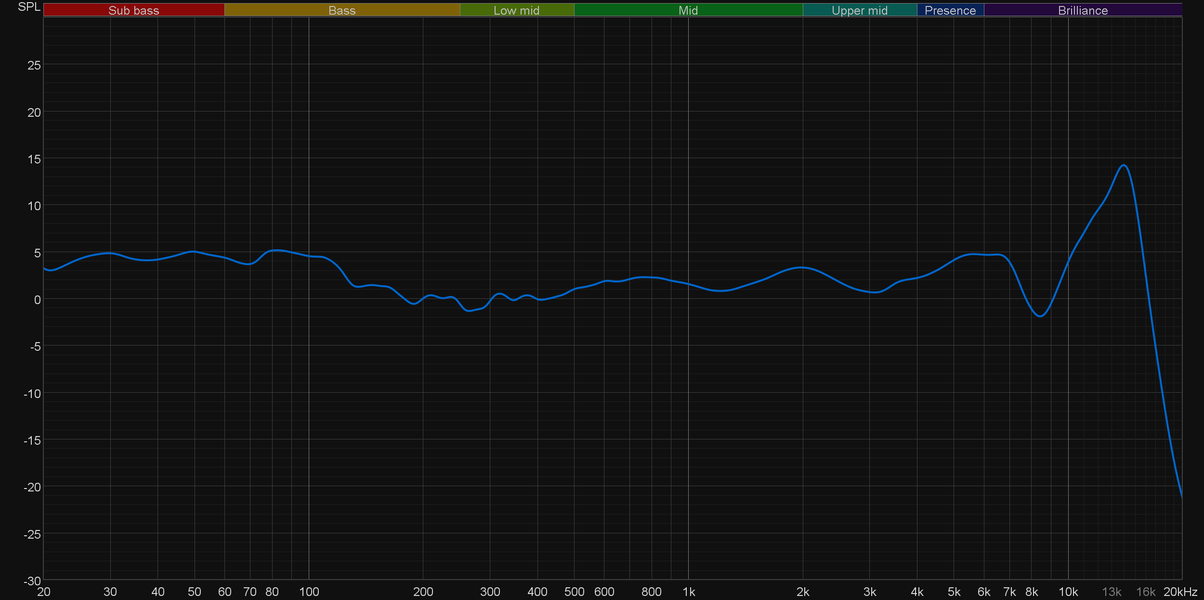 Заметная неравномерность подачи среднечастотного диапазона придает звучанию некоторую окраску, но ухо не раздражает и как дефект не воспринимается. График АЧХ выше показан на фоне кривой IDF (IEM diffuse field compensation), предоставленной производителем используемого стенда. Ее задача — помочь скомпенсировать резонансные явления в имитированном слуховом канале и особенности используемого оборудования, создав «звуковой профиль», максимально корректно иллюстрирующий то, как звучание наушников воспринимается слушателем. Ее можно рассматривать как адаптированный под конкретное устройство аналог так называемой «кривой Хармана», созданной командой Harman International под руководством доктора Шона Олива. Скомпенсируем полученный график АЧХ в соответствии с кривой IDF.