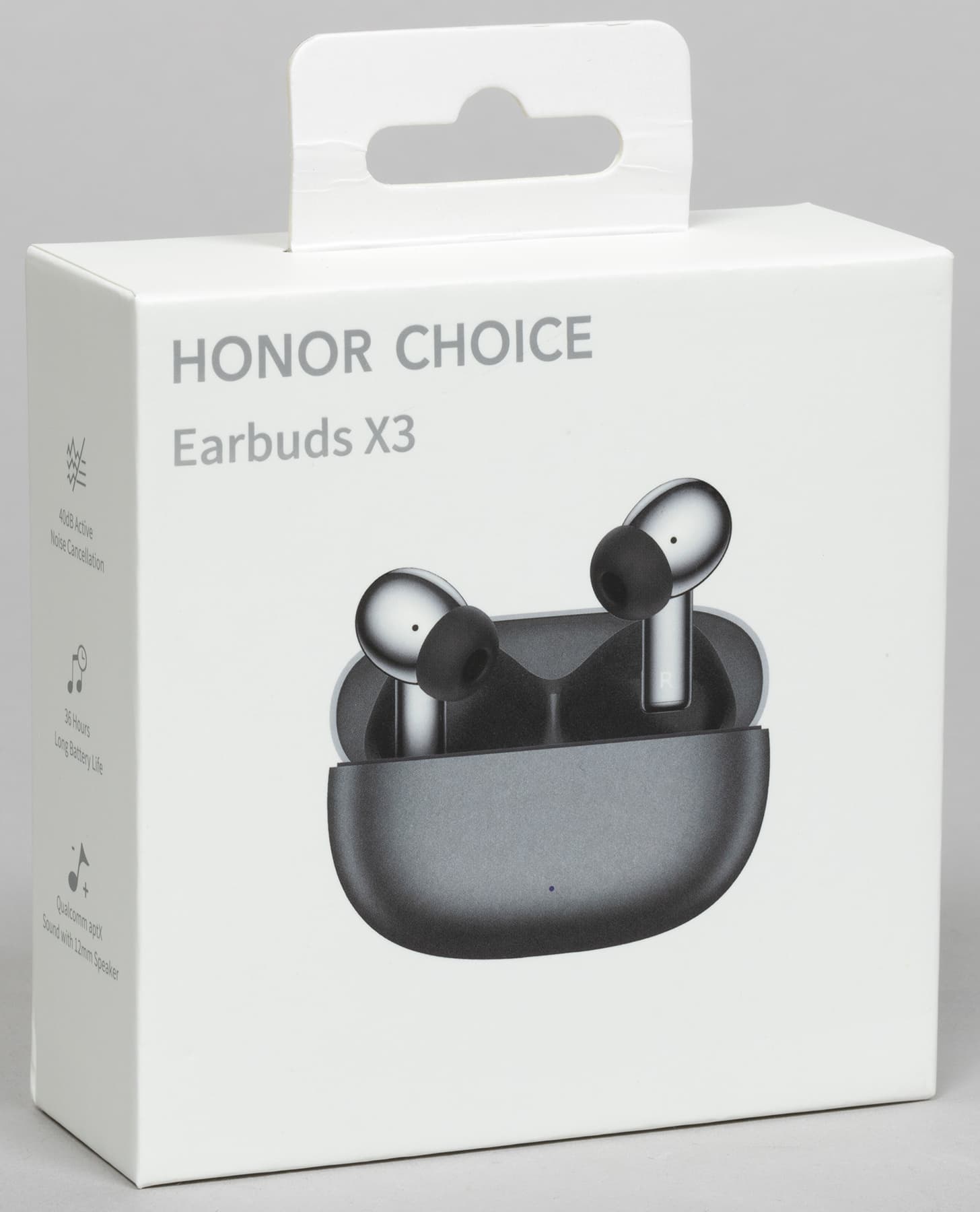 Поставляется Honor Choice Earbuds X3 белой картонной коробке, на которую нанесены изображение и краткие характеристики устройства.