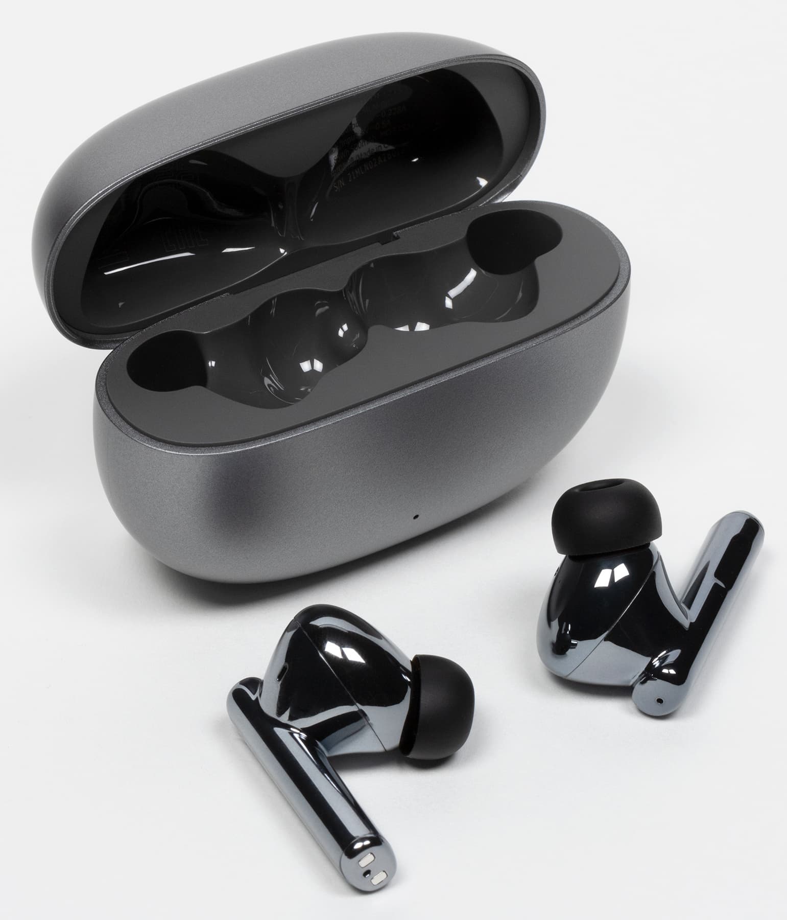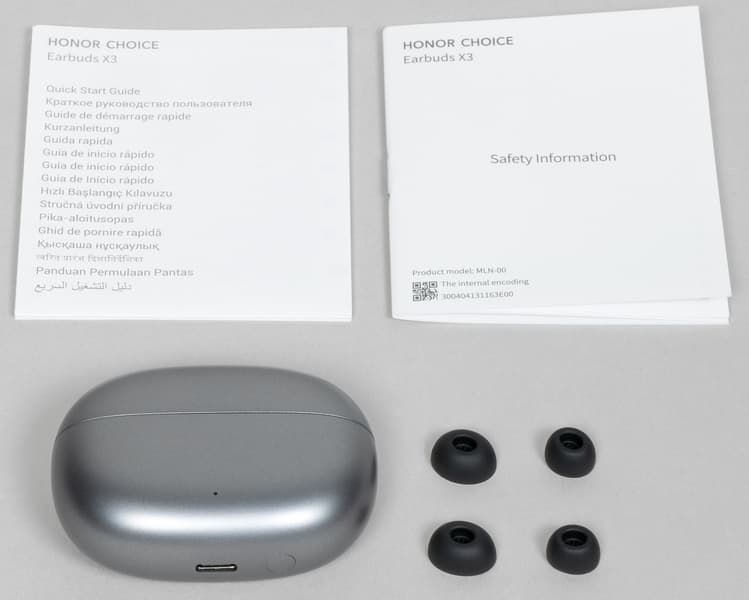 Комплект поставки крайне невелик: наушники в зарядном кейсе, две пары сменных силиконовых насадок (еще одна установлена по умолчанию), да руководство пользователя — вот и всё. Кабеля для зарядки нет. В целом, это даже неплохо, так как очень часто производители кладут в комплект коротенький кабель из разряда «просто чтобы было», который потом все равно приходится менять... Ну а подобрать кабель с разъемом USB Type С — задача далеко не самая сложная, у многих он уже явно имеется.