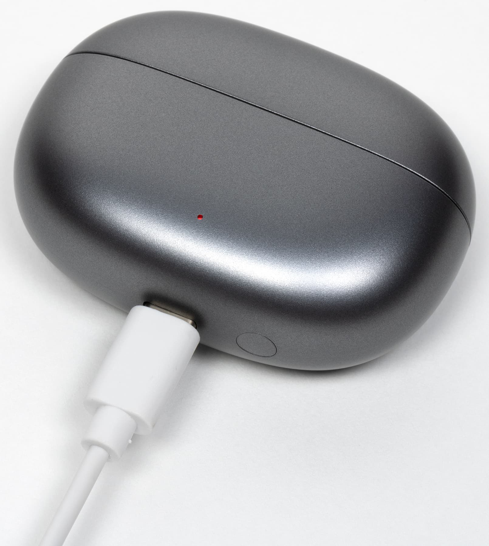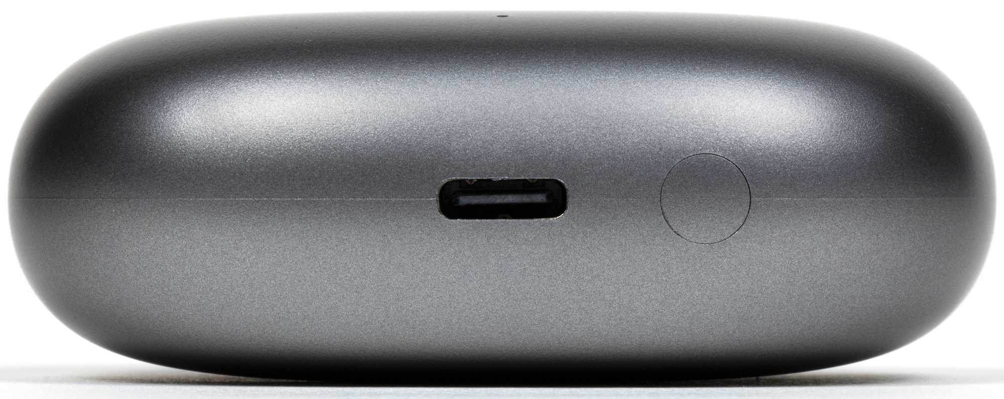 В нижнем торце корпуса чехла размещен порт USB Type С для зарядки. Справа от него виднеется кнопка активации сопряжения, выполненная заподлицо с корпусом во избежание случайного нажатия. Место стыка половинок корпуса хорошо видно в ярком студийном свете, в жизни же гораздо менее заметно.