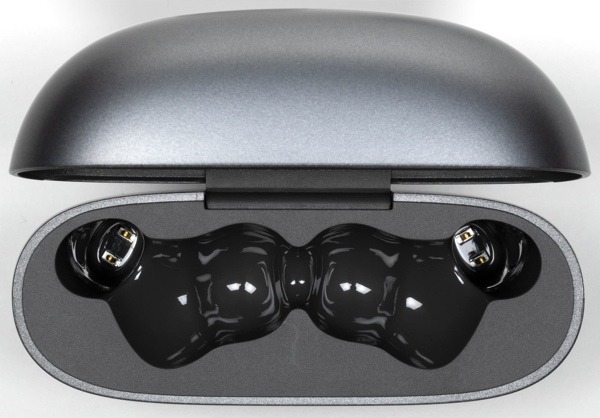 Наушники надежно удерживаются на своих местах с помощью магнитов. Из-за глянцевой поверхности и обтекаемой формы верхней части могут возникнуть небольшие проблемы с изъятием их из кейса — если просто подцепить их пальцами и потянуть вверх, они могут выскользнуть. Зато если сначала сдвинуть наушники на себя, чтобы они «выскочили» из своих слотов, а уже потом тянуть вверх — всё получится просто и легко.