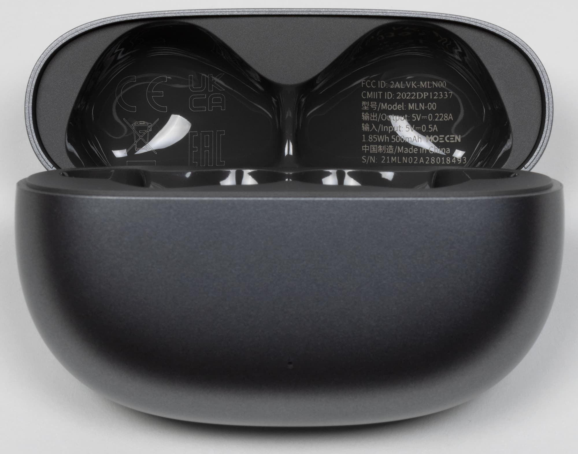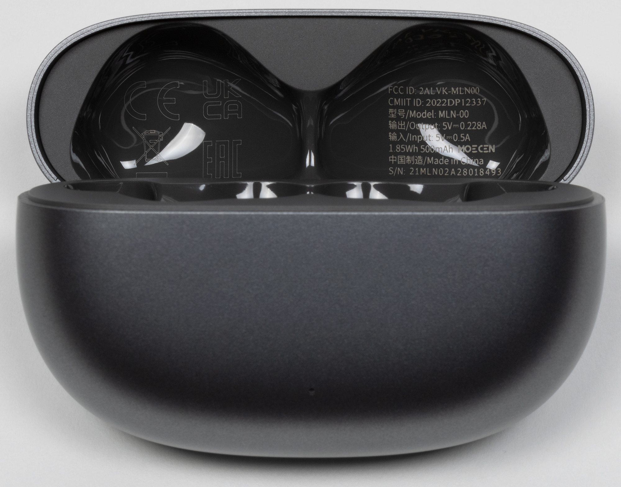 В крышке также есть углубления, обеспечивающие плотное крепление наушников — надо сказать, что срабатывает это отлично: даже если специально трясти кейс с гарнитурой возле уха, не слышно ни звука. На внутреннюю часть этих углублений нанесена служебная информация. А вот на внешней части кейса нет вообще никаких надписей, что явно пошло на пользу его дизайну.