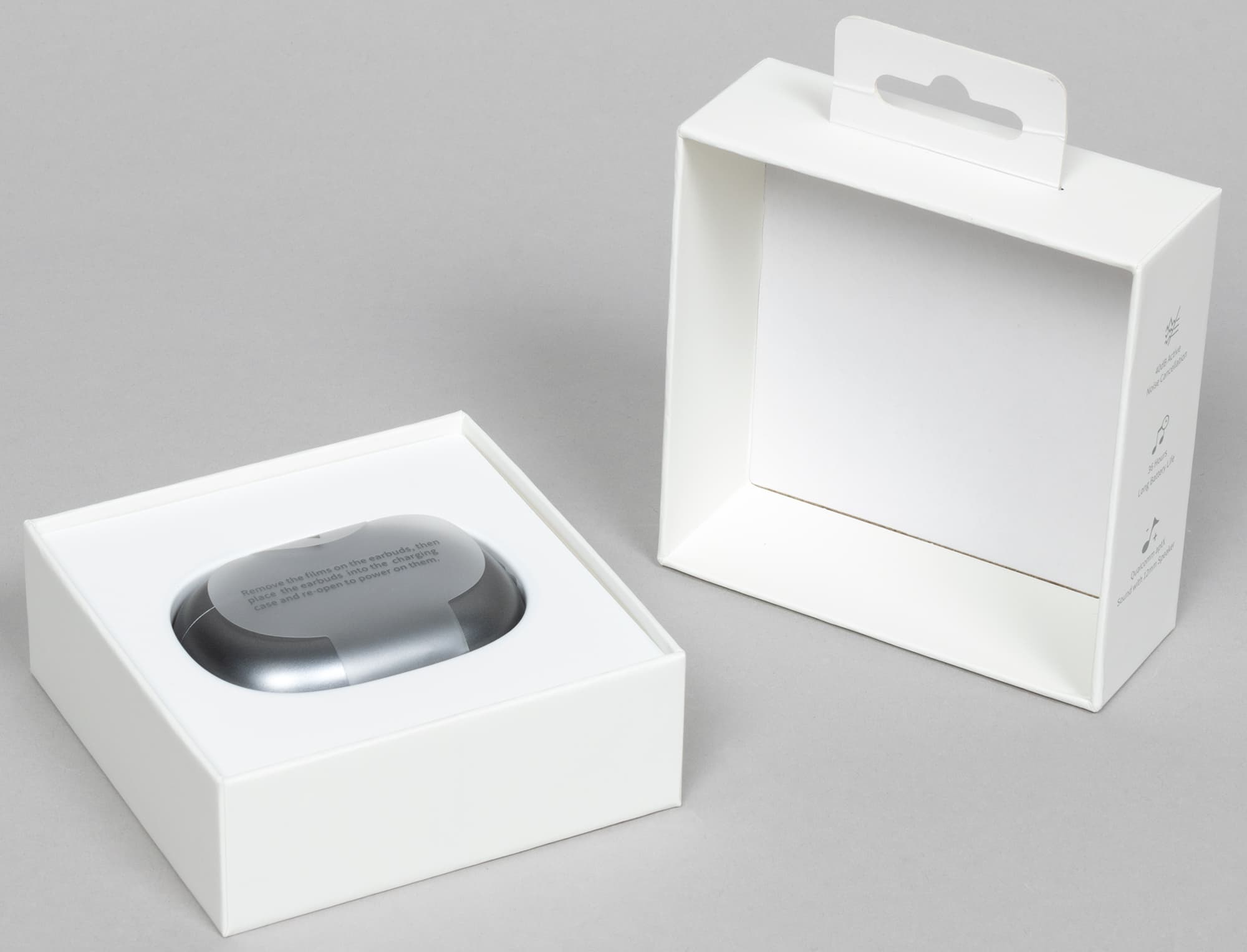 Крышка съемная, внутри наушники в кейсе удерживаются с помощью пластикового ложемента, над которым размещен дополнительный картонный элемент.
