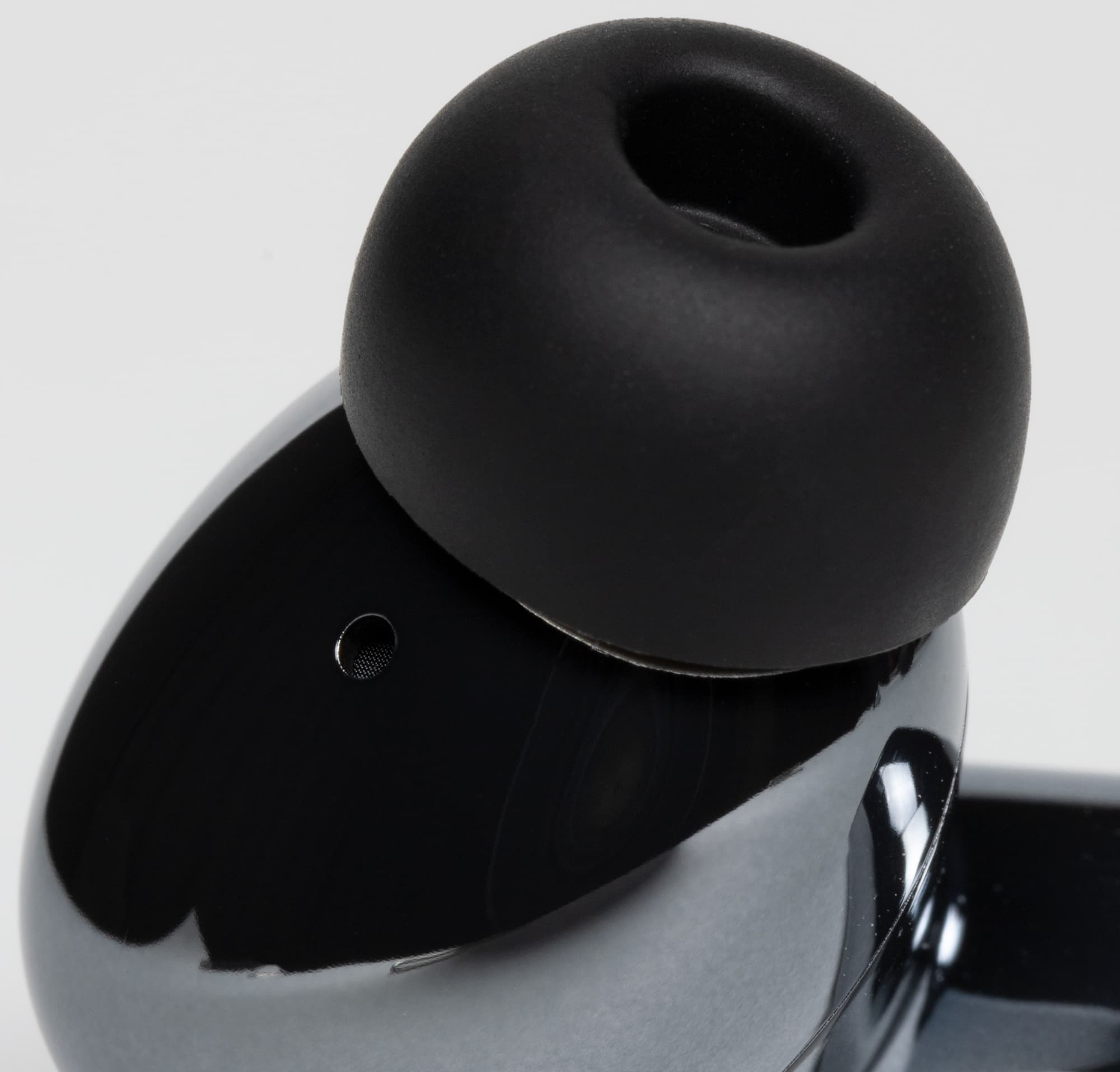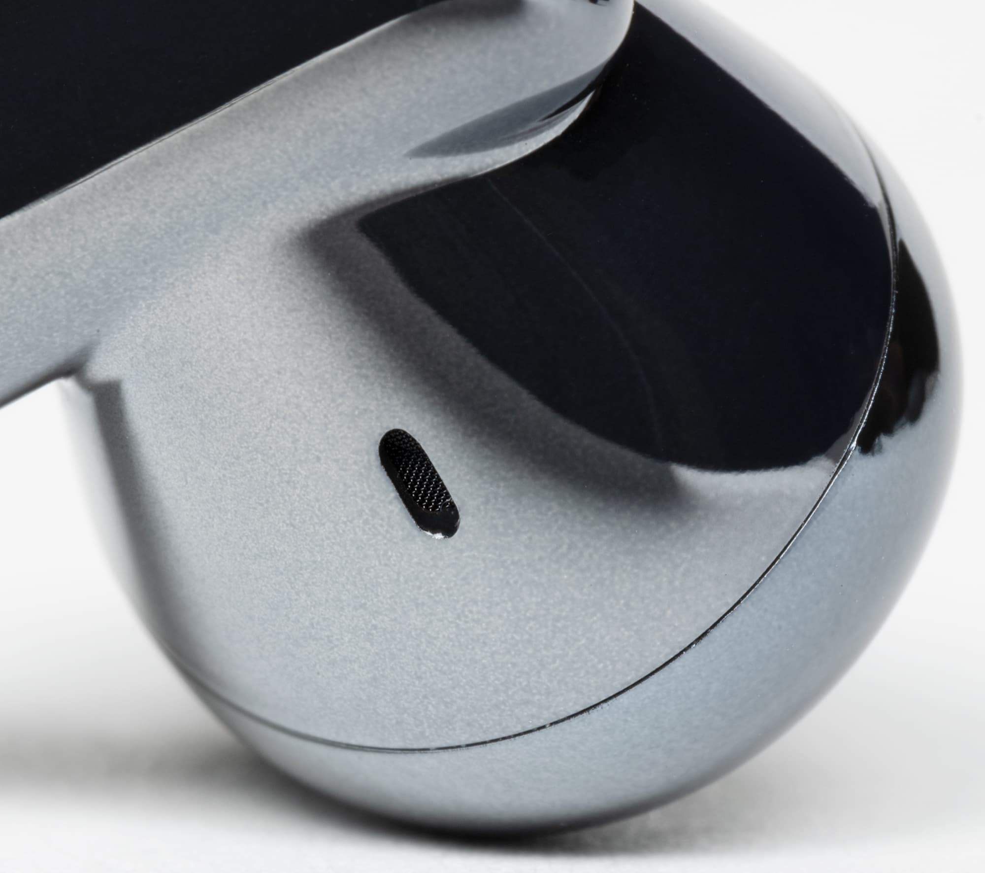 На обращенной к уху при ношении ее поверхности видно отверстие одного из микрофонов, обеспечивающих работу системы активного шумоподавления.