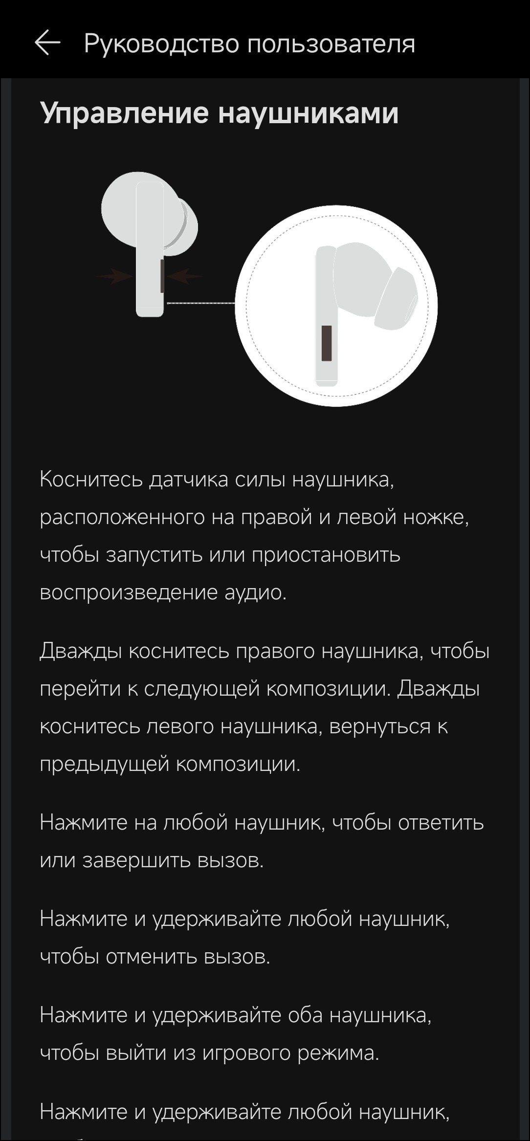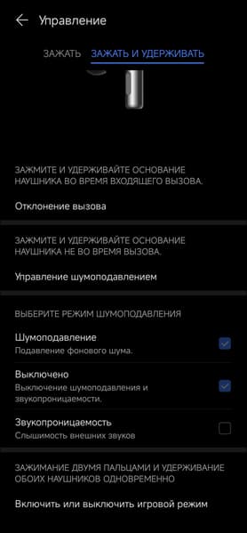В приложении есть целый раздел, посвященный управлению. Но пока он, скорее, выполняет функцию справочника — изменить можно совсем немногое: включить возможность активации голосового помощника, выбрать режимы шумоподавления для пролистывания, да задействовать игровой режим.
