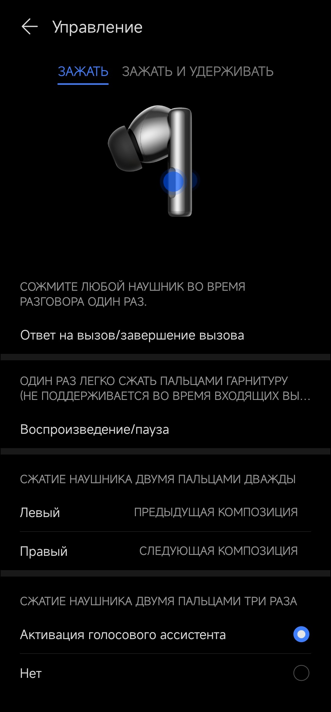 На самих наушниках управление осуществляется сжатием «ножки», по бокам которой размещены сенсорные зоны. При этом в наушниках раздается отчетливый клик, позволяющий быть уверенным, что действие произведено. Сам сенсор никаких звуков, конечно, не издает — клик имитируется с помощью динамиков наушников.