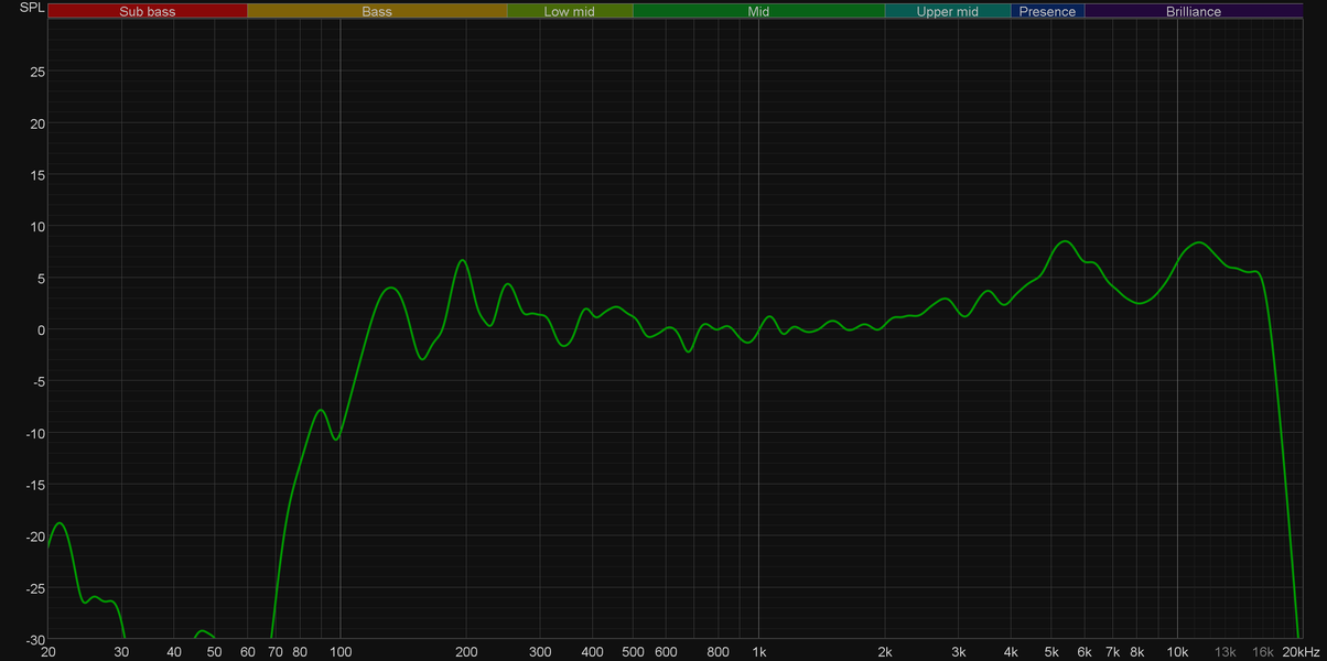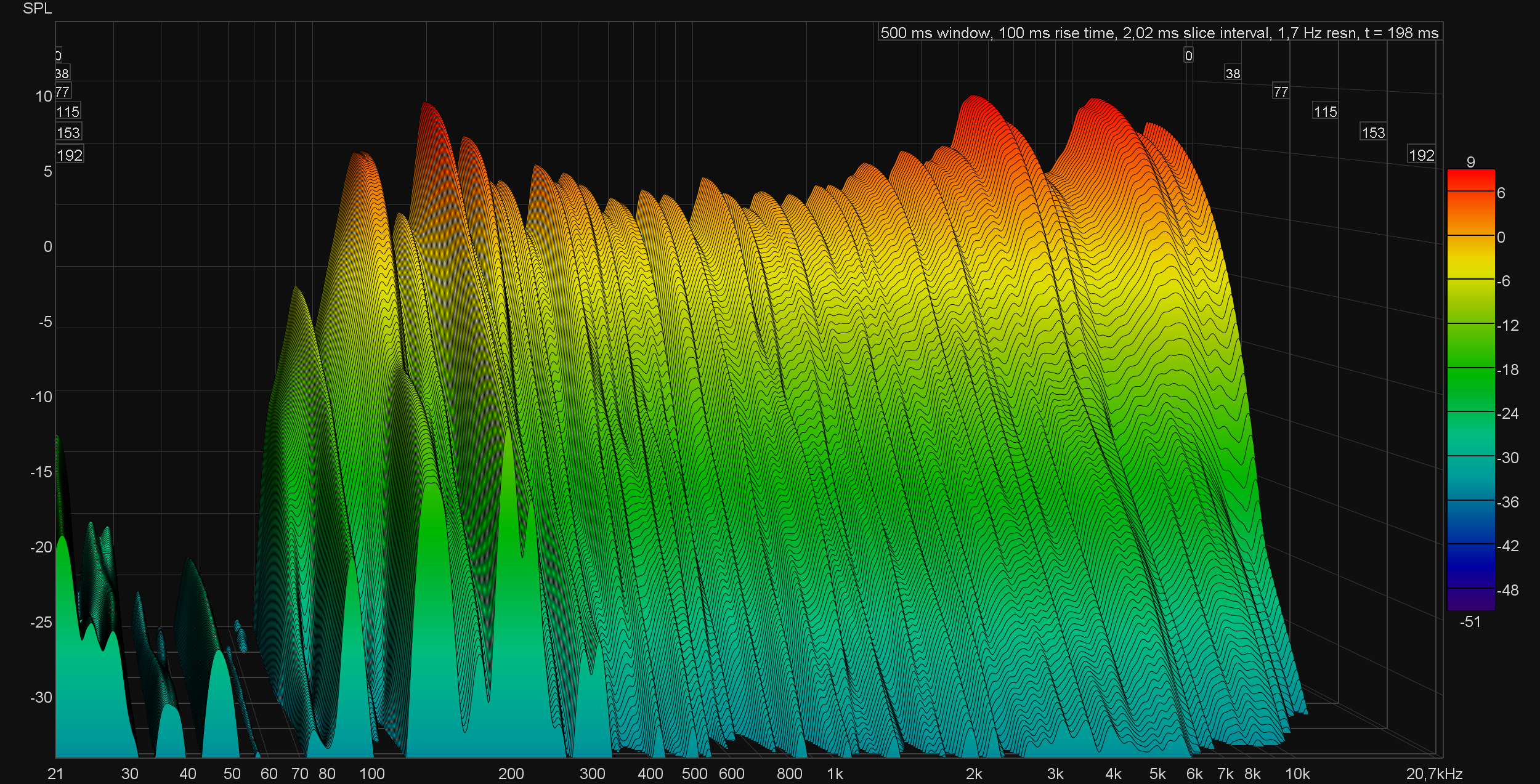 В воспроизведении НЧ-диапазона, по всей видимости, помогает анонсированный производителем резонатор, потому бас склонен к «гудению», которое отлично видно на графике кумулятивного затухания спектра (он же «водопад» или waterfall). Ну и заодно можно увидеть, что корпус склонен к вибрации — при массе в 250 г это неизбежно.