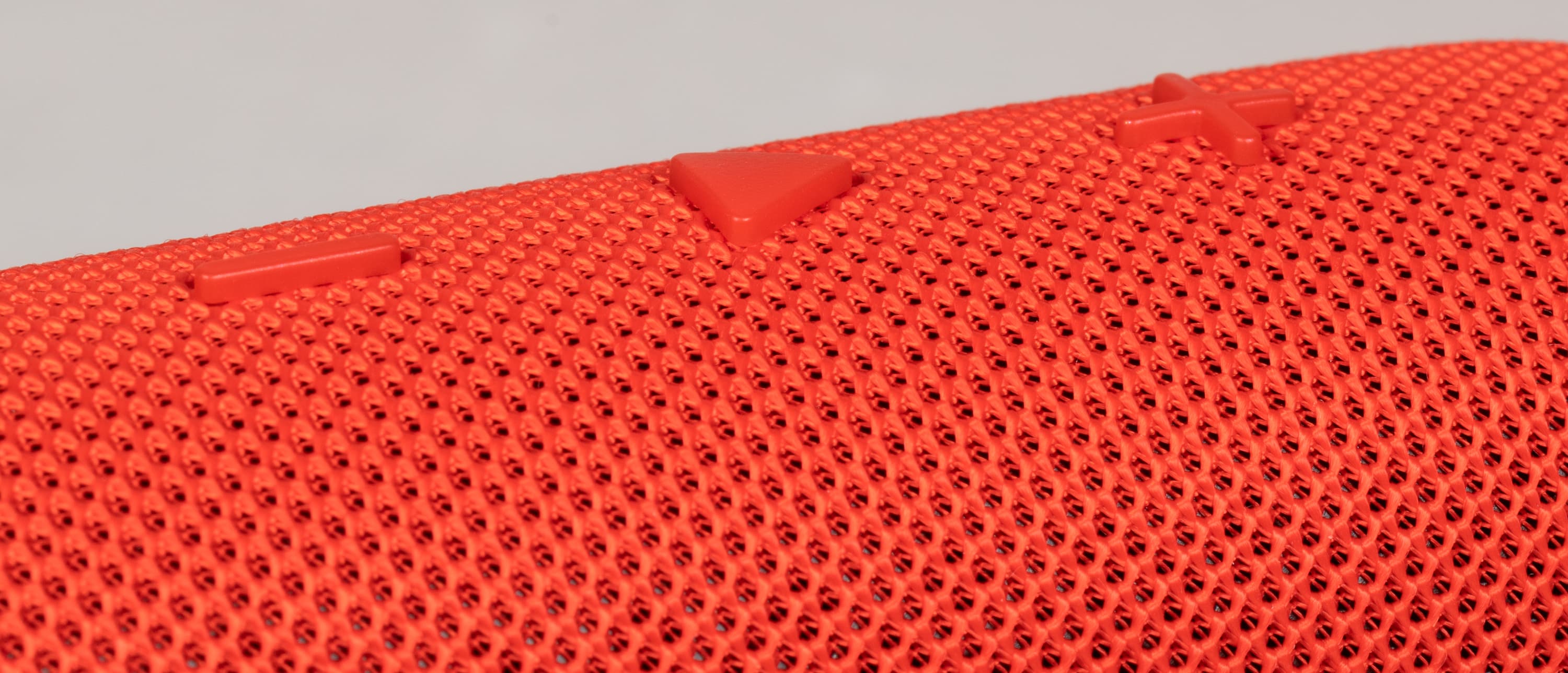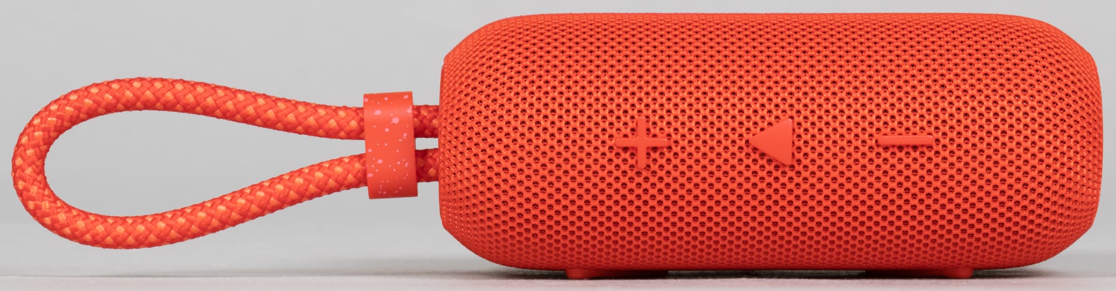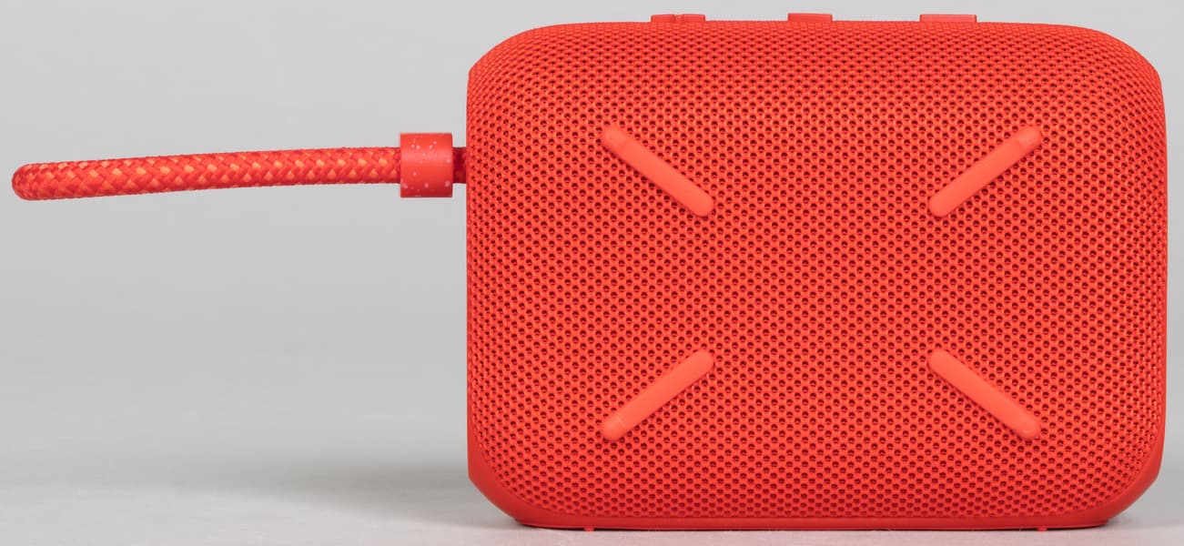 Большая часть корпуса обтянута сеткой, на оставшихся поверхностях мы видим силиконовую накладку. Сбоку размещен маленький шнурок, с помощью которого можно повесить колонку на что-нибудь — от собственного пальца до ветки дерева.