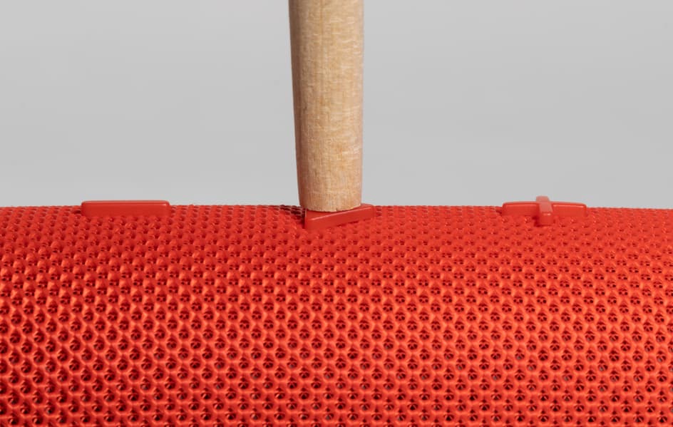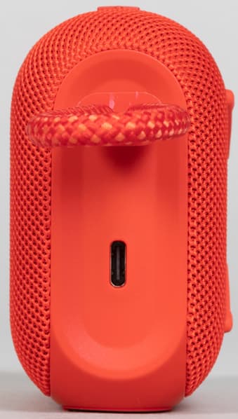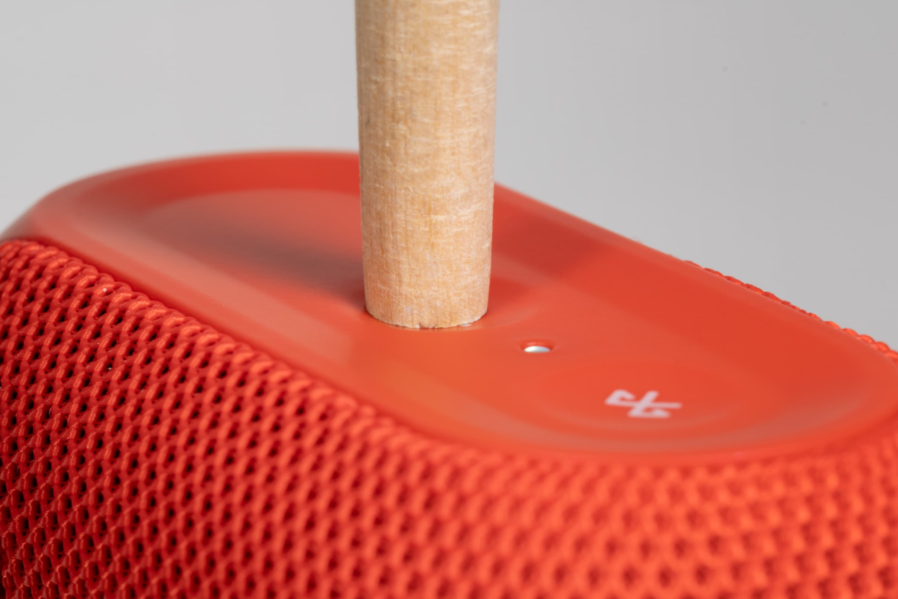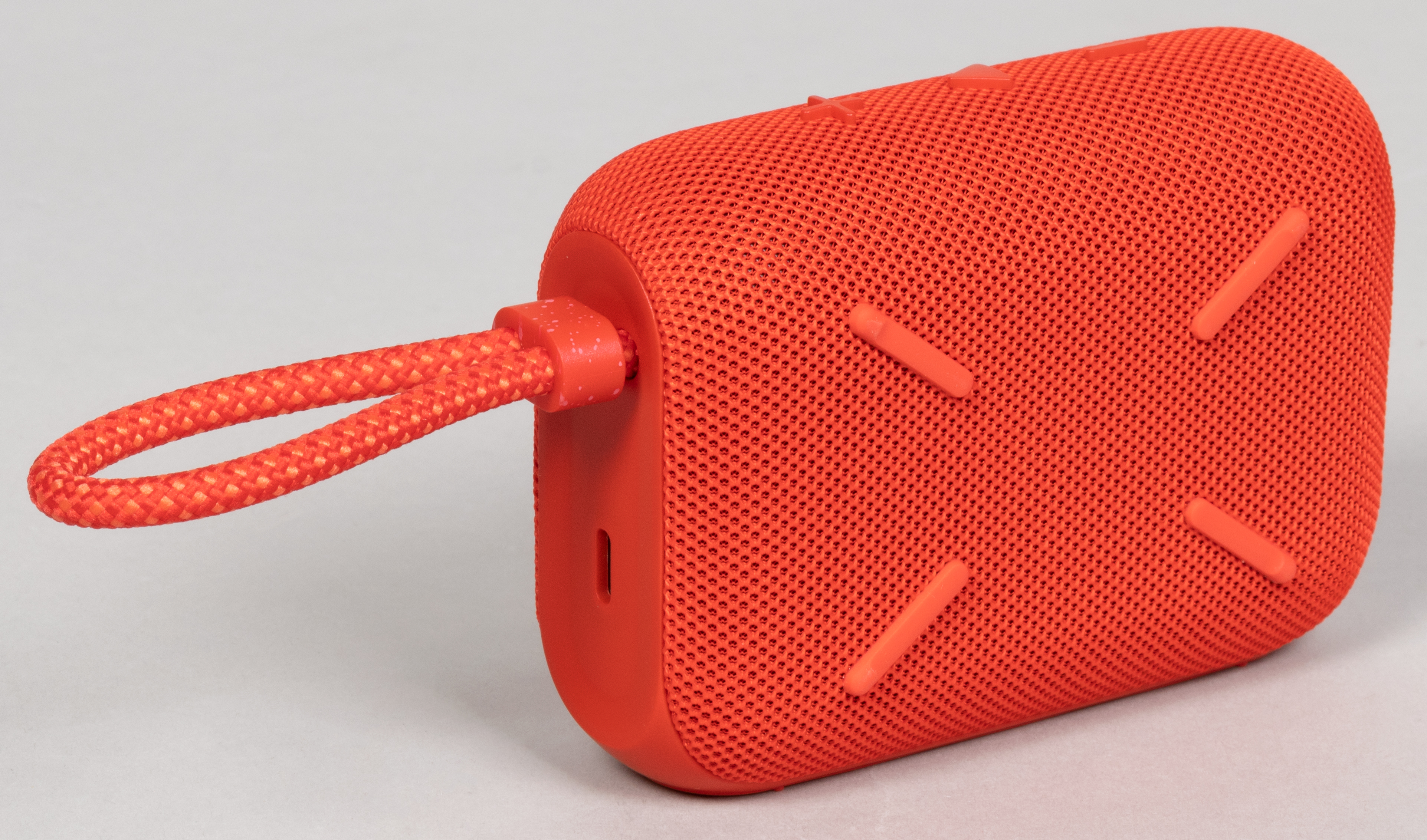 Большая часть корпуса обтянута сеткой, на оставшихся поверхностях мы видим силиконовую накладку. Сбоку размещен маленький шнурок, с помощью которого можно повесить колонку на что-нибудь — от собственного пальца до ветки дерева.