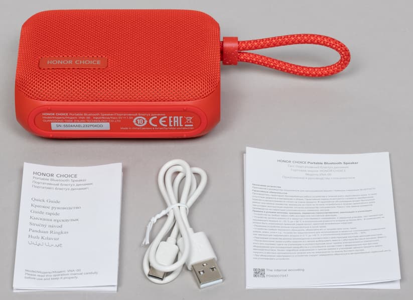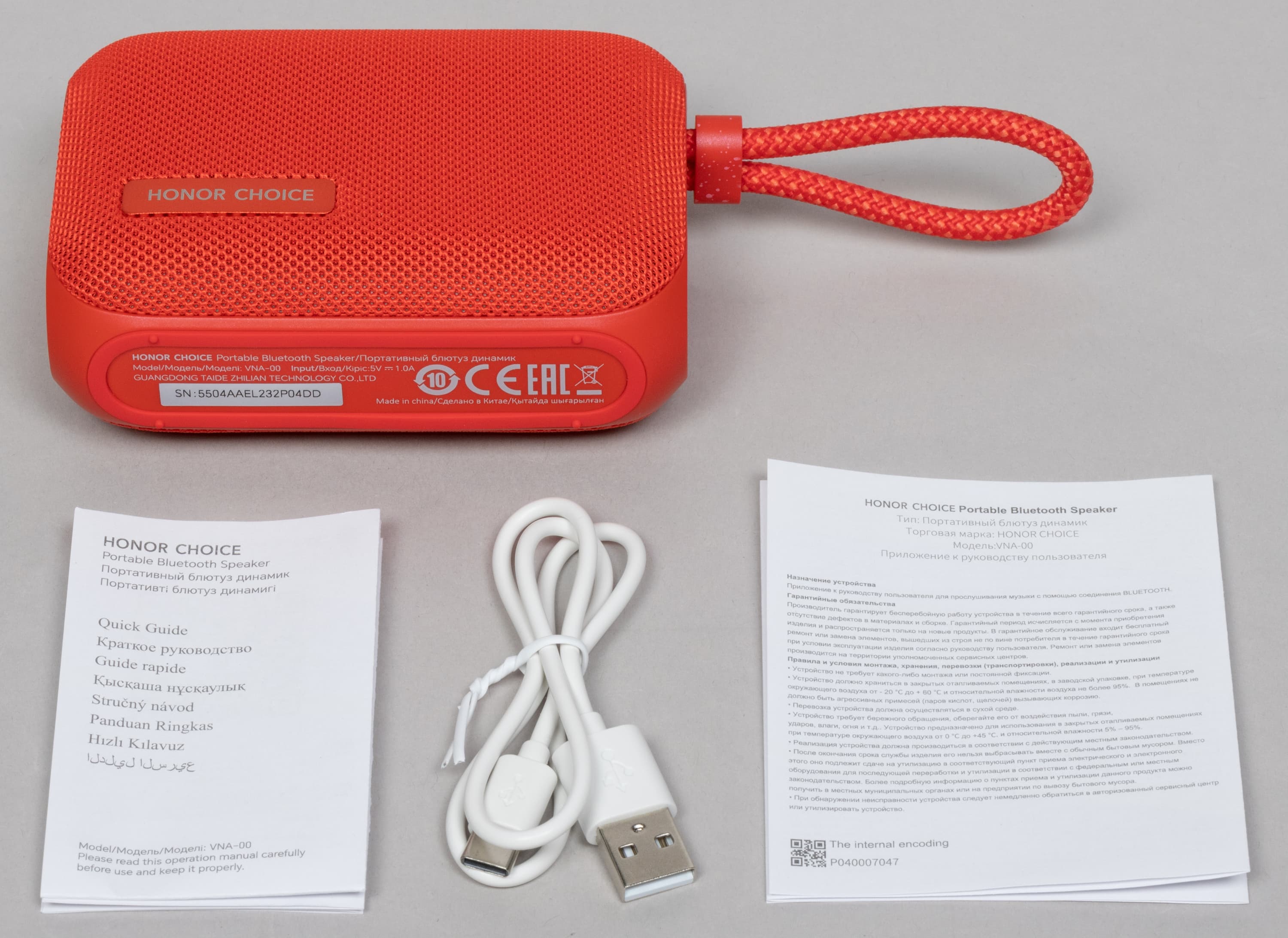 В комплект поставки входят сам Honor Choice MusicBox M1, документация и кабель USB-A — USB-C для зарядки.