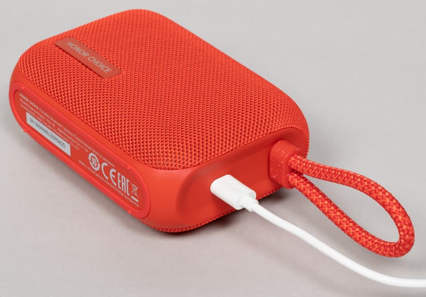 Кабель имеет длину 50 см и выполнен на приемлемом уровне качества. Сразу отметим, что терять его не стоит: попытавшись зарядить колонку уже имевшимся на столе кабелем, мы неожиданно выяснили, что далеко не все они подходят для зарядки Honor Choice MusicBox M1 — порт USB Type C утоплен под силиконовое покрытие корпуса, а потому многие коннекторы просто «не дотягиваются» до контактов внутри порта.