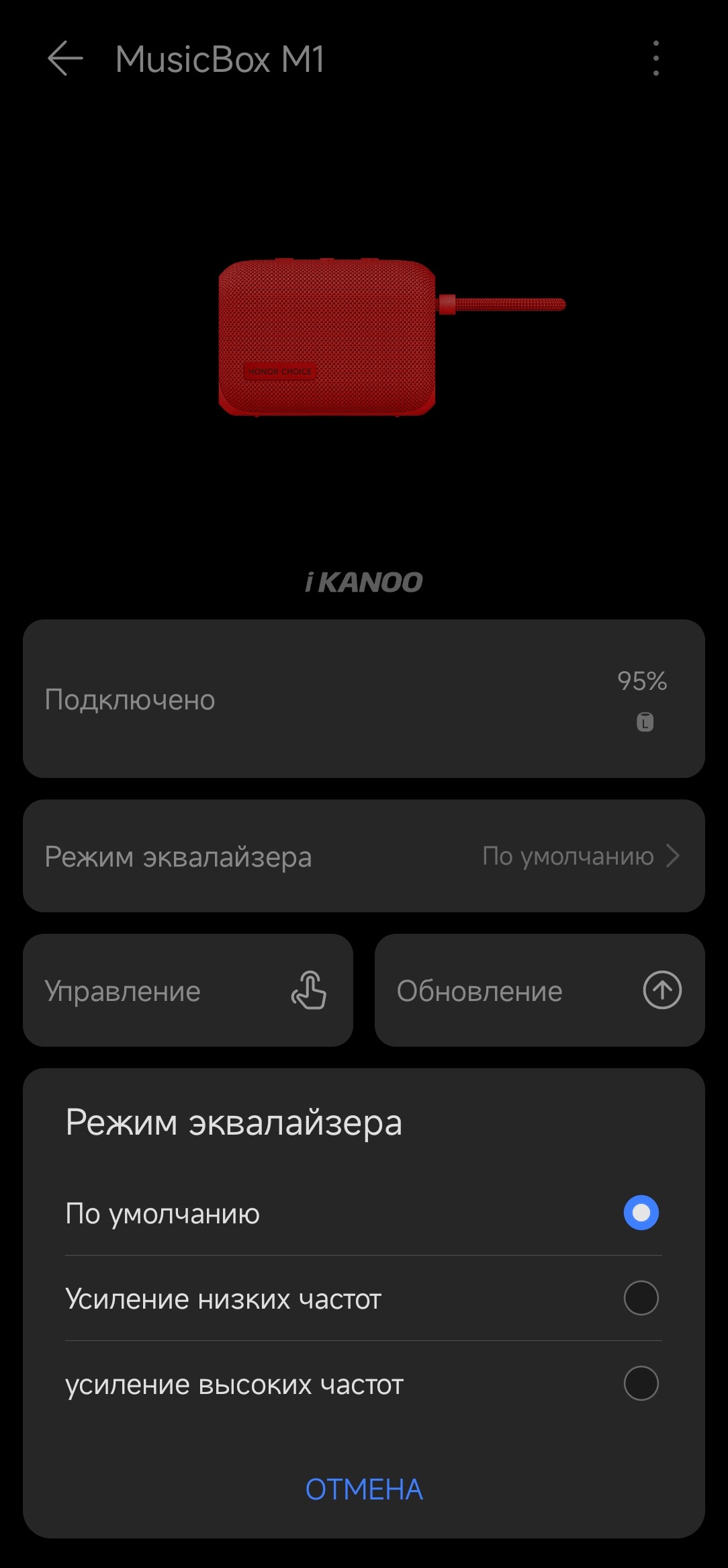 Также колонка поддерживает взаимодействие с приложением Honor AI Space — правда, на данный момент количество настроек минимально. Но польза от него всё же имеется: как минимум, можно посмотреть уровень заряда аккумулятора. Также можно настроить эквалайзер, вернее — выбрать один из трех режимов. Прямо скажем, не очень-то много. Но учитывая размеры и стоимость колонки — спасибо и на том.
