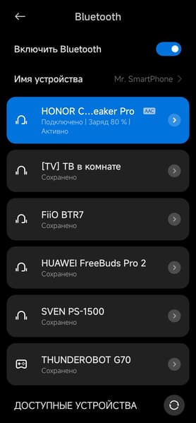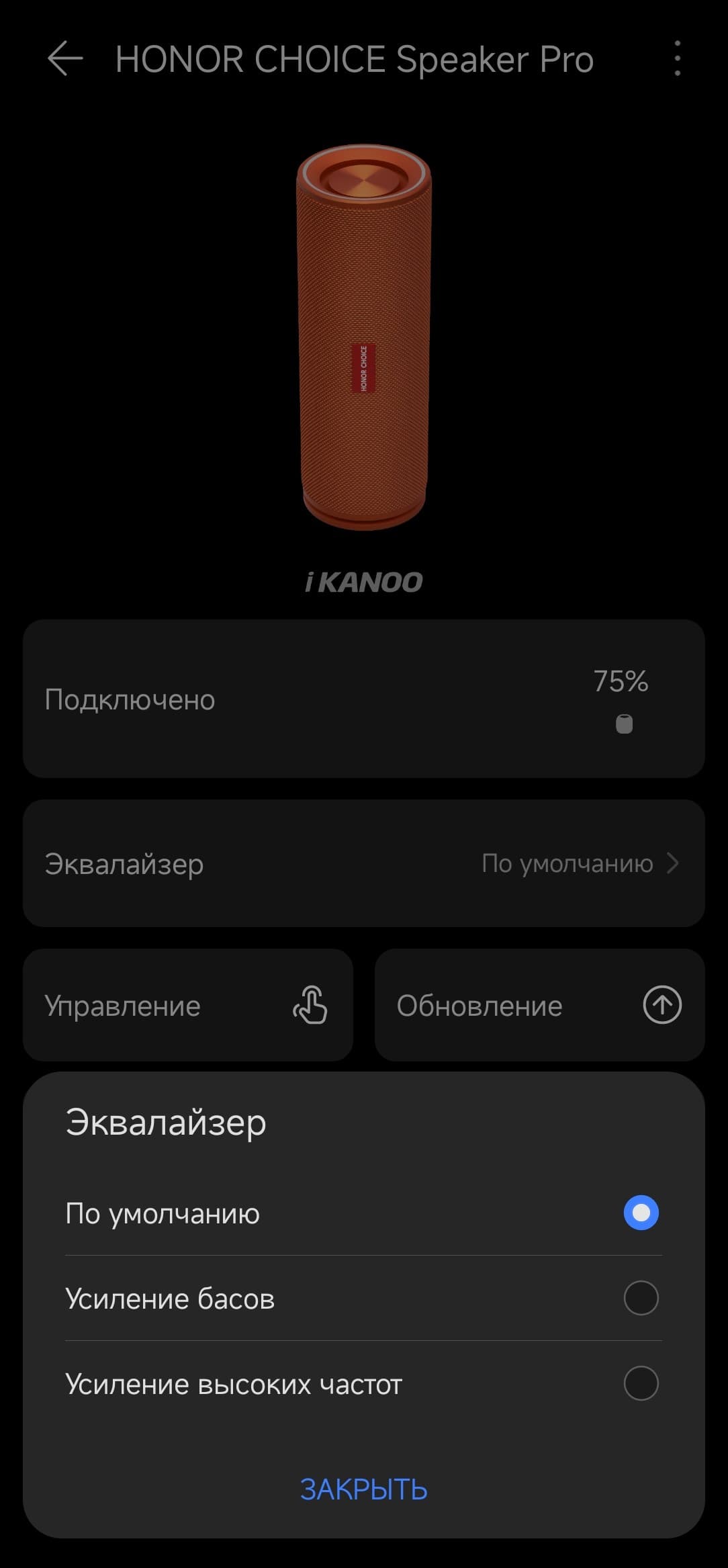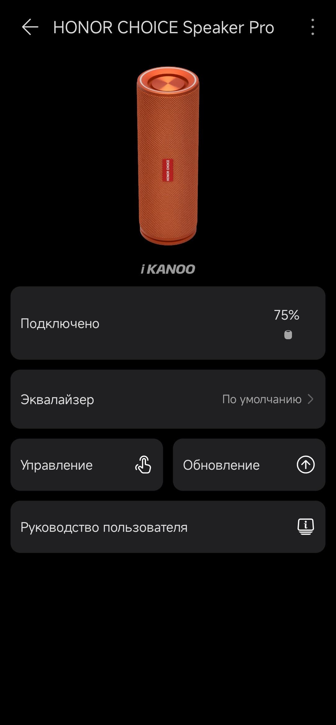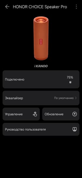 Корпус Honor Choice Portable Speaker Pro имеет защиту IP67, то есть способен выдержать не только брызги, но и кратковременное погружение в воду — соответственно, можно без опасений брать колонку на природу, к берегу водоема и так далее. А еще она поддерживает взаимодействие с приложением Honor AI Space — доступных опций в нем крайне немного, но всё же кое-что интересное есть. Как минимум, на первом экране можно узнать более-менее точный уровень заряда встроенного аккумулятора.