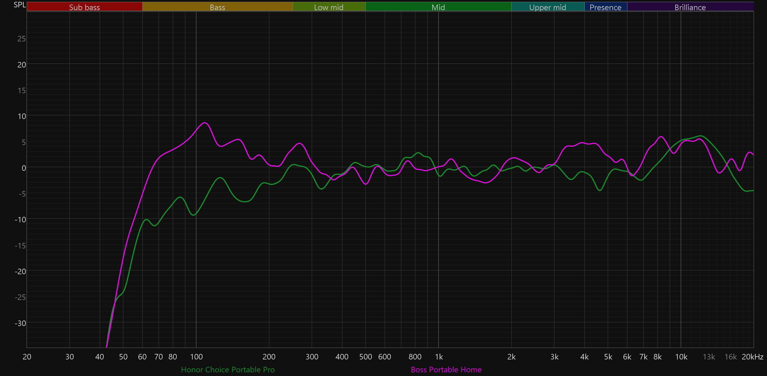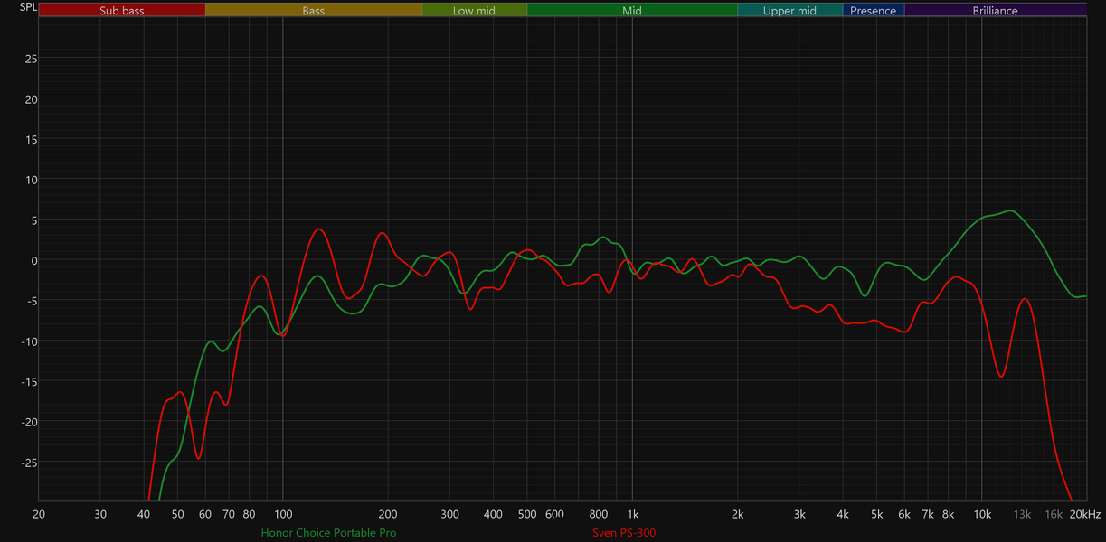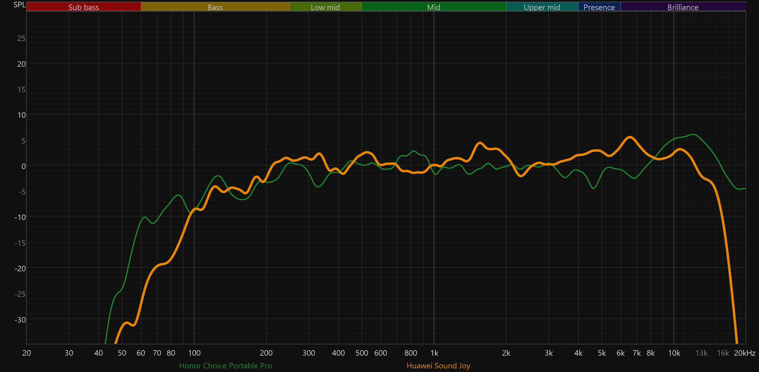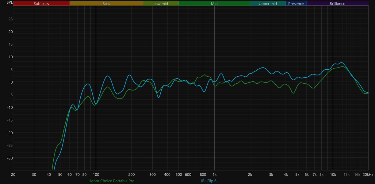 Под конец сравним графики АЧХ тестируемой колонки и нескольких самых лучших и востребованных продуктов других производителей. Как несложно заметить, выглядит Honor Choice Portable Speaker Pro на их фоне очень уверенно.