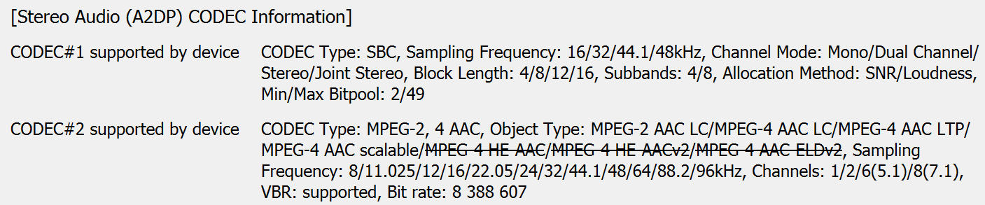 С помощью утилиты Bluetooth Tweaker был получен полный список поддерживаемых кодеков и их режимов. Кодеков два — SBC и AAC. Параметр Bitpool у SBC ограничен значением 49, тогда как рекомендованный профиль High Quality подразумевает значение 51 — кодек отработает практически на максимуме своих возможностей и вряд ли станет «узким местом», ограничивающим качество звучания. Что же касается AAC, то его максимальный битрейт выставлен на каком-то запредельном уровне, то есть теоретически не ограничен. По факту же с большинством устройств будет использоваться 256 Кбит/с, которых более чем достаточно для компактной портативной акустики.