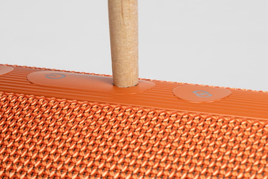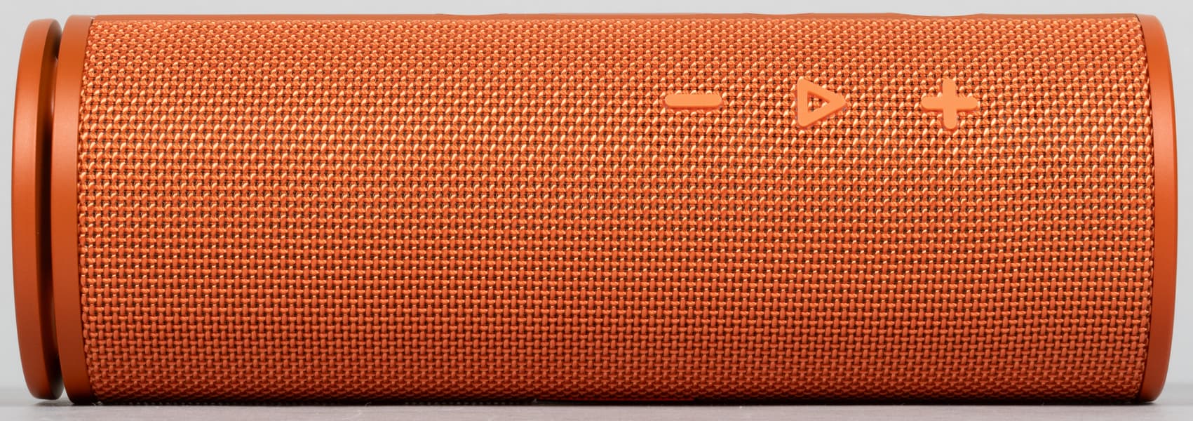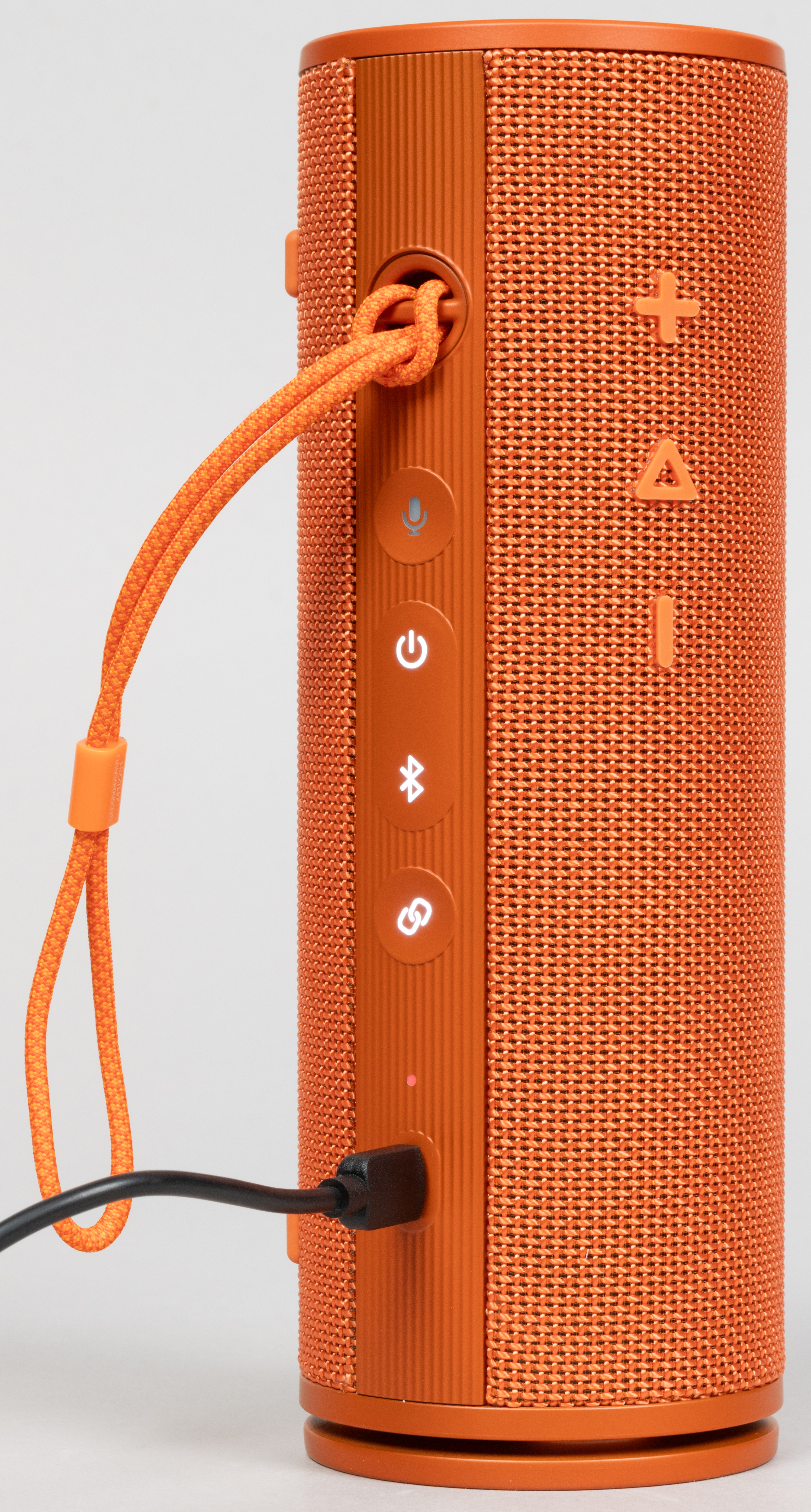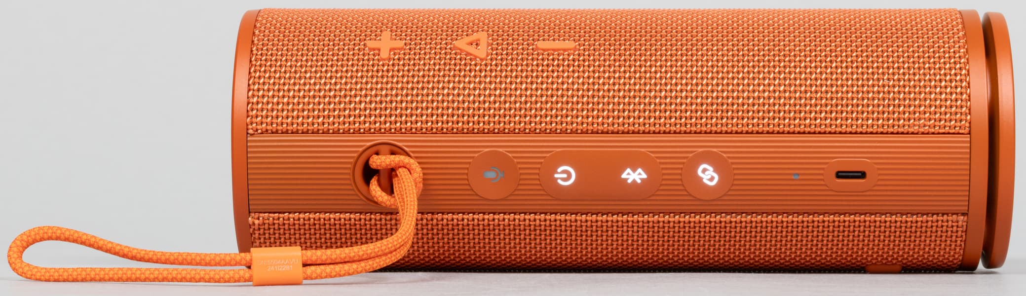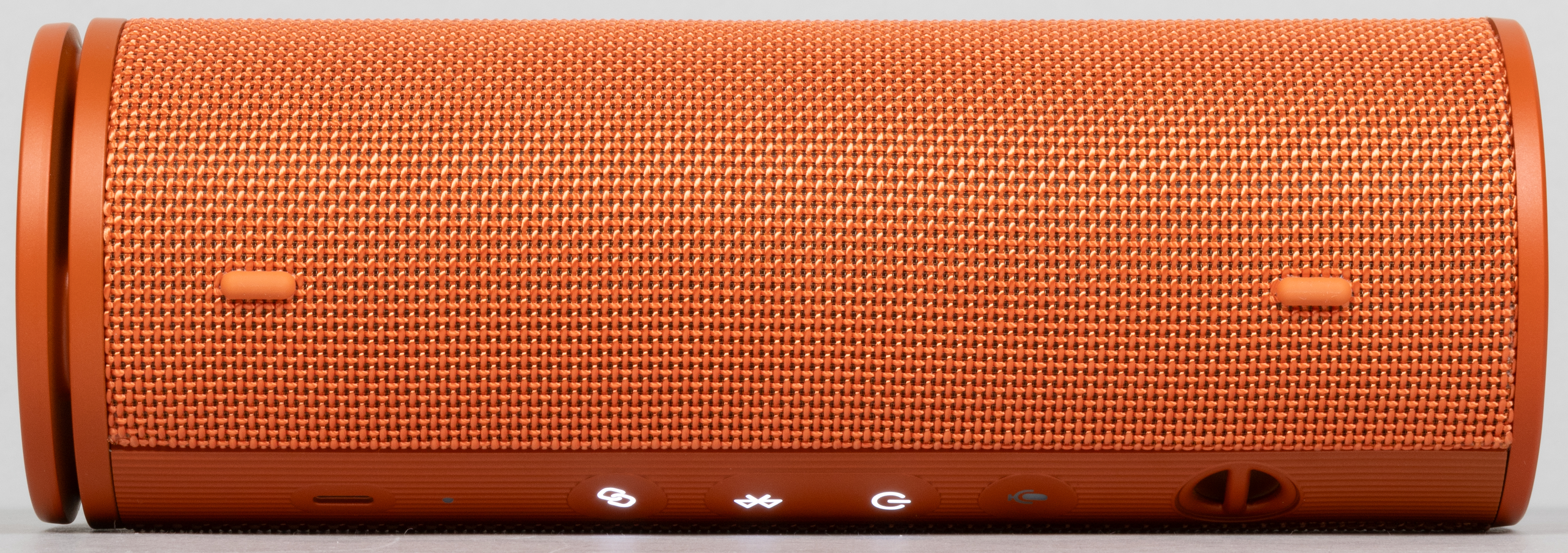 Для удобства ношения у колонки есть съемный шнурок, который можно повесить на запястье, зацепить за ветку дерева или рюкзак, ну и так далее. Кнопки на боковой панели подсвечиваются, подробнее мы поговорим про них в соответствующей главе. Рядом с ними размещены порт USB Type C для зарядки и ее светодиодный индикатор.
