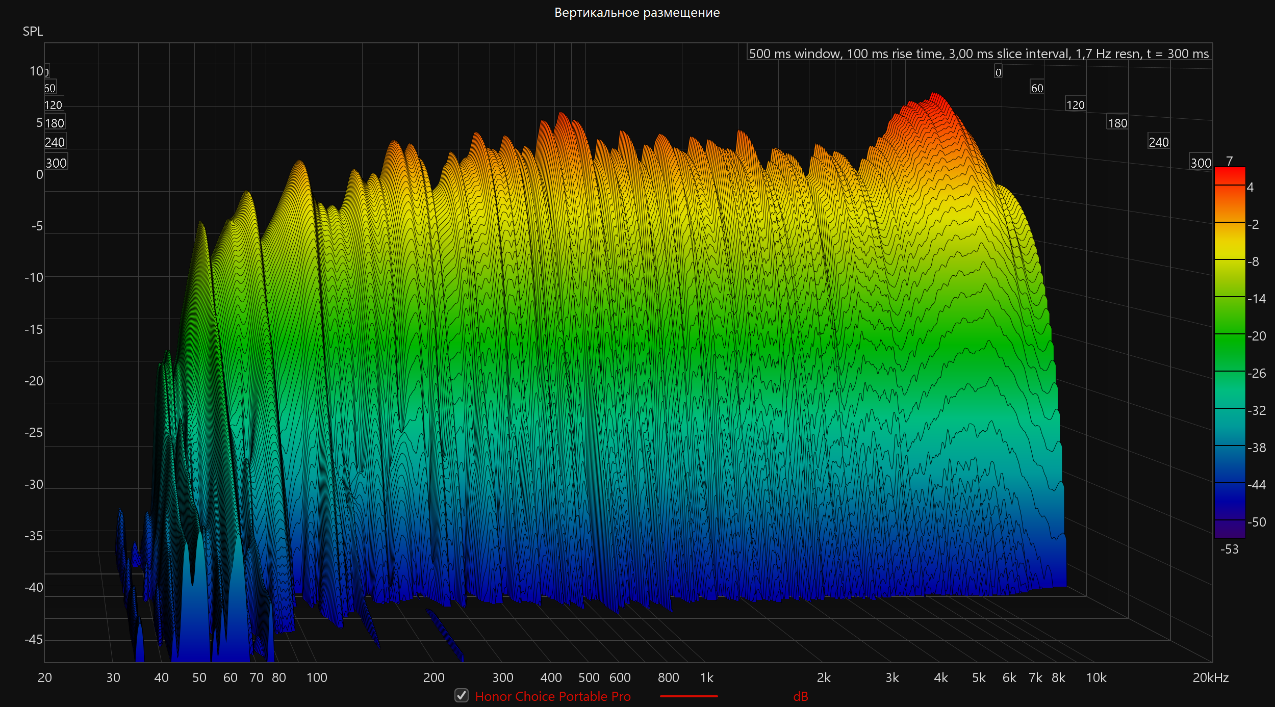 За счет работы пассивных излучателей НЧ-диапазон получается самую малость гулким, что видно на графике кумулятивного затухания спектра (он же «водопад» или waterfall). Но и самим фактом его наличия мы обязаны именно им, потому жаловаться тут не на что. Да и эффект «гудения» тут выражен гораздо меньше, чем у некоторой бюджетной акустики с фазоинвертором.