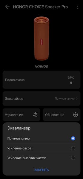 В разделе настроек можно поменять имя устройства и выяснить базовую информацию о нем. Ну а самый интересный модуль на главном экране — это, конечно, эквалайзер. Вернее, возможность выбрать один из трех пресетов звучания — основной, а также с акцентом на низких или высоких частотах. Прямо скажем, немного.