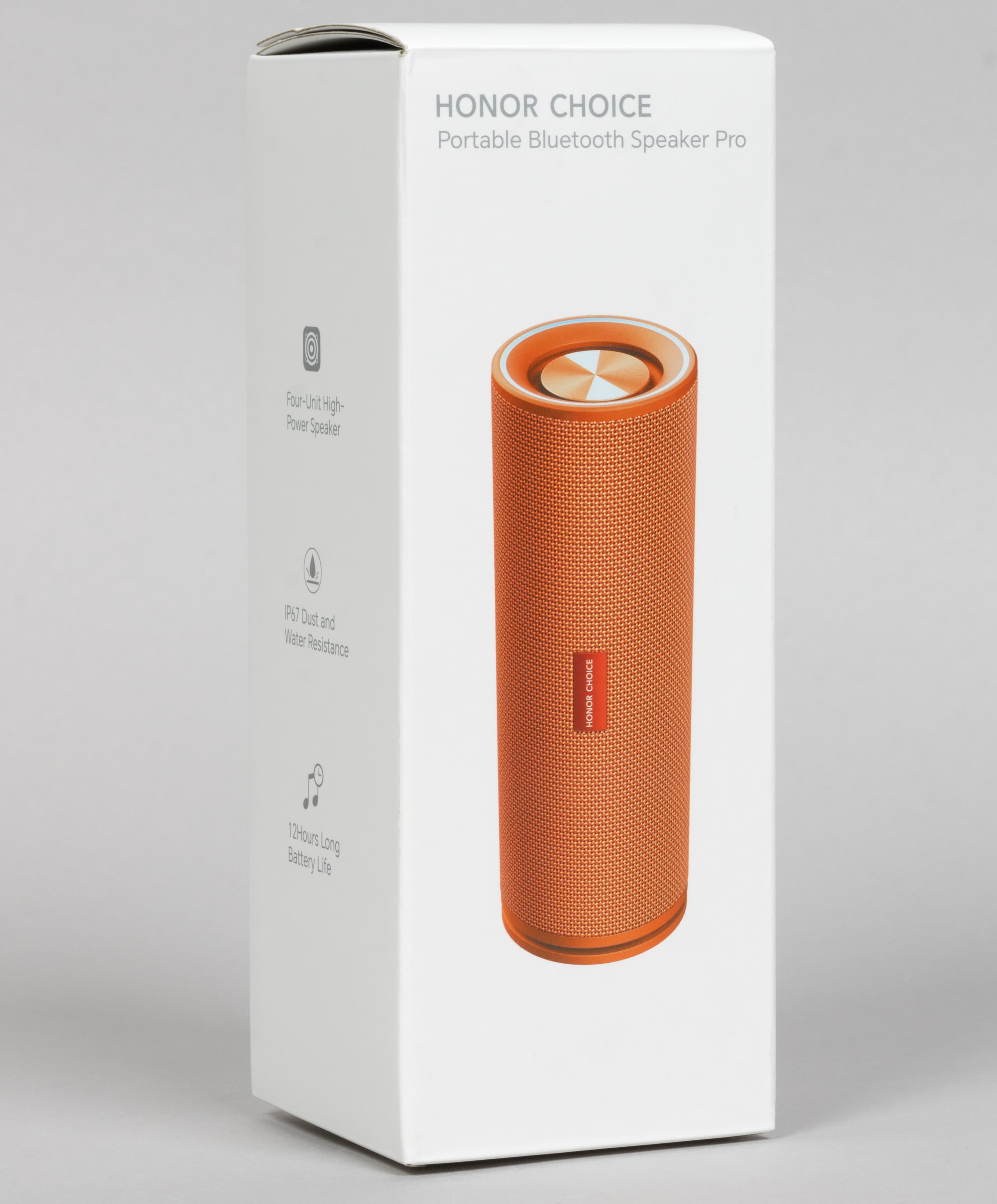Поставляется Honor Choice Portable Speaker Pro в коробке из белого картона, на которую нанесены изображение колонки и ее краткие характеристики. Внутри устройство надежно удерживается с помощью картонных ложементов.
