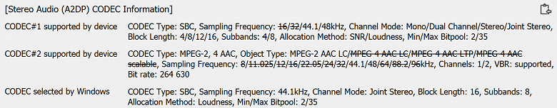 Любой из наушников может работать в монорежиме — достаточно просто убрать другой в кейс. Один из них используется в качестве «ведущего» и служит для подключения к источнику, если отключить его — гарнитуре понадобится немного времени на переподключение, возникнет пауза в воспроизведении. Мультипойнт гарнитура не поддерживает. После подключения к ПК мы традиционно получили список поддерживаемых кодеков и их режимов с помощью утилиты Bluetooth Tweaker.