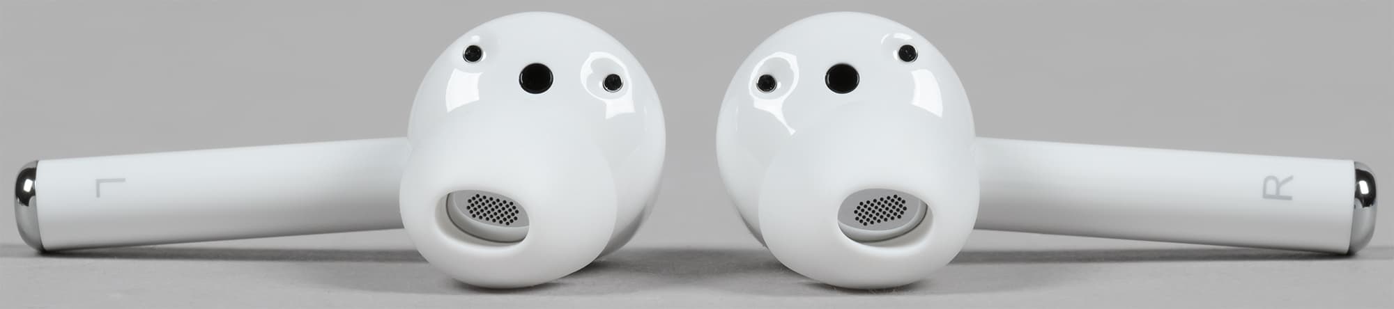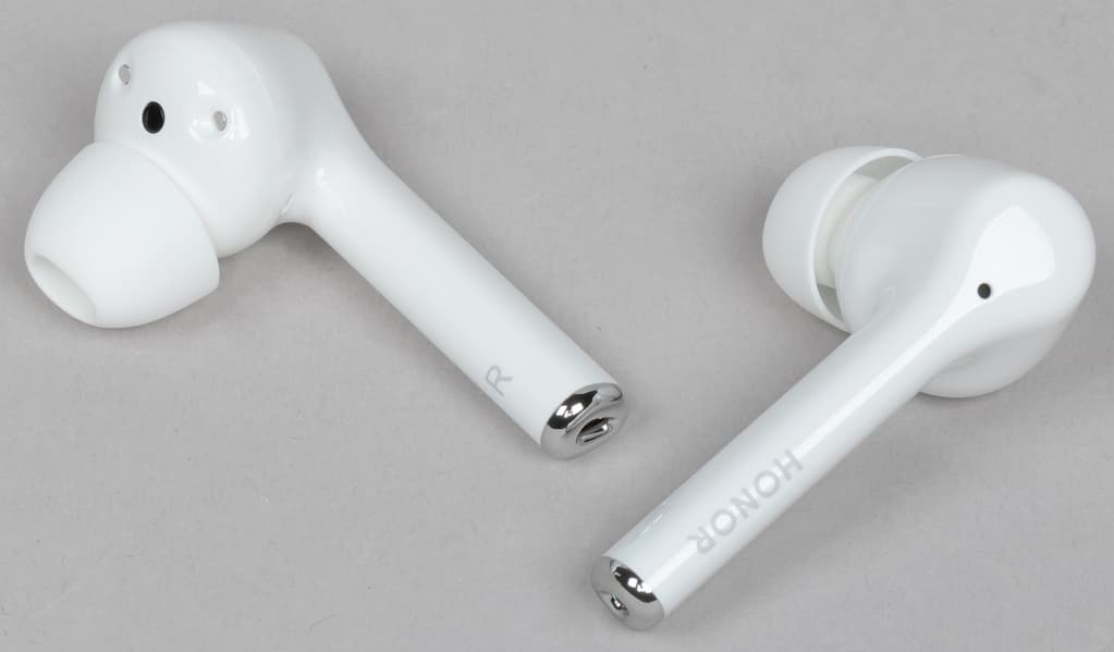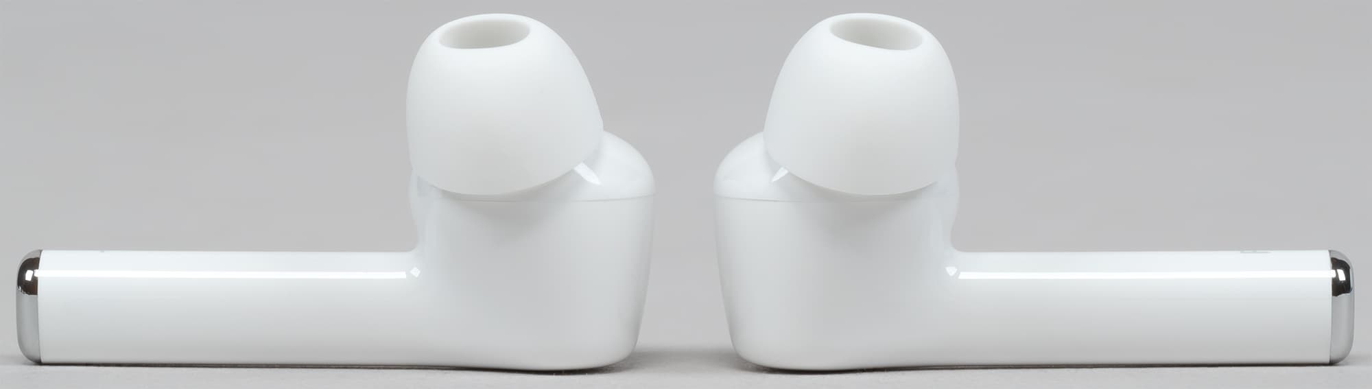 На внутренней части наушников видны контакты для зарядки, отверстия звуководов и окошки сенсоров ношения. На «палочки» нанесены обозначения «право»/«лево».