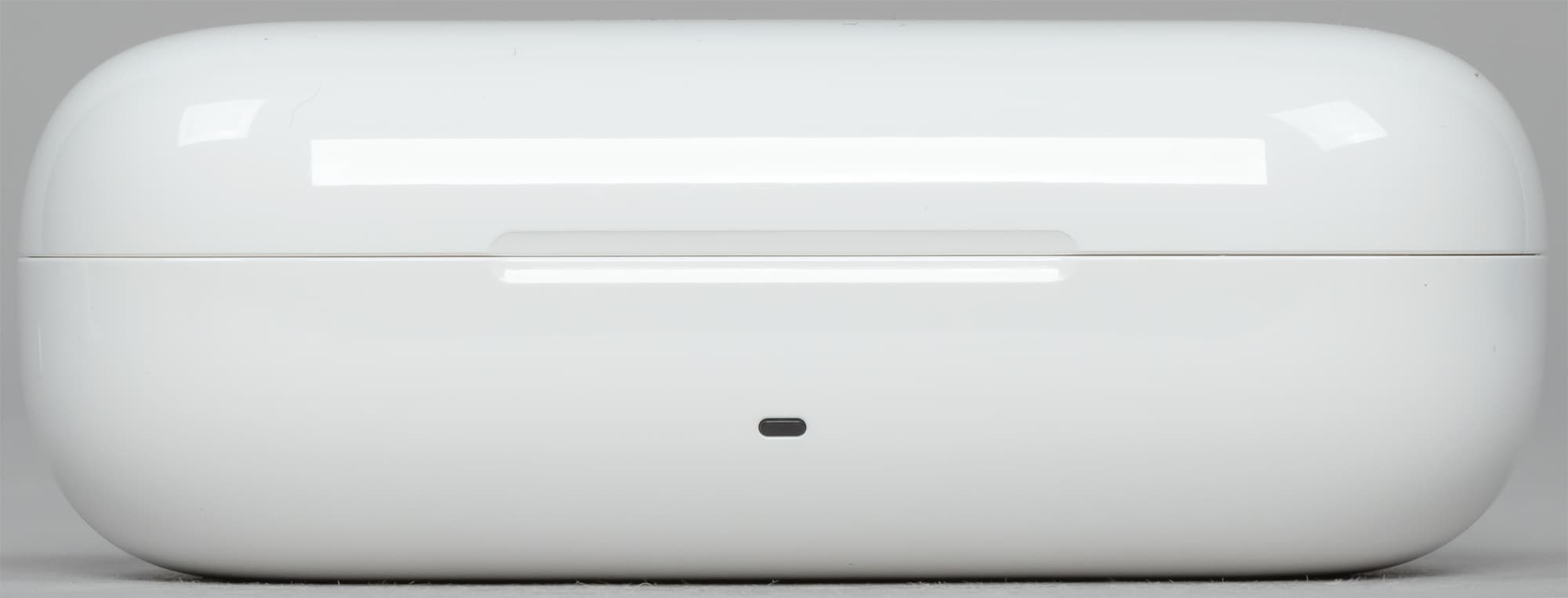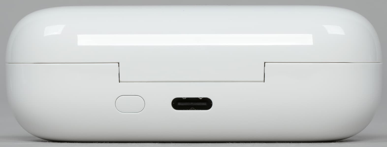 На задней поверхности кейса находятся разъем USB-C для зарядки и кнопка активации режима сопряжения с источником звука.