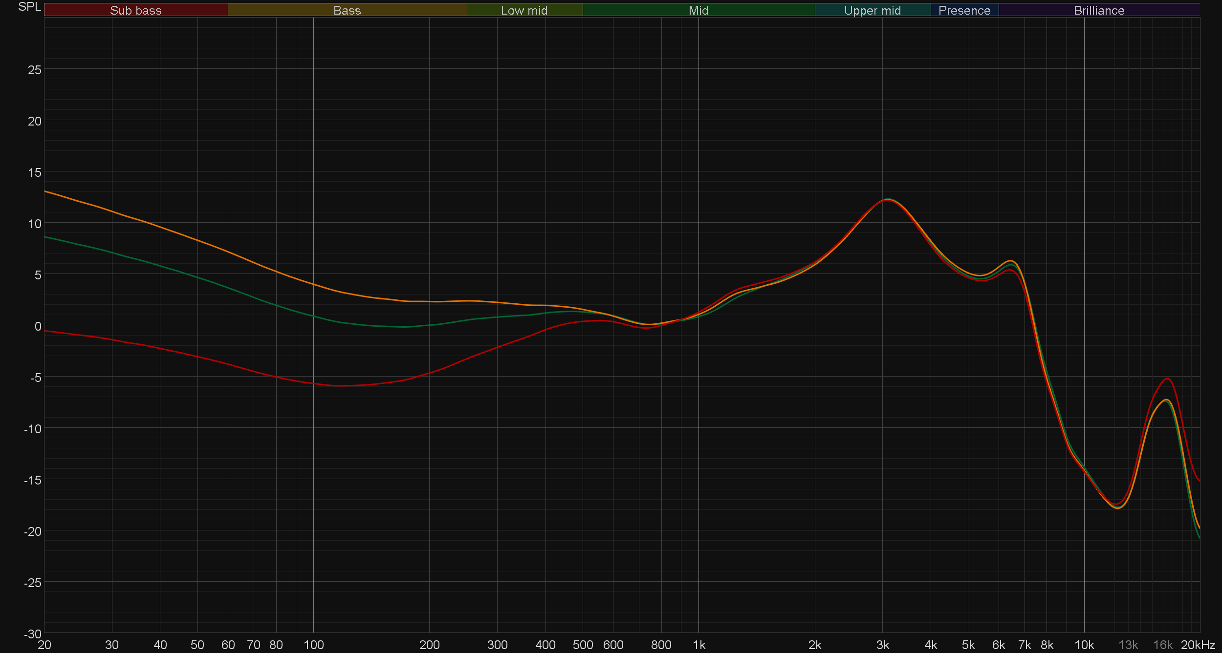Ну и под конец в очередной раз проиллюстрируем важность правильного подбора амбушюров. При этом правильность определяется далеко не только максимально плотной посадкой в ушной проход. Напротив, смена амбушюров на чуть меньшие часто позволяет сгладить слишком форсированную подачу низкочастотного диапазона. В подтверждение наших слов покажем три графика, полученных с использованием амбушюров разного размера.