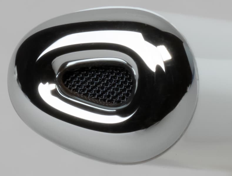 Звуковод овальный, его выход закрыт металлической накладкой интересной формы: поверхность довольно гладкая и хорошо поддается очистке — гораздо лучше, чем традиционные «сеточки».