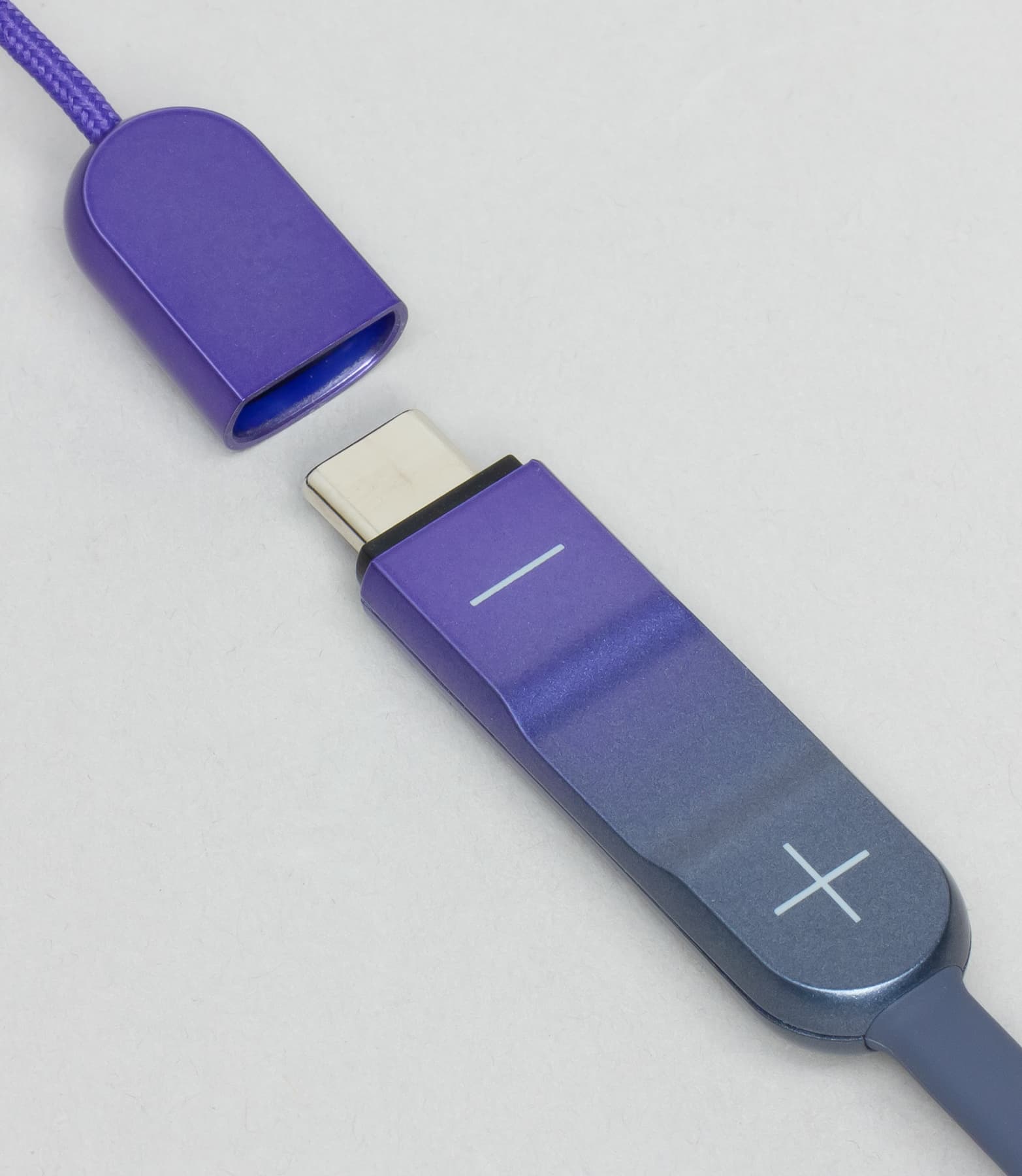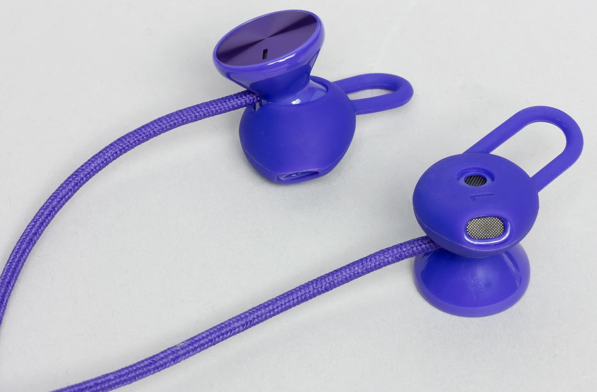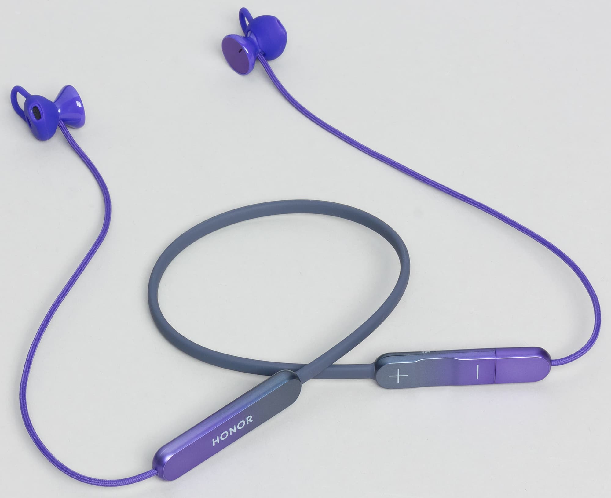 Наушники предлагаются в трех вариантах градиентной окраски: фиолетовой, серой и красной. Благодаря градиенту устройство выглядит оригинально и интересно. Нам на тестирование достался фиолетовый вариант. Шейная часть обода крайне эластична и очень приятна на ощупь благодаря силиконовому покрытию.