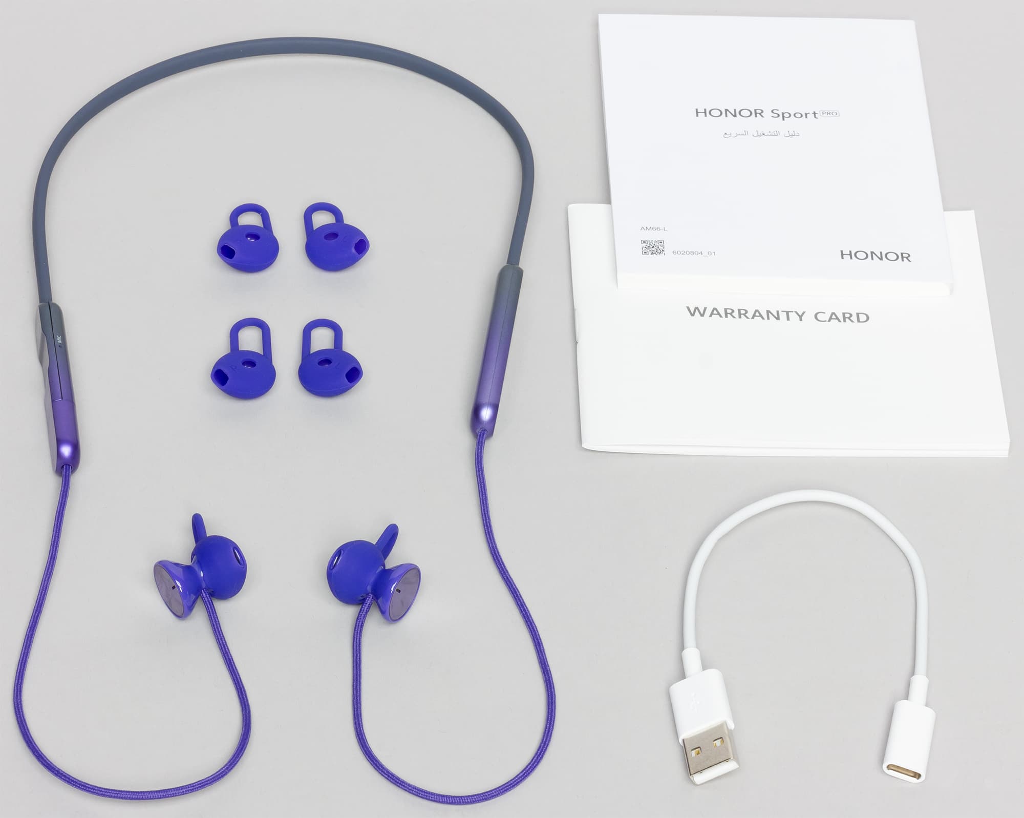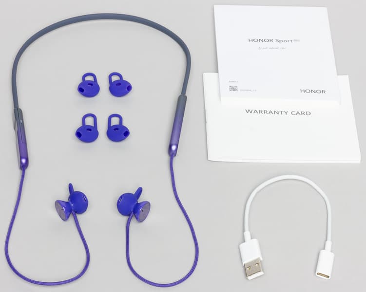 В комплект входит гарнитура, три пары силиконовых насадок разных размеров (представитель Honor уточнил, что в продаже с гарнитурой будут поставлять не три, а шесть пар насадок), краткая инструкция, гарантийный талон, а также переходник USB-A (male) — USB-C (female), служащий для зарядки.