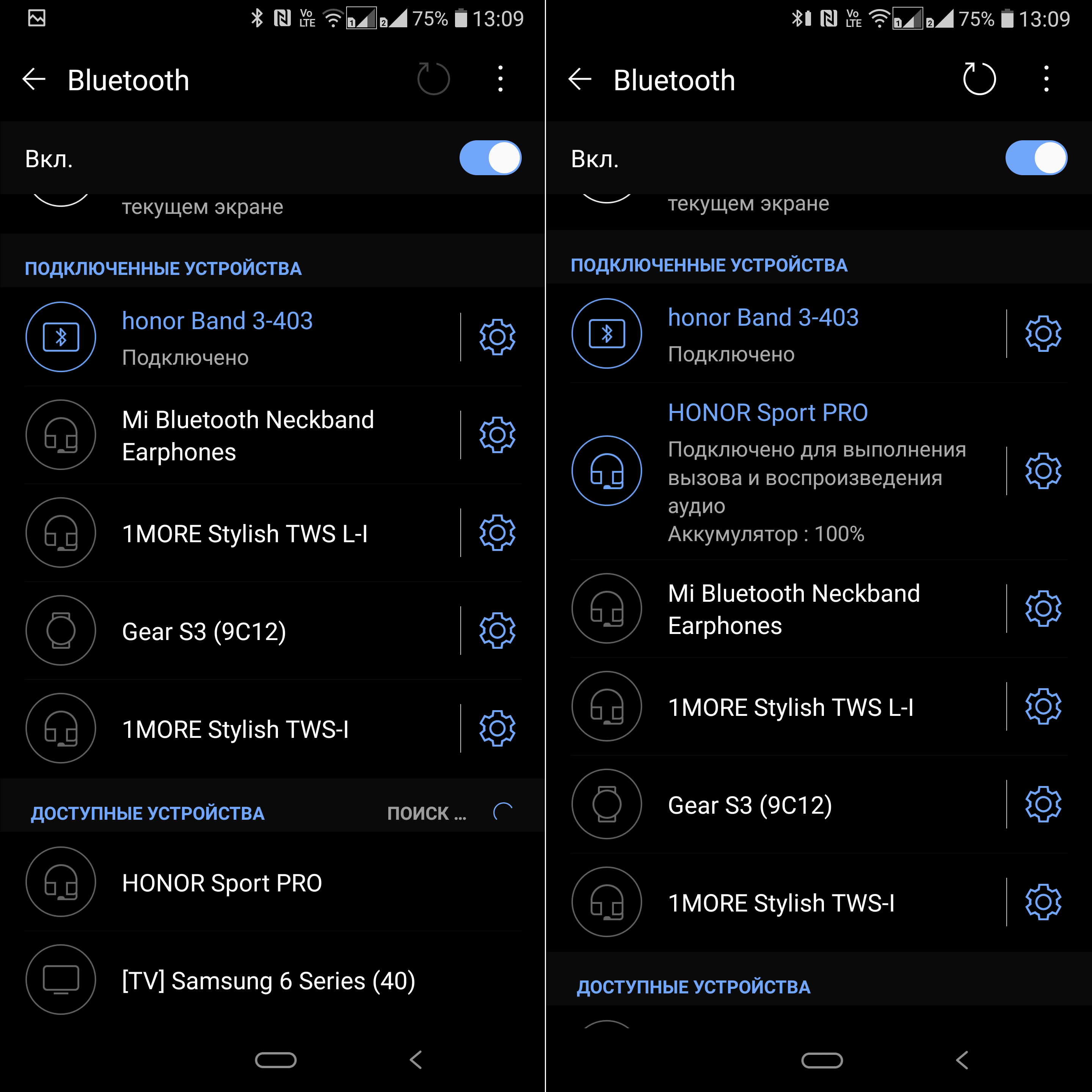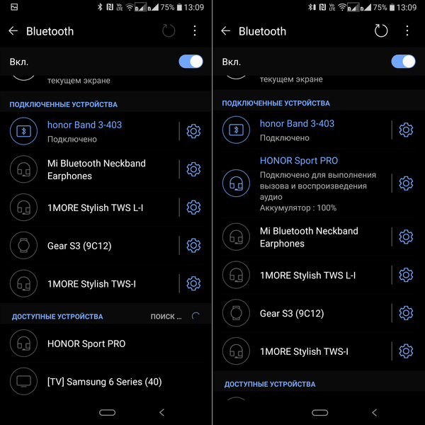 Переподключение знакомого устройства к гаджету занимает крайне немного времени — порядка 3 секунд. В данном случае это особенно важно, так как гарнитура выключается и разрывает связь при каждом соприкосновении магнитных держателей на наушниках. Соответственно, после их разъединения происходит повторная активация. В ходе реальной эксплуатации это редко замечаешь — обычно к моменту, когда оба наушника находятся в ушах, Honor Sport Pro уже полностью готова к работе.