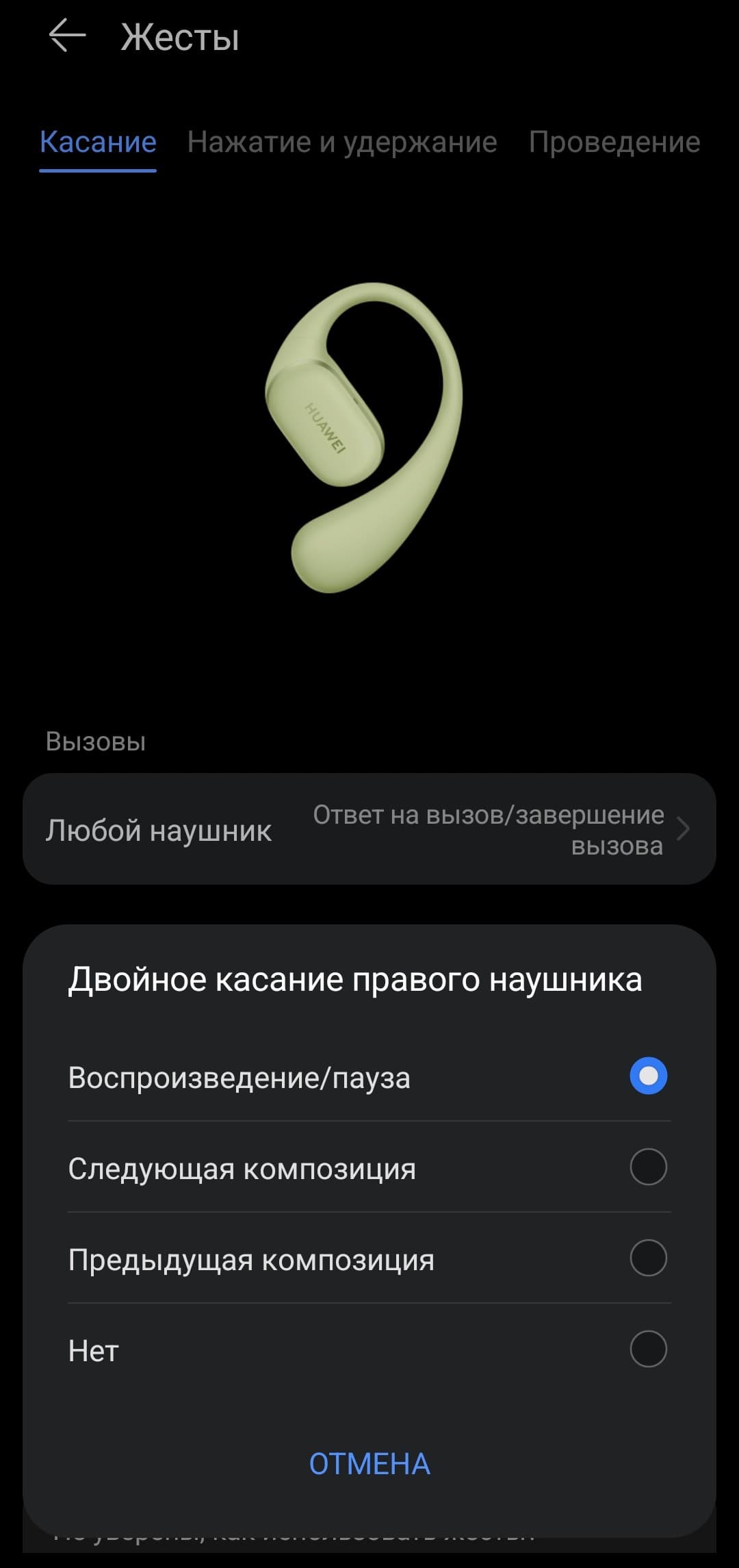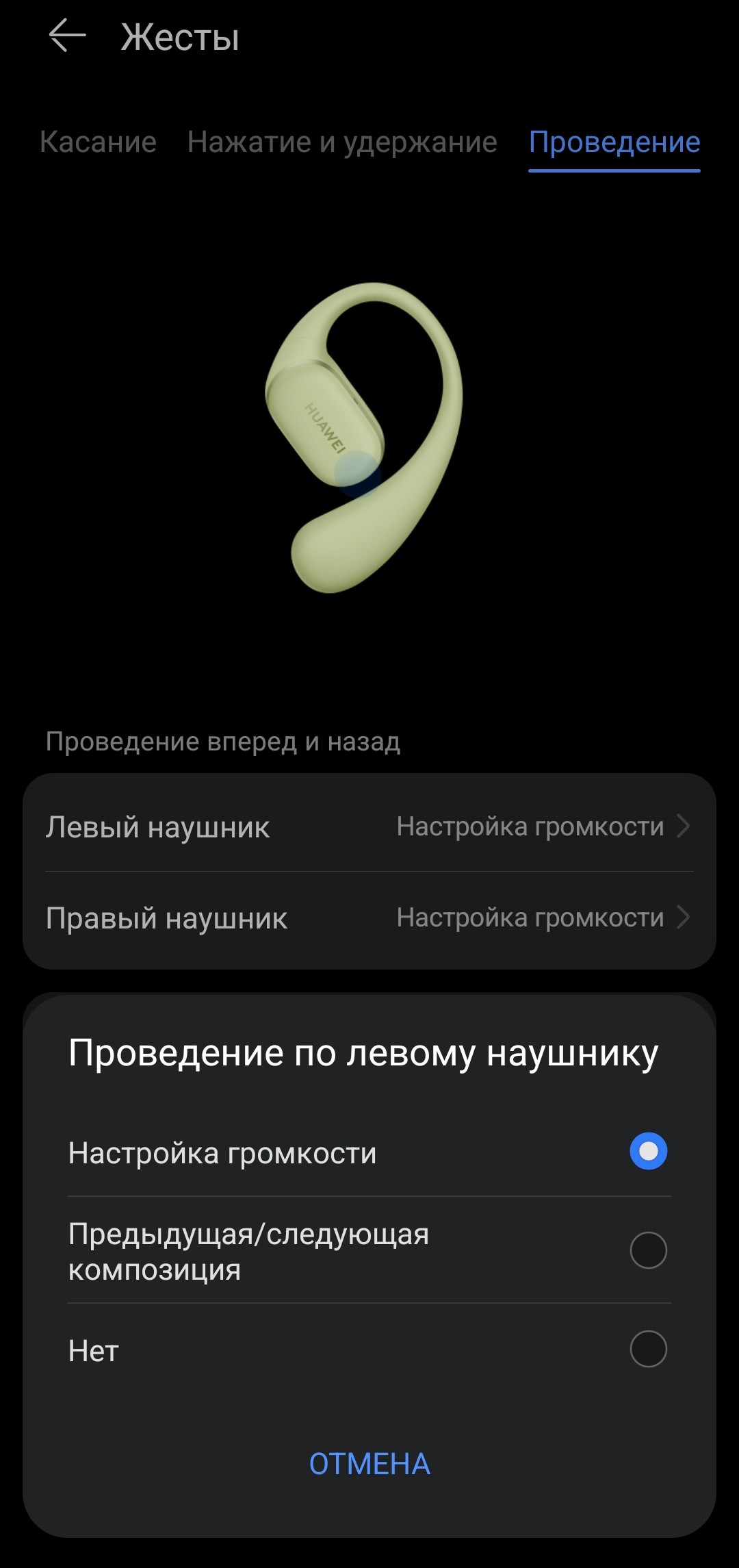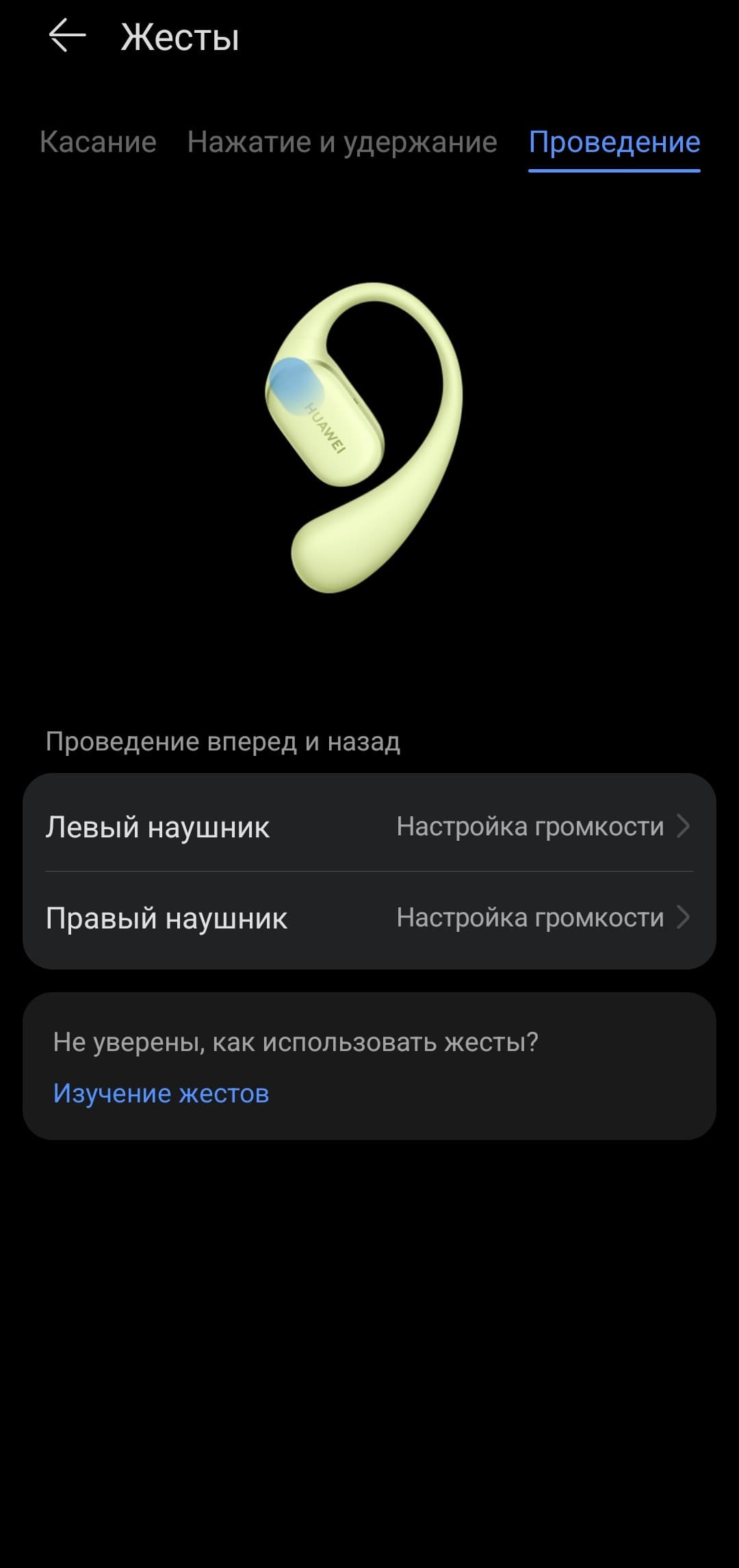 В общем, профиль управления логичный и удобный, но вариантов его настройки хотелось бы немного побольше. А вот что однозначно радует, так это возможность управления громкостью — во время пробежки или тренировки особенно неудобно доставать смартфон из кармана, чтобы это сделать. Наушники без этой опции мы точно не готовы считать ориентированными на использование во время спортивных активностей — хорошо, что у Huawei FreeArc она есть.