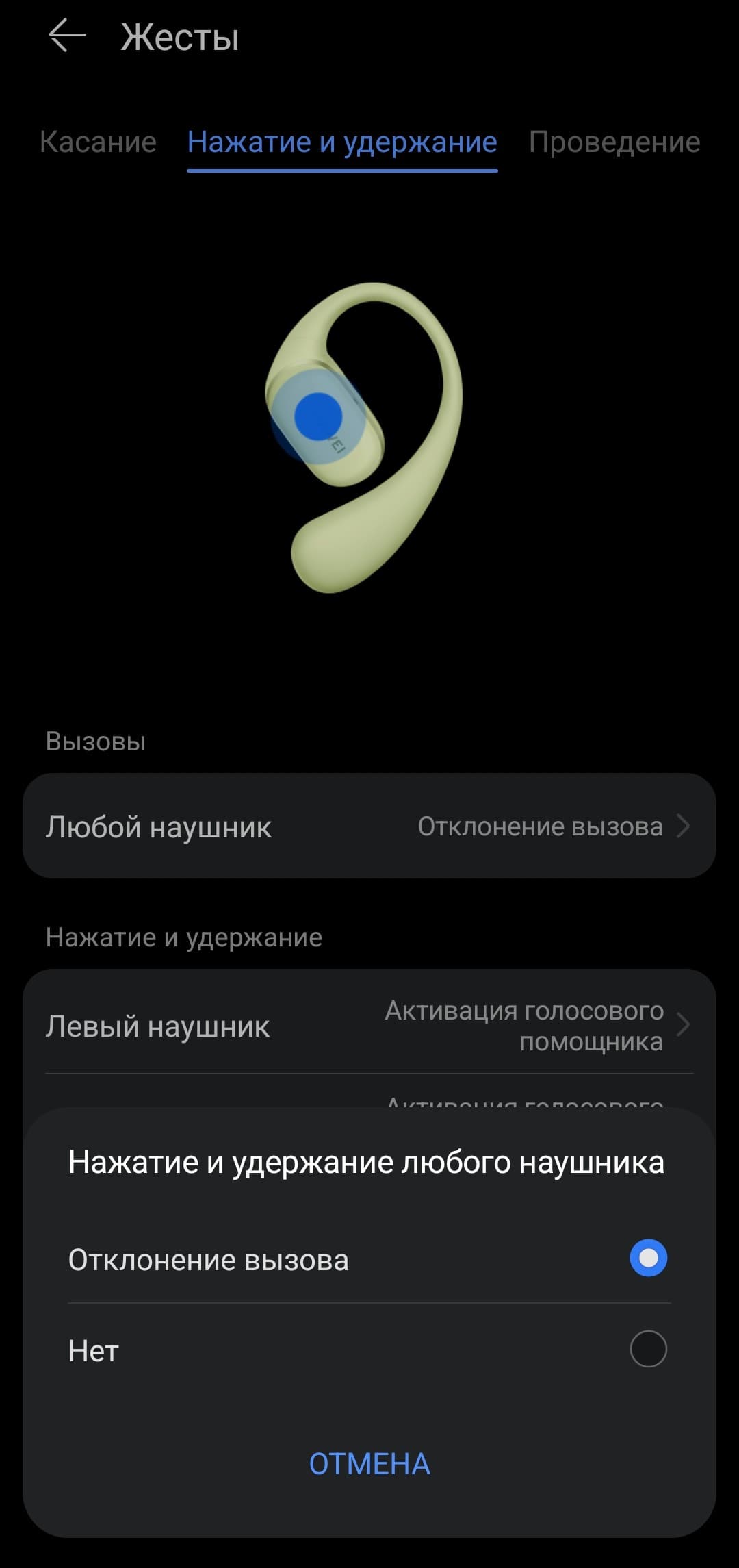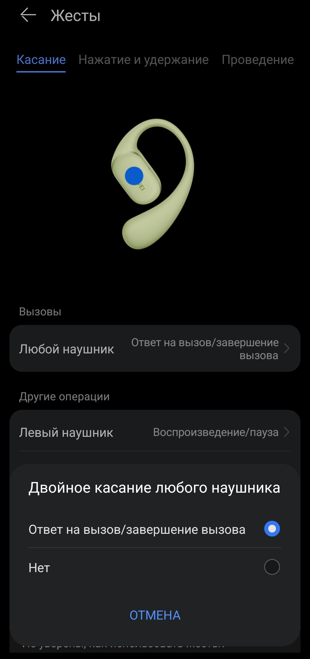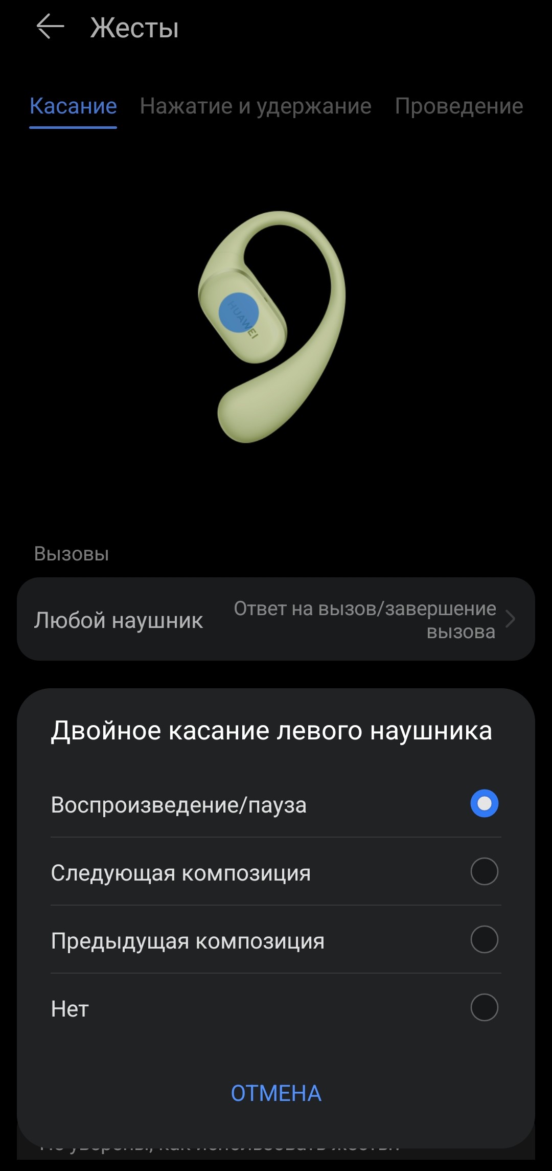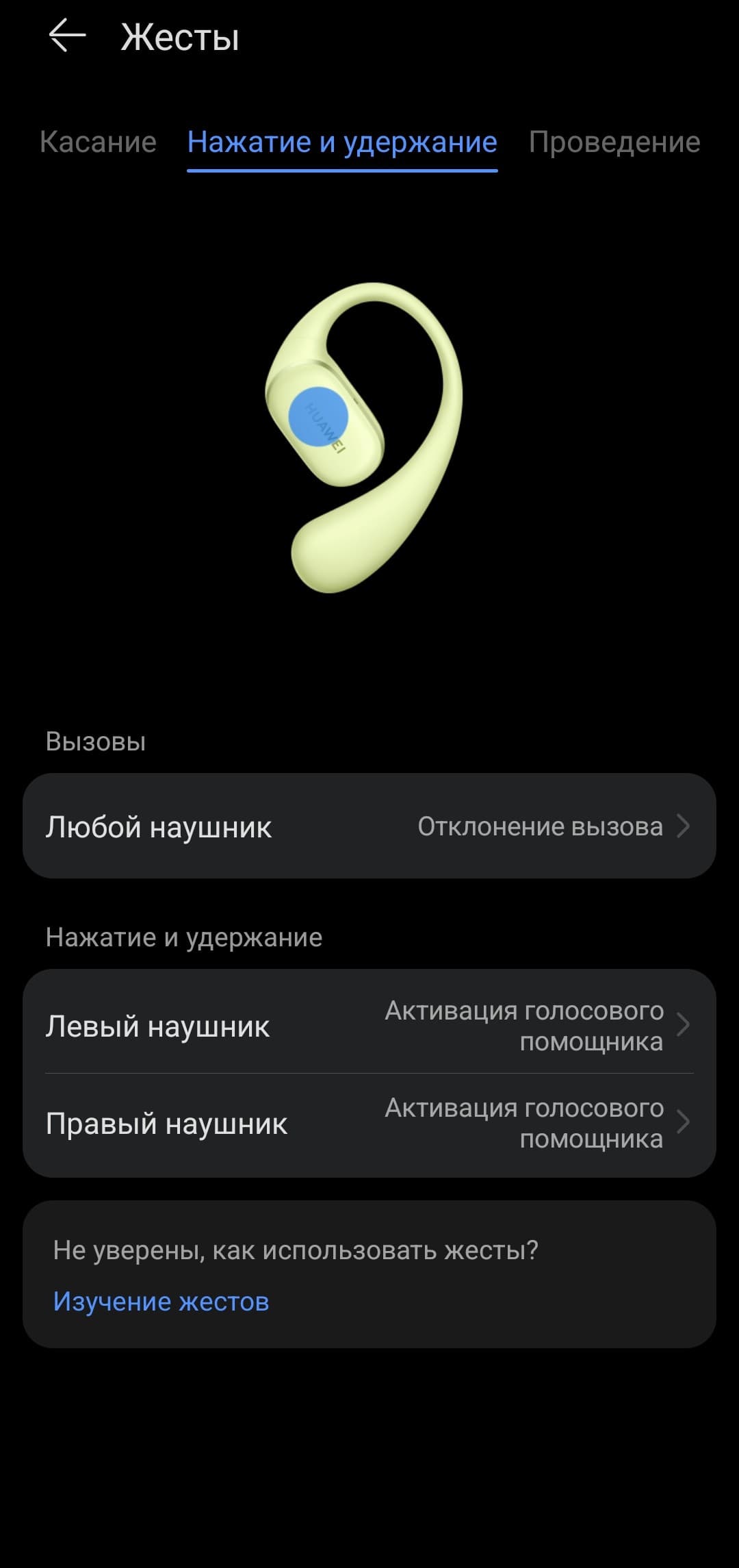 Профиль управления настраивается из приложения, но большого пространства для творчества там нет — тройное касание может управлять перелистыванием треков или не делать вообще ничего. Зато на длинное можно «повесить» активацию голосового ассистента, а уж с его помощью делать всё необходимое.