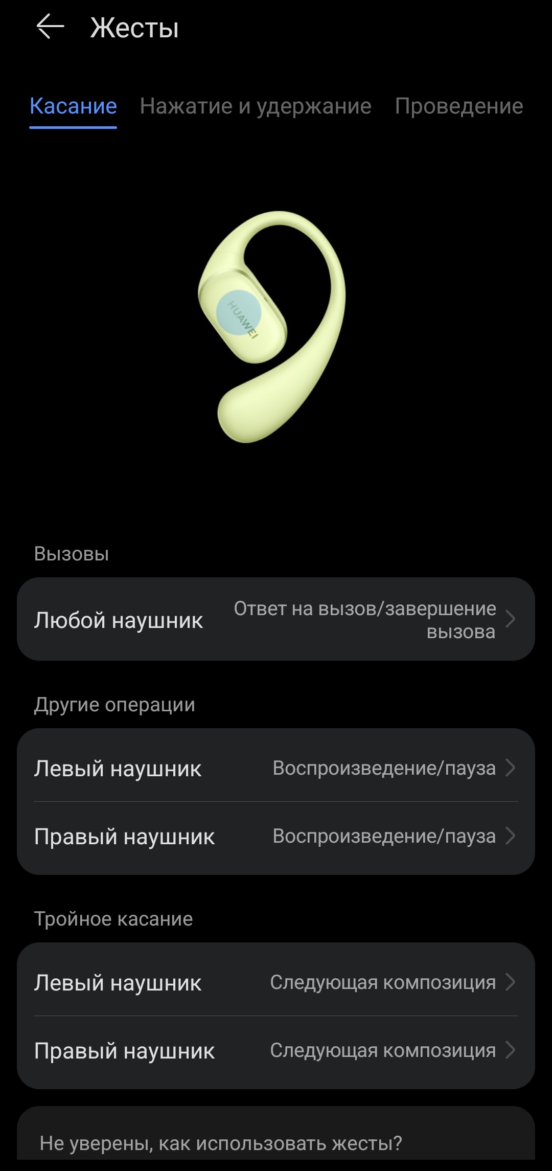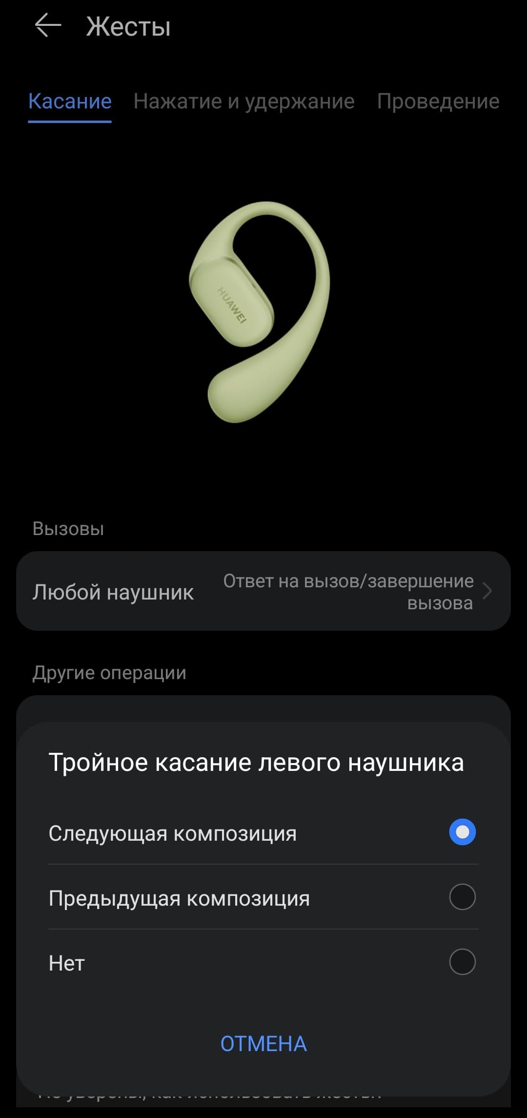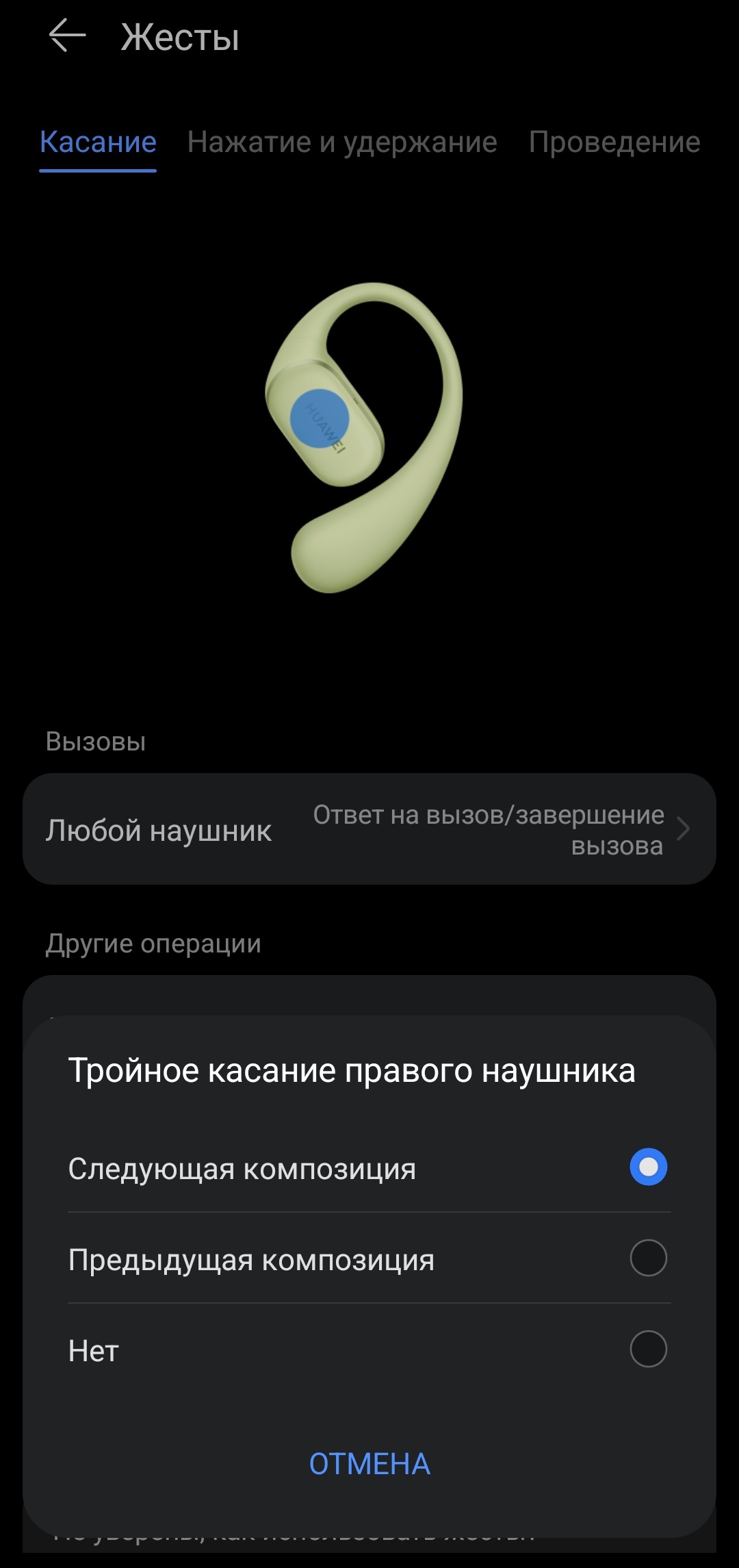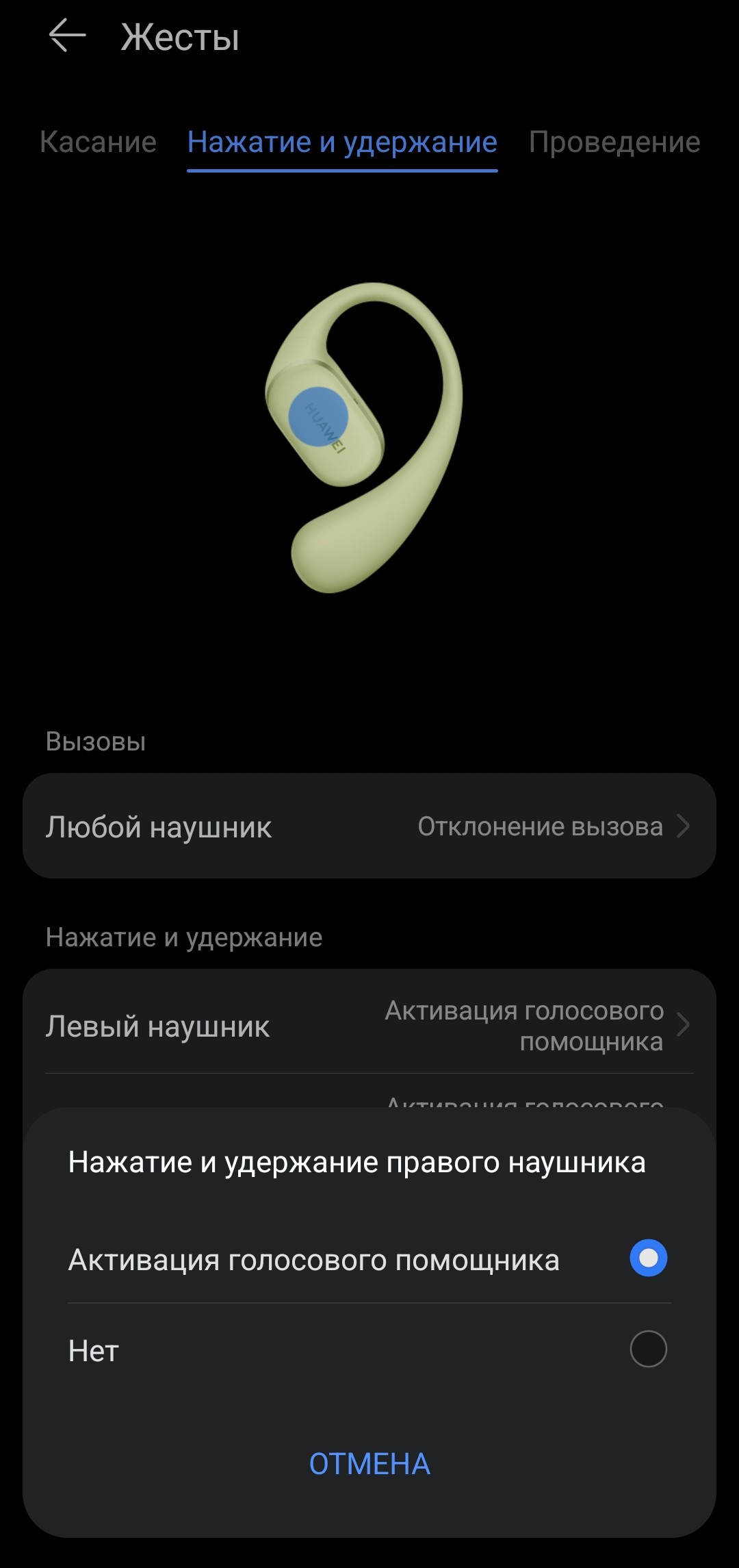 Профиль управления настраивается из приложения, но большого пространства для творчества там нет — тройное касание может управлять перелистыванием треков или не делать вообще ничего. Зато на длинное можно «повесить» активацию голосового ассистента, а уж с его помощью делать всё необходимое.