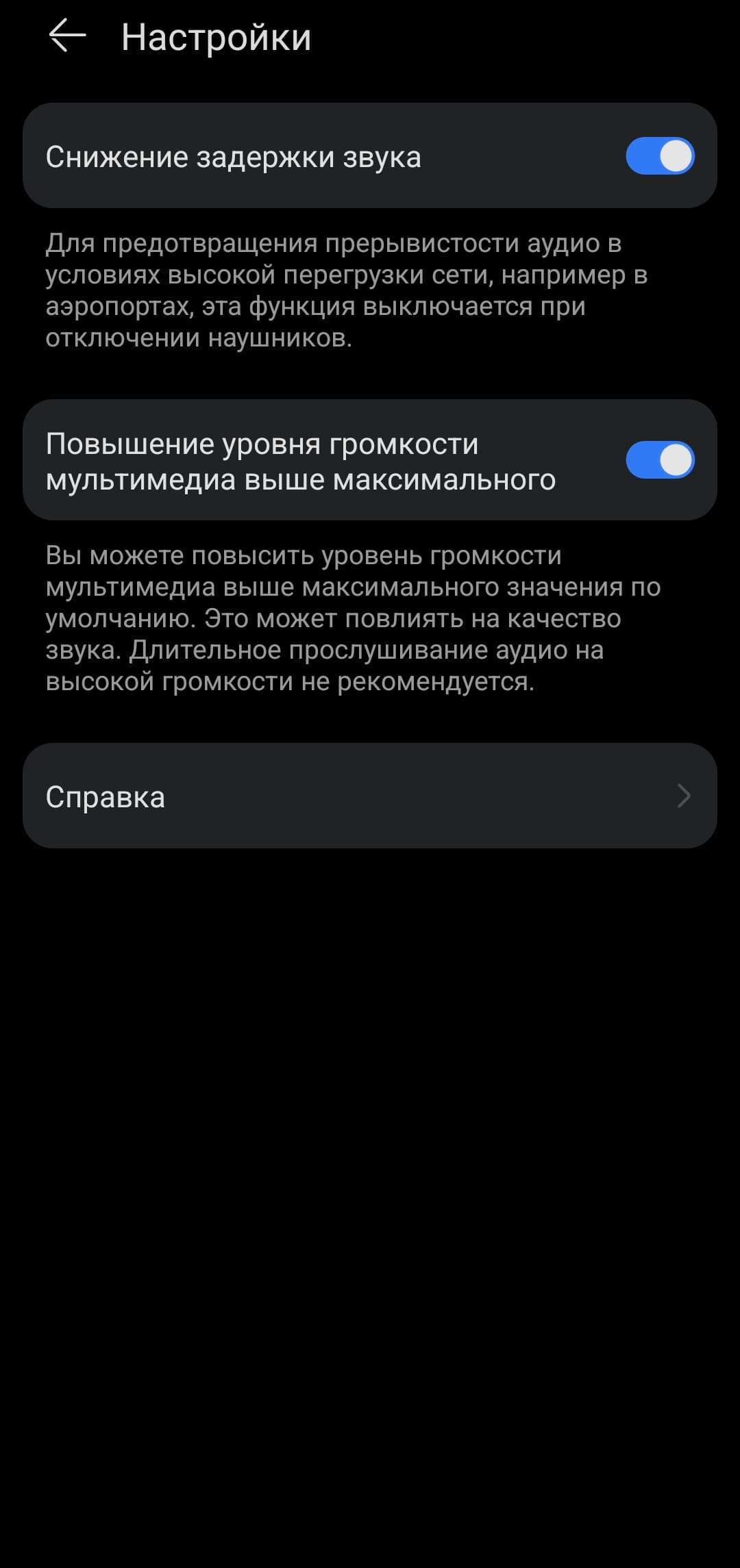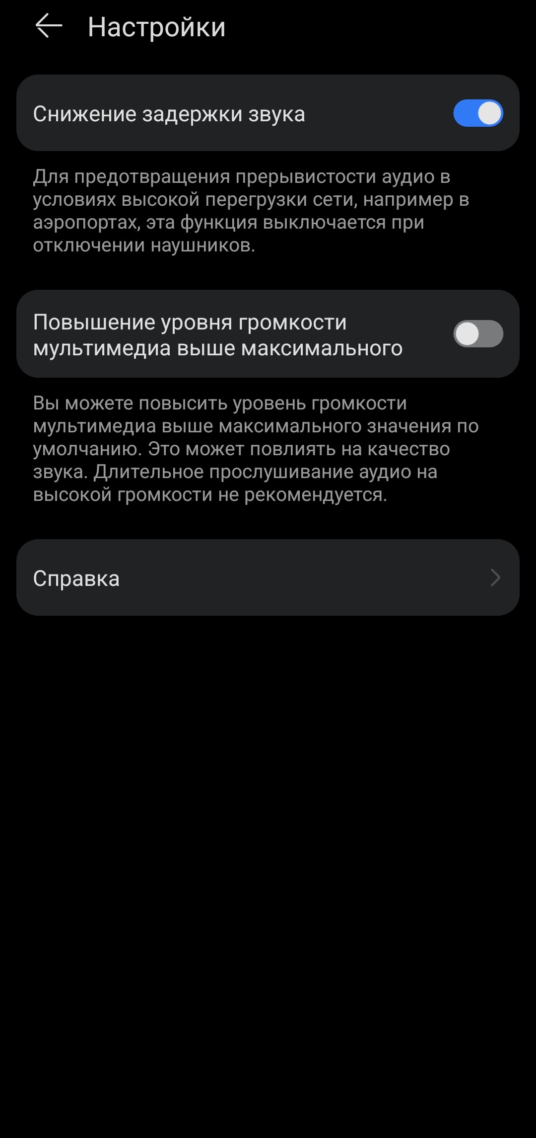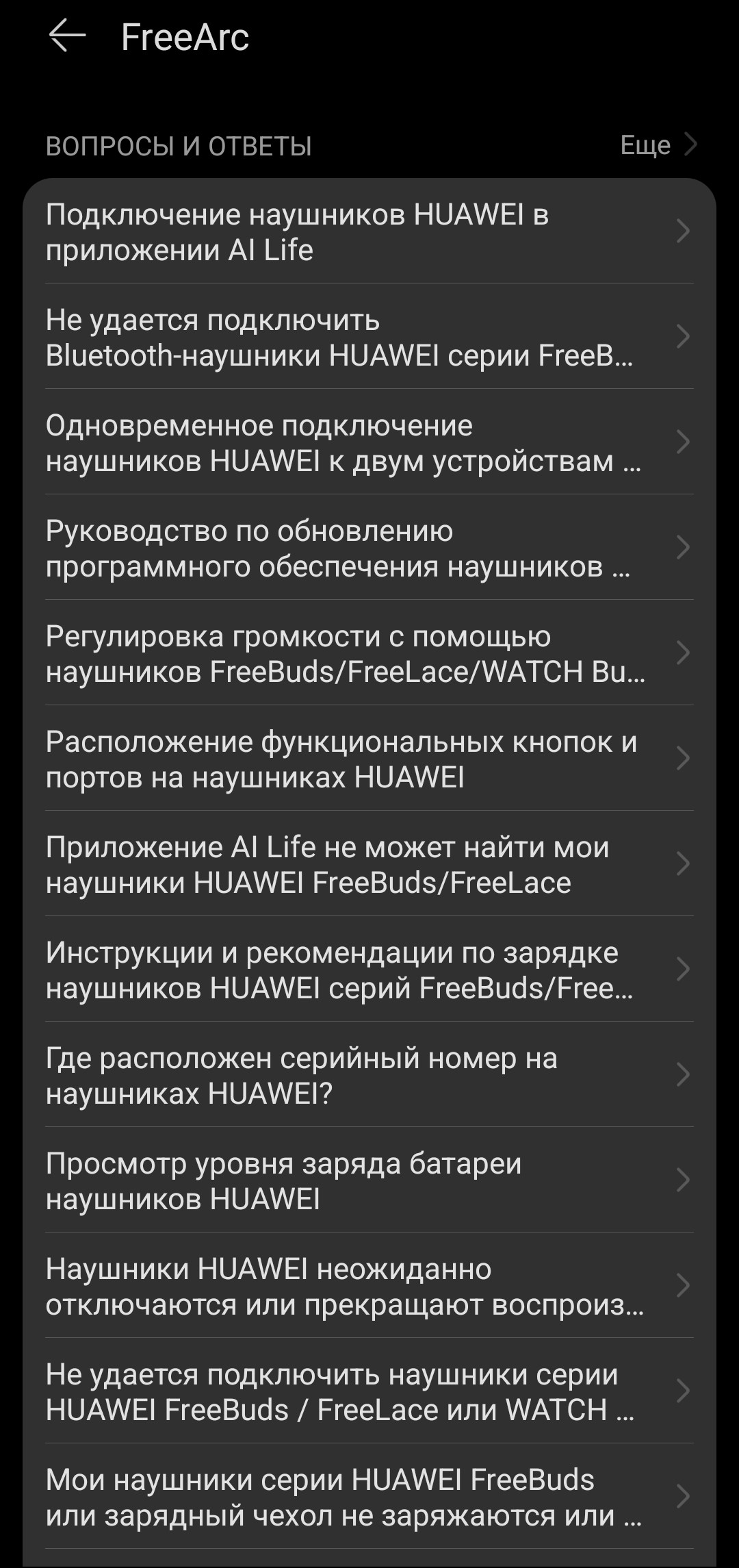 Также приложение позволяет активировать режим снижения задержки звука, повысить максимальный уровень громкости и прочитать ответы на самые распространенные вопросы, касающиеся использования наушников Huawei — этот раздел универсален и предлагается в неизменном виде для всех устройств производителя.