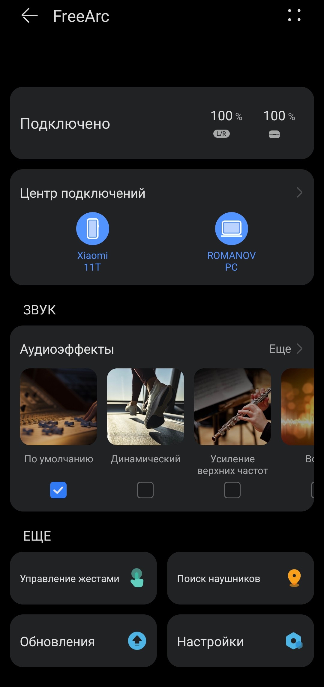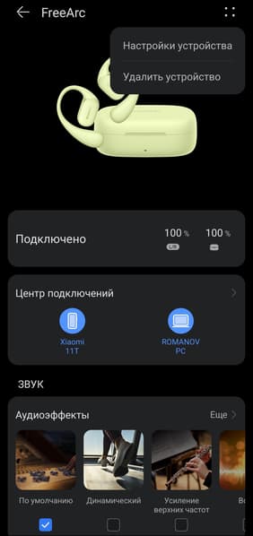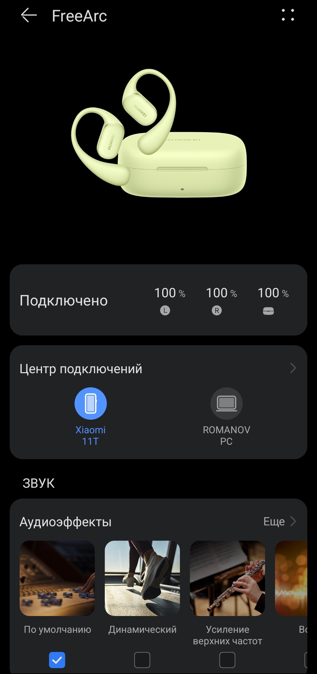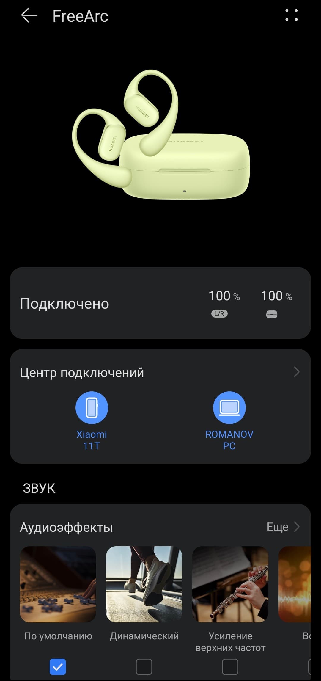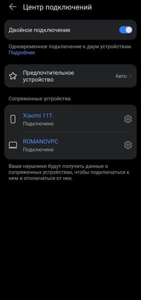 Практически по центру экрана расположен модуль управления подключениями, который мы без устали хвалим у всех аудиоустройств Huawei — более удобной реализации мультипойнта мы пока не встречали. Очень радует, что целый ряд других производителей пошел примерно в том же направлении. Подключенные источники можно отключать и подключать, выбирать приоритетные, активировать или отключать автоподключение. Полный список подключений выглядит излишеством, пока сопряженных устройств всего два. Но как только в него добавляются ноутбук для путешествий, мобильная игровая консоль, телевизор и пр., возможность управлять ими очень пригождается.