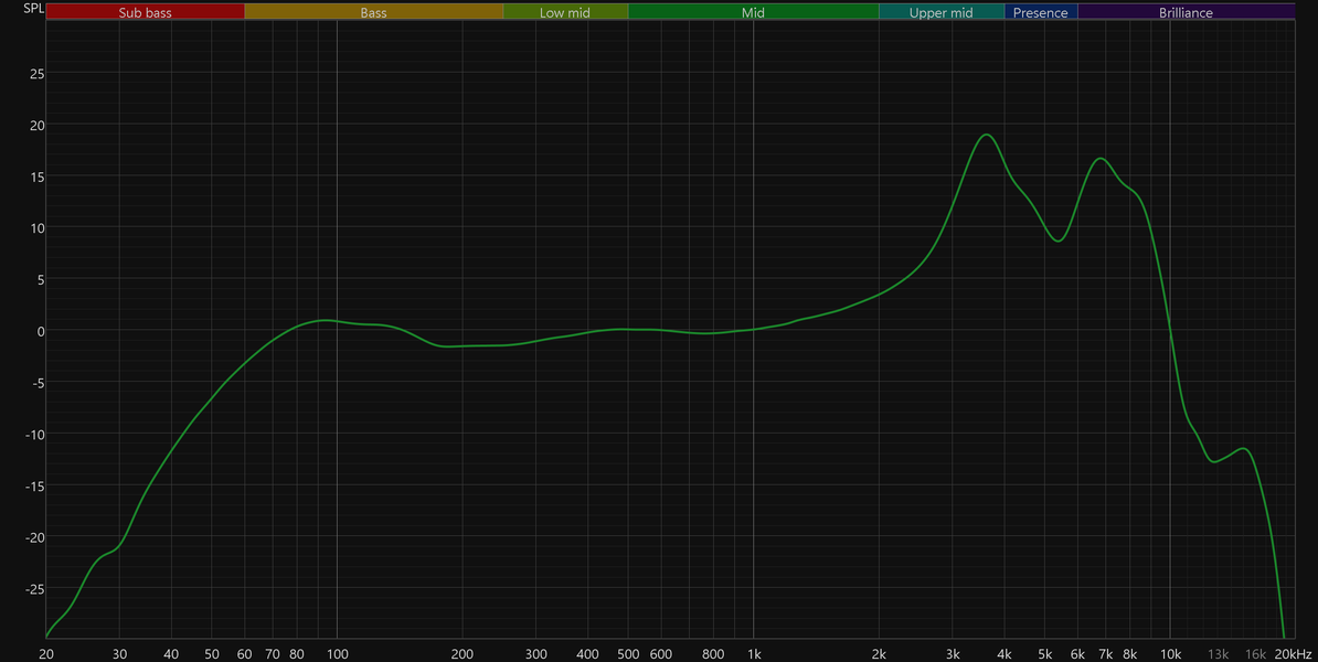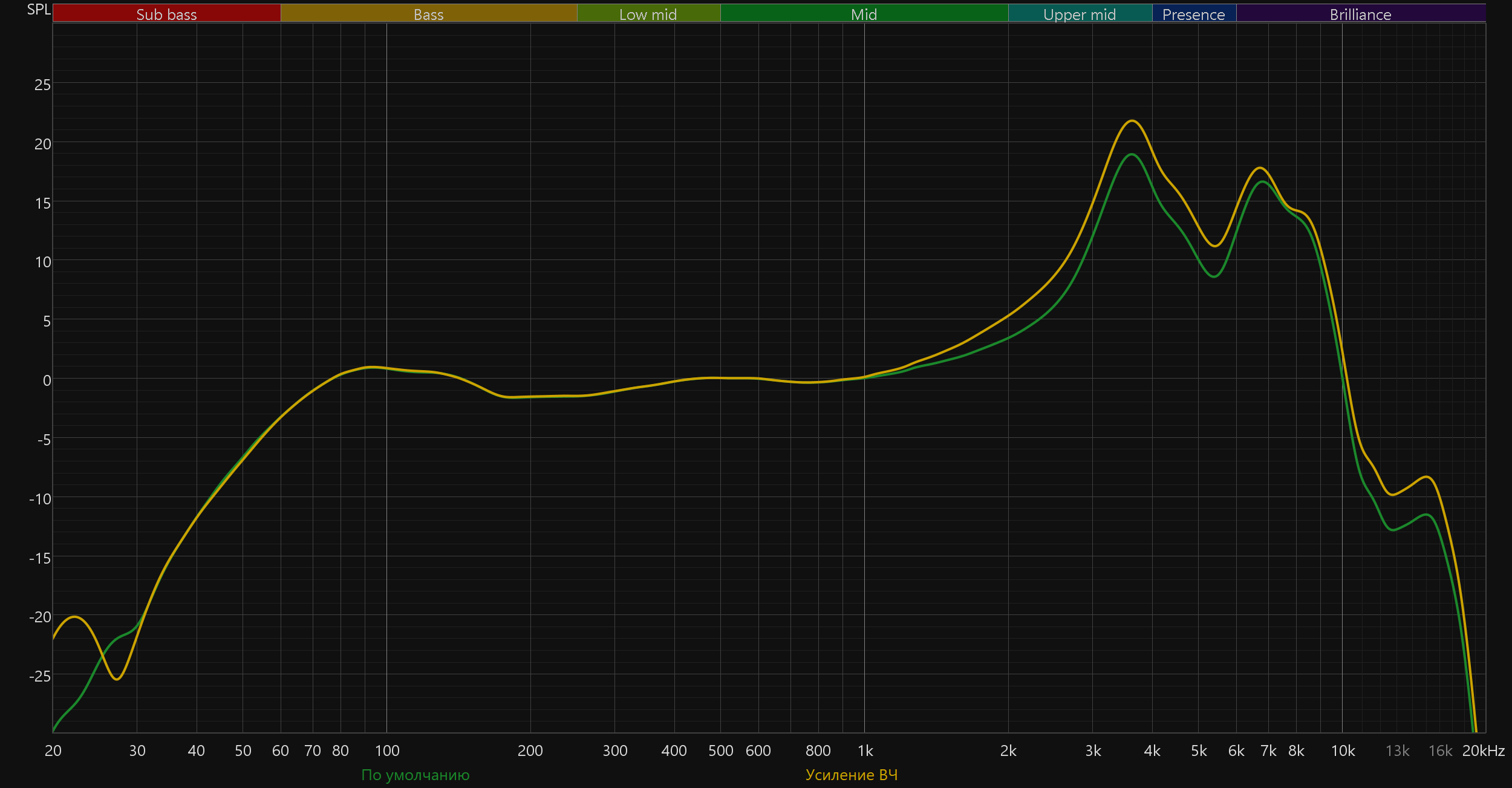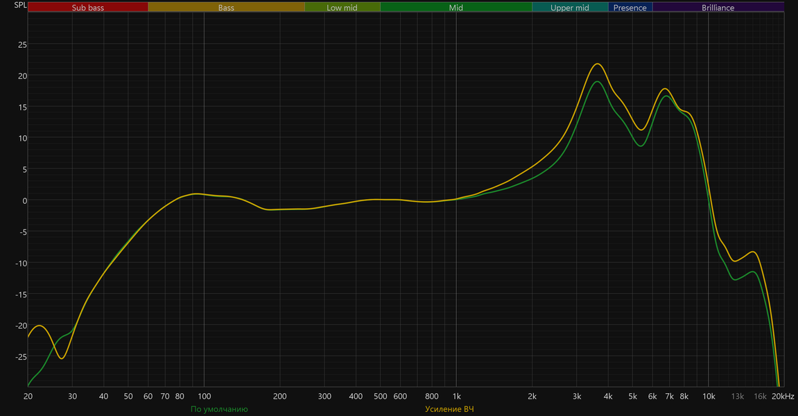 Нижняя середина и непосредственно СЧ-диапазон подаются на удивление ровно и детализированно, что обеспечивает нейтральную передачу вокала и инструментов. Но без спорных особенностей всё же не обошлось: пик в районе 6-7 кГц может усиливать сибилянты и придавать звучанию излишнюю резкость, особенно на женском вокале и тарелках. Есть, конечно, и потенциально позитивные эффекты — такой подъем повышает четкость и разборчивость речи, подчеркивает атаки звуков и добавляет ощущение детальности, особенно в миксах с приглушенной верхней серединой.
