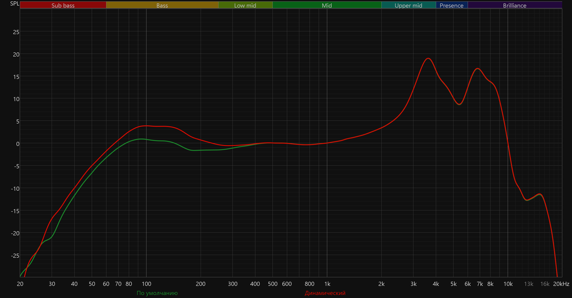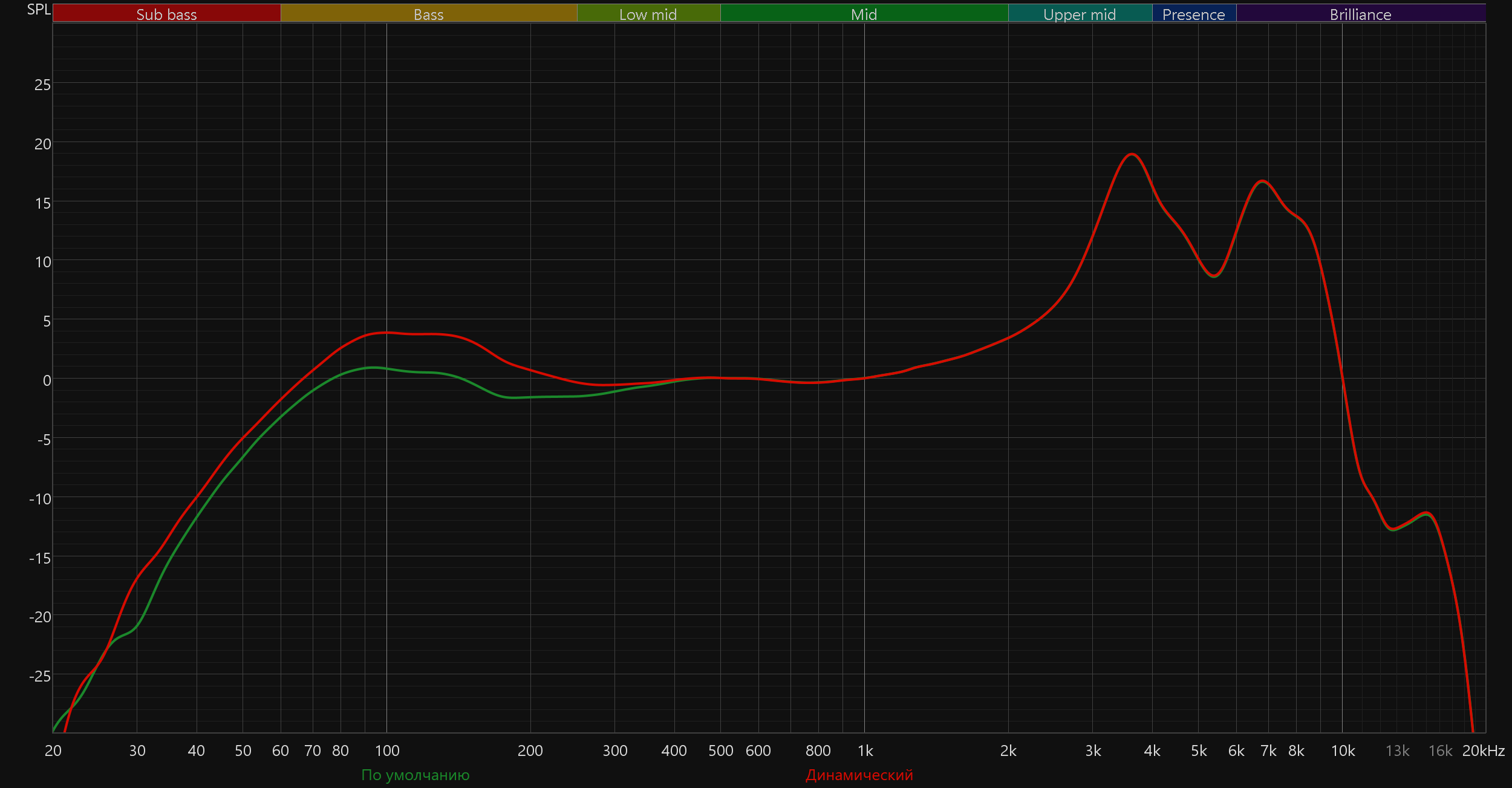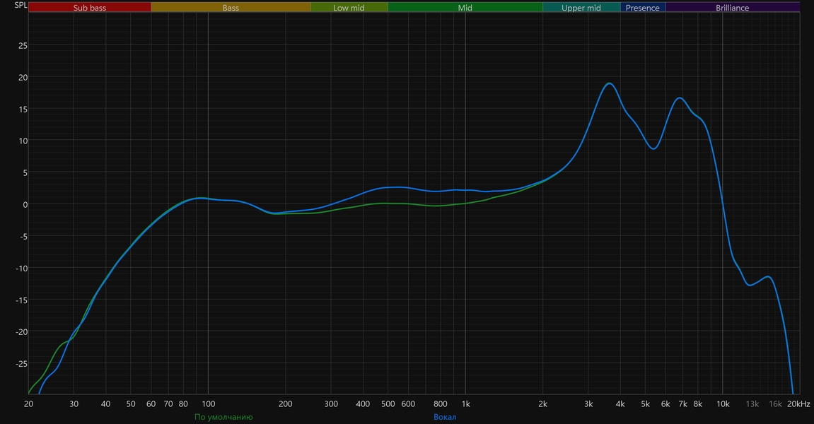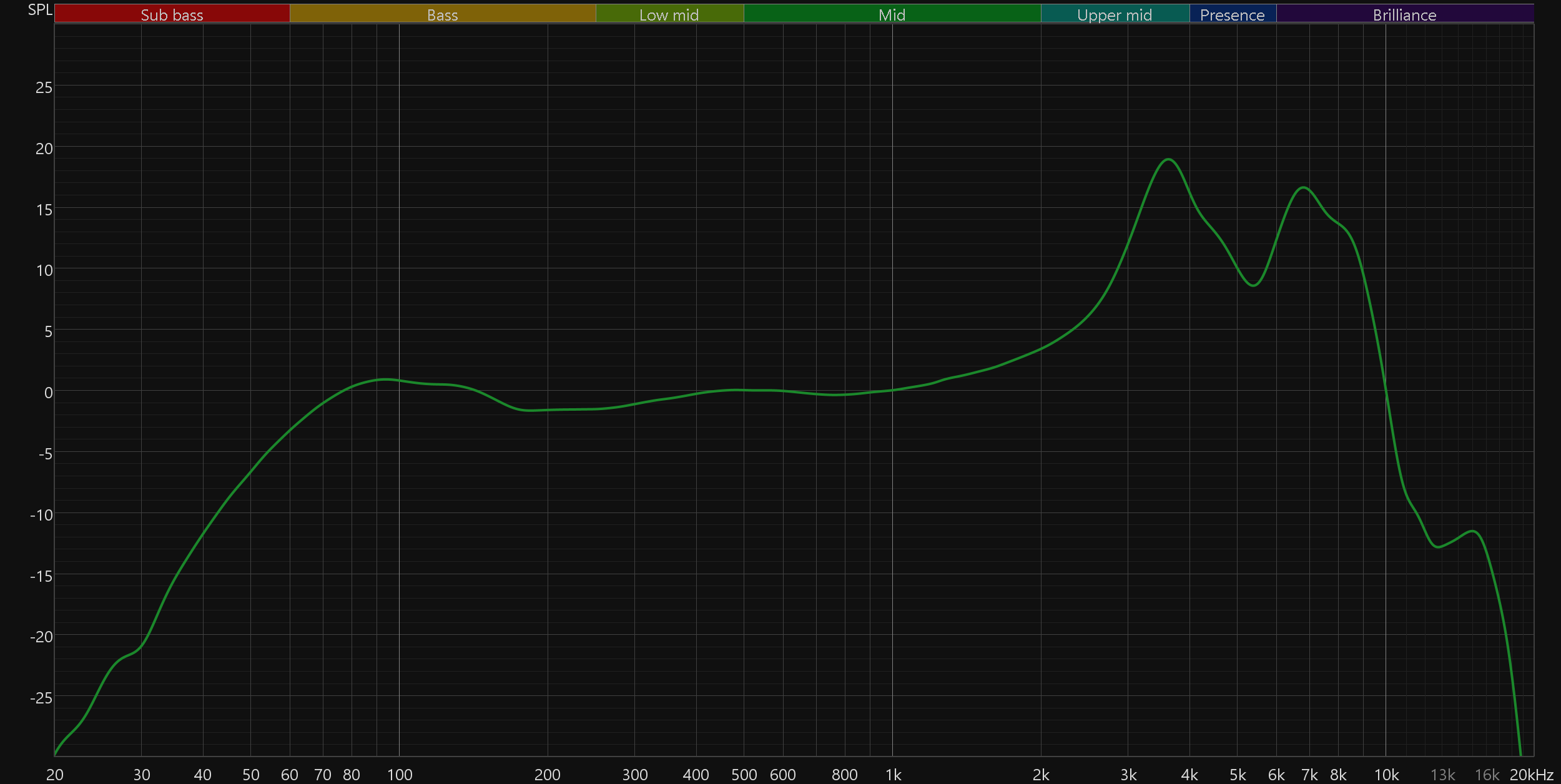 Нижняя середина и непосредственно СЧ-диапазон подаются на удивление ровно и детализированно, что обеспечивает нейтральную передачу вокала и инструментов. Но без спорных особенностей всё же не обошлось: пик в районе 6-7 кГц может усиливать сибилянты и придавать звучанию излишнюю резкость, особенно на женском вокале и тарелках. Есть, конечно, и потенциально позитивные эффекты — такой подъем повышает четкость и разборчивость речи, подчеркивает атаки звуков и добавляет ощущение детальности, особенно в миксах с приглушенной верхней серединой.