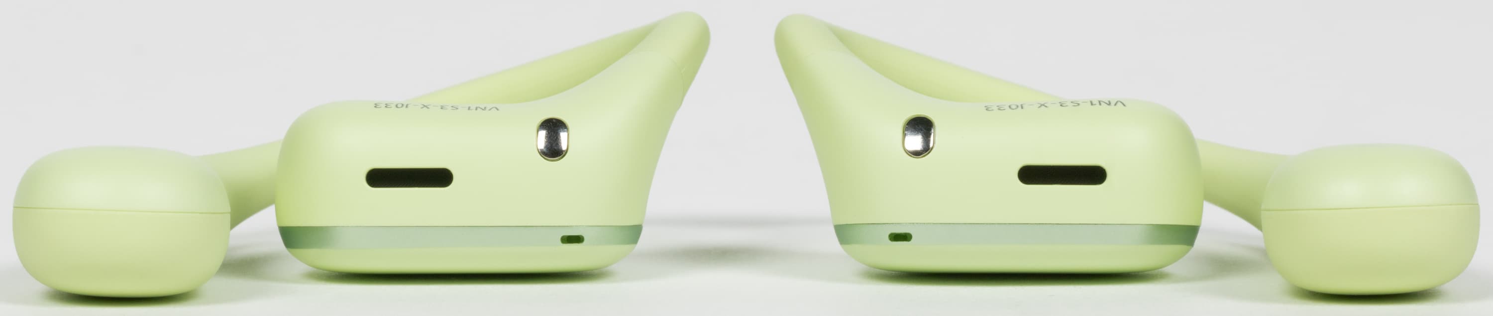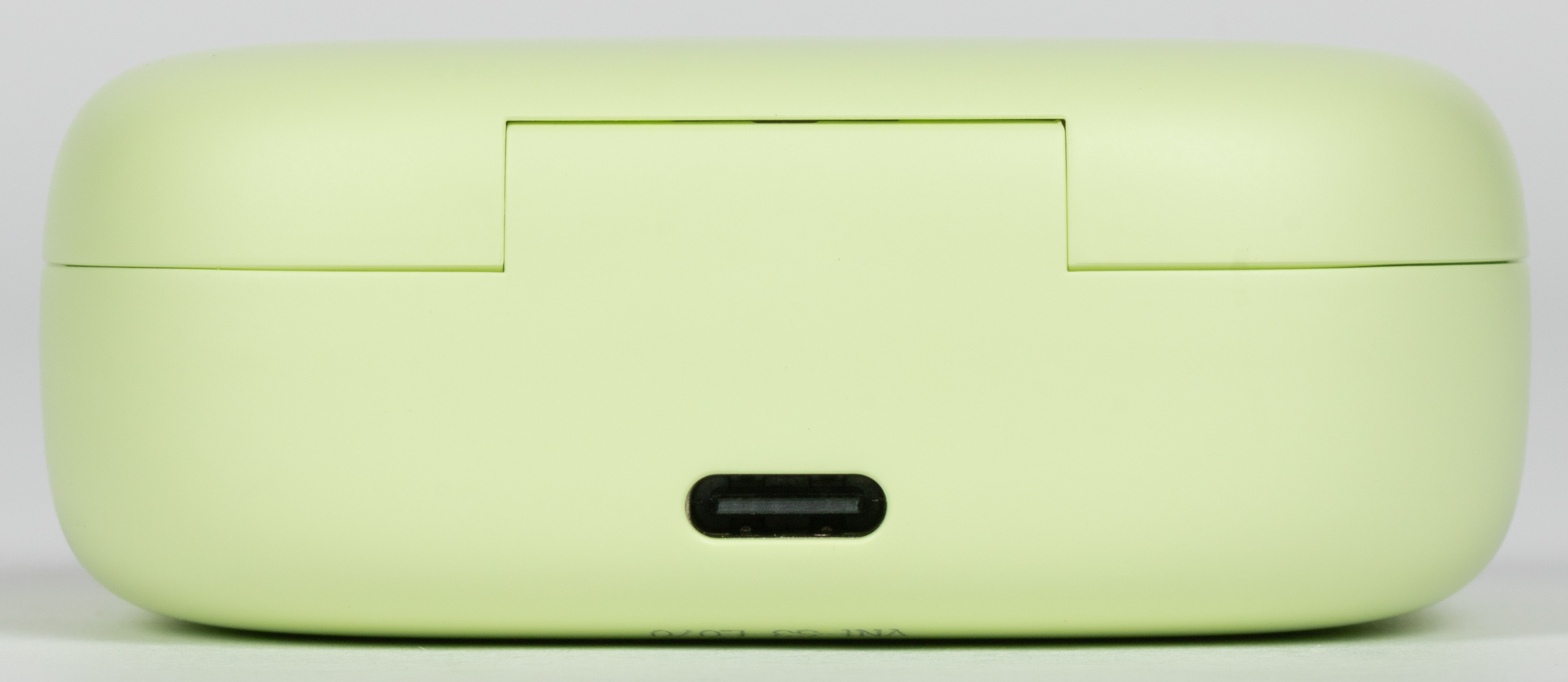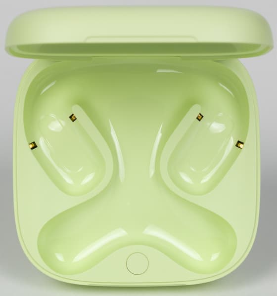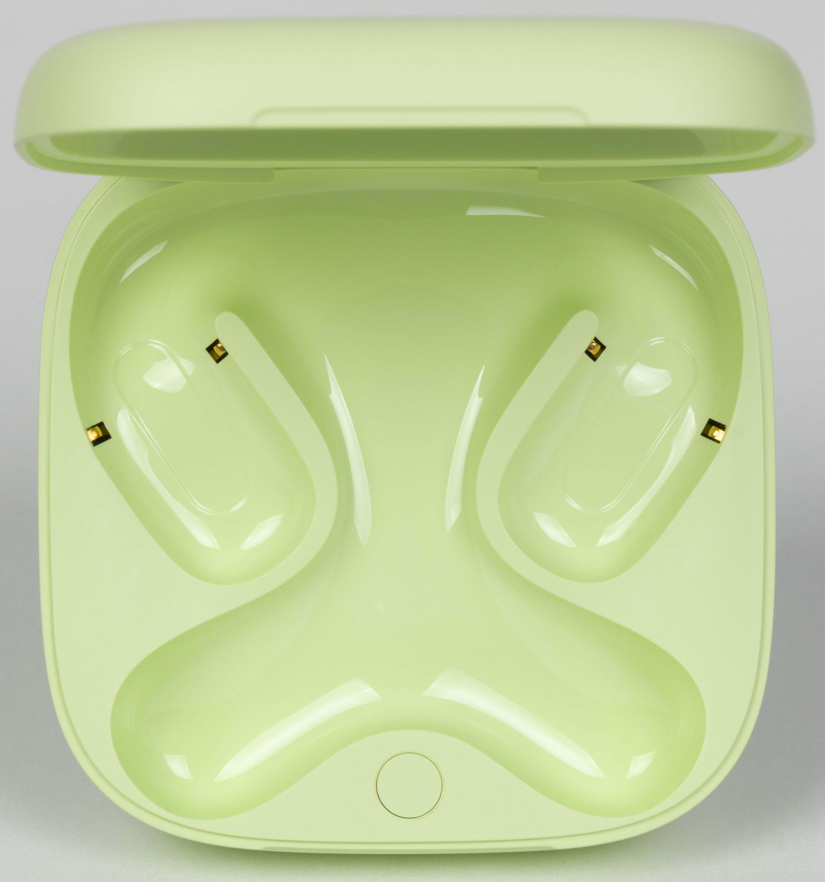 Внутри слотов для наушников видны подпружиненные контакты для зарядки. По центру снизу находится кнопка запуска режима сопряжения. Нажимается она с усилием сильно выше среднего и размещена заподлицо с поверхностью, что обеспечивает защиту от случайного нажатия.