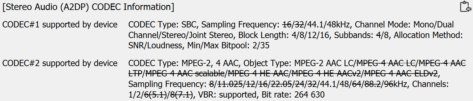Кодеков два — SBC и AAC. В данном случае их возможностей будет достаточно, но есть не очень приятный нюанс — максимум параметра Bitpool у SBC выставлен на уровне 35, тогда как рекомендованный профиль High Quality подразумевает значение 51. Так что работать он будет далеко не на максимуме своих возможностей. Потому лучше использовать AAC, верхний порог битрейта которого ограничен на уровне 264 Кбит/с — даже чуть выше, чем стандартно используемые 256 Кбит/с.
